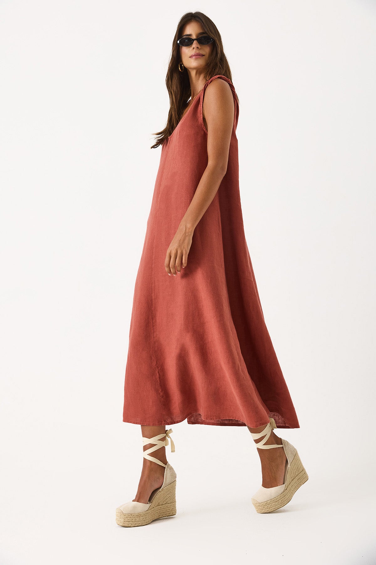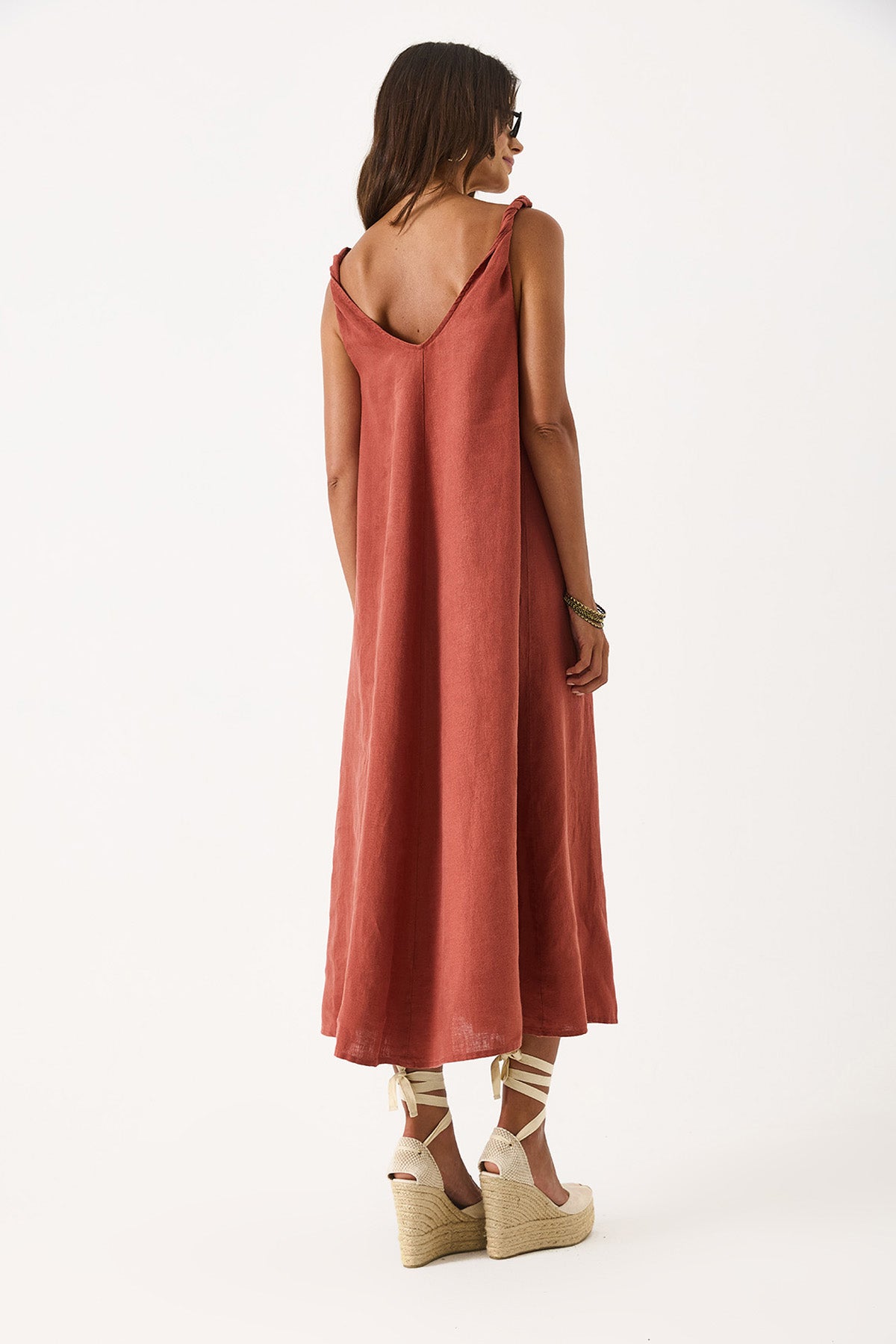 Kadın Burgu Askılı Elbise %100 Keten - Kiremit