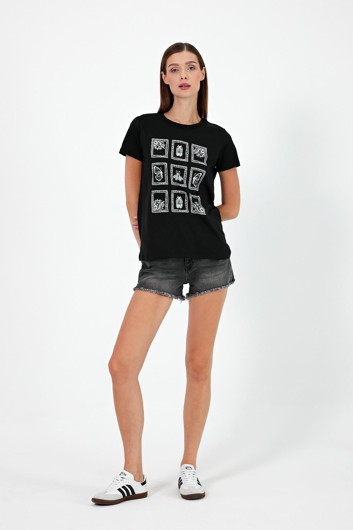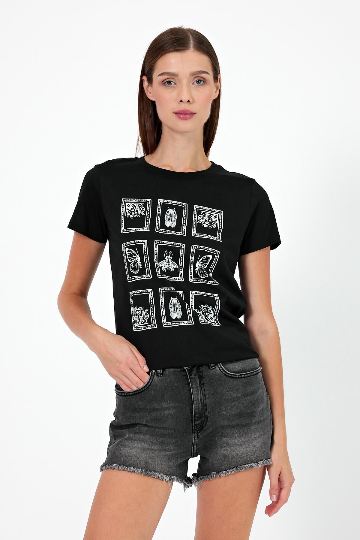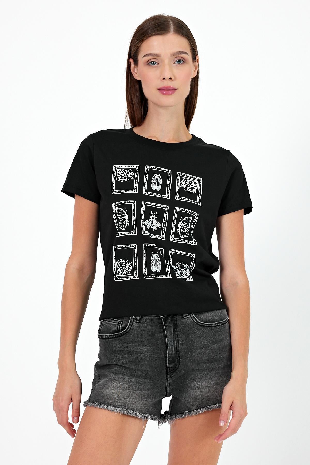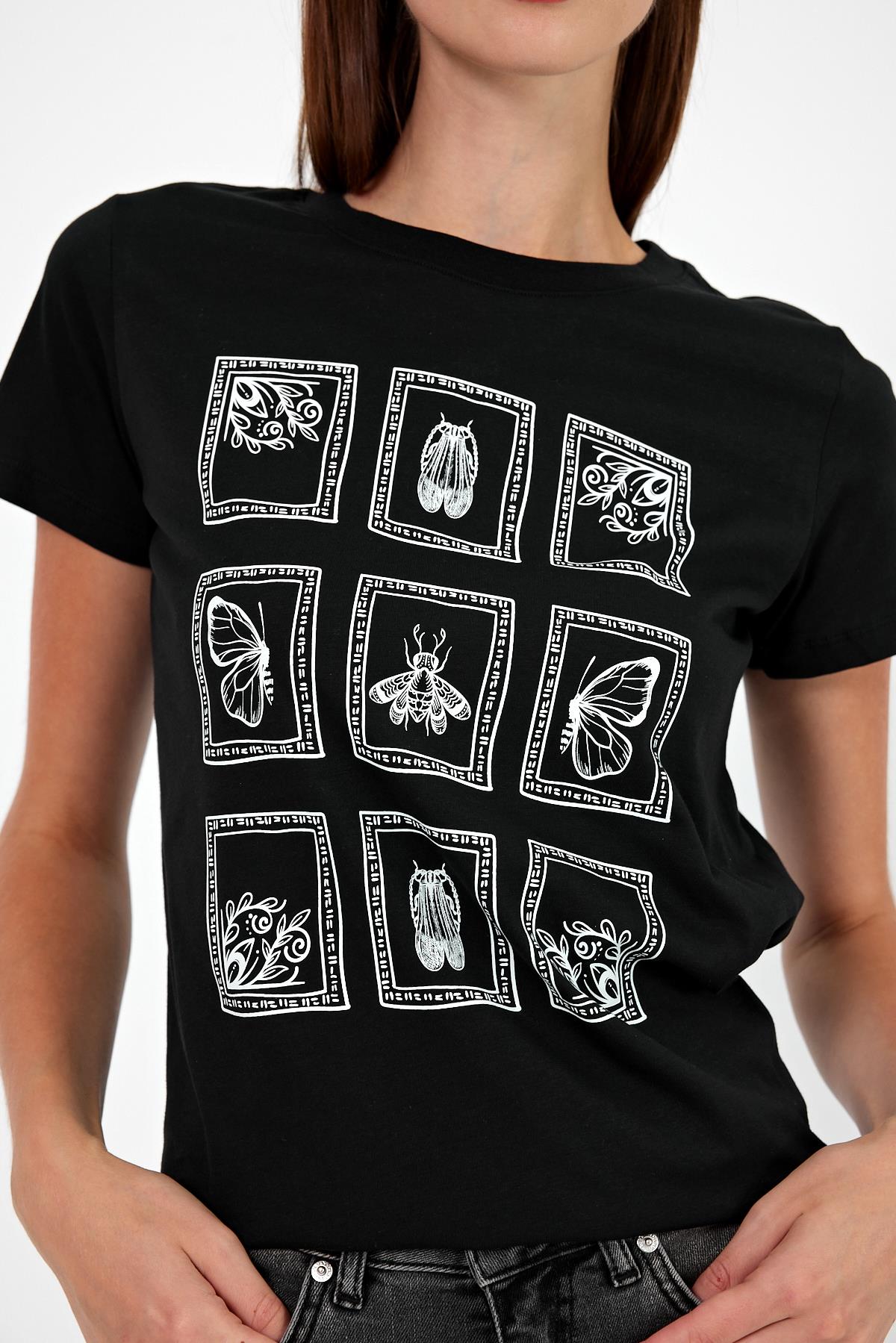 Kadın Butterfly Baskılı Bisiklet Yaka Regular Fit Tişört %100 Pamuk - Siyah