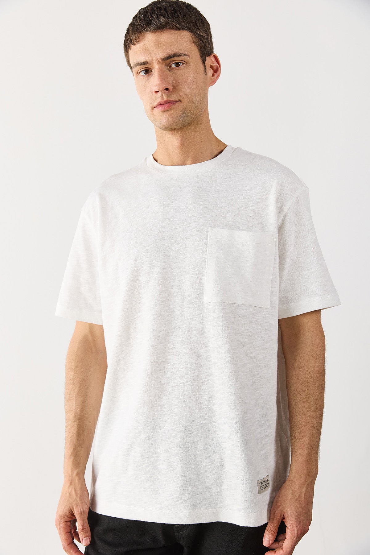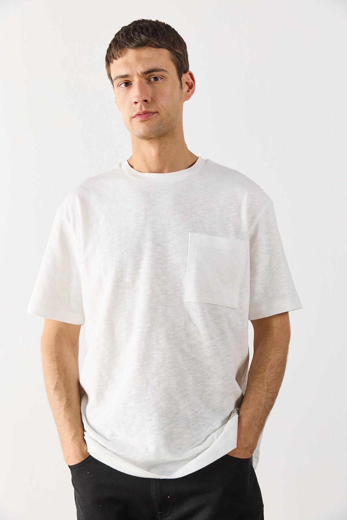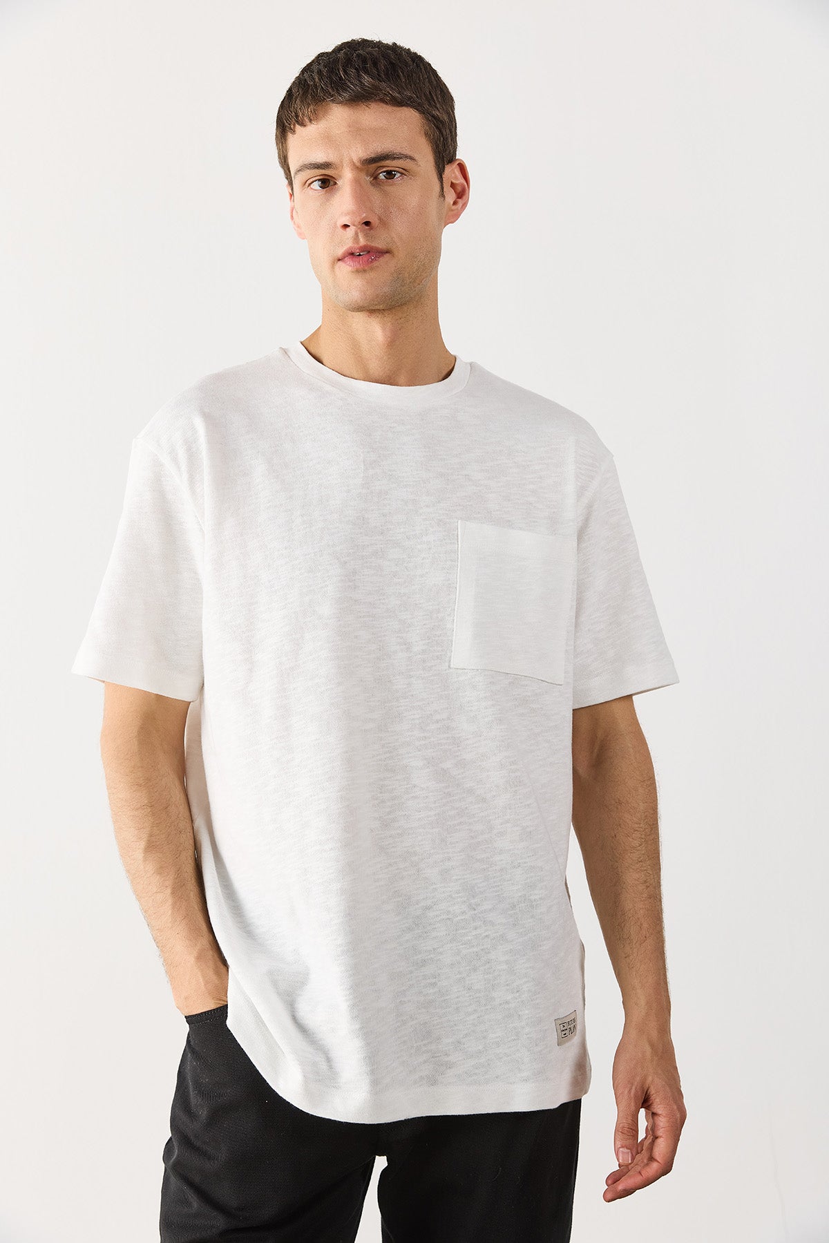 Erkek Cep Detaylı Bisiklet Yaka Flamlı Tişört %100 Pamuk - Fildişi