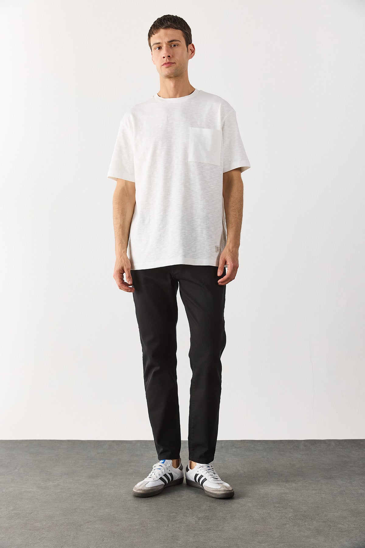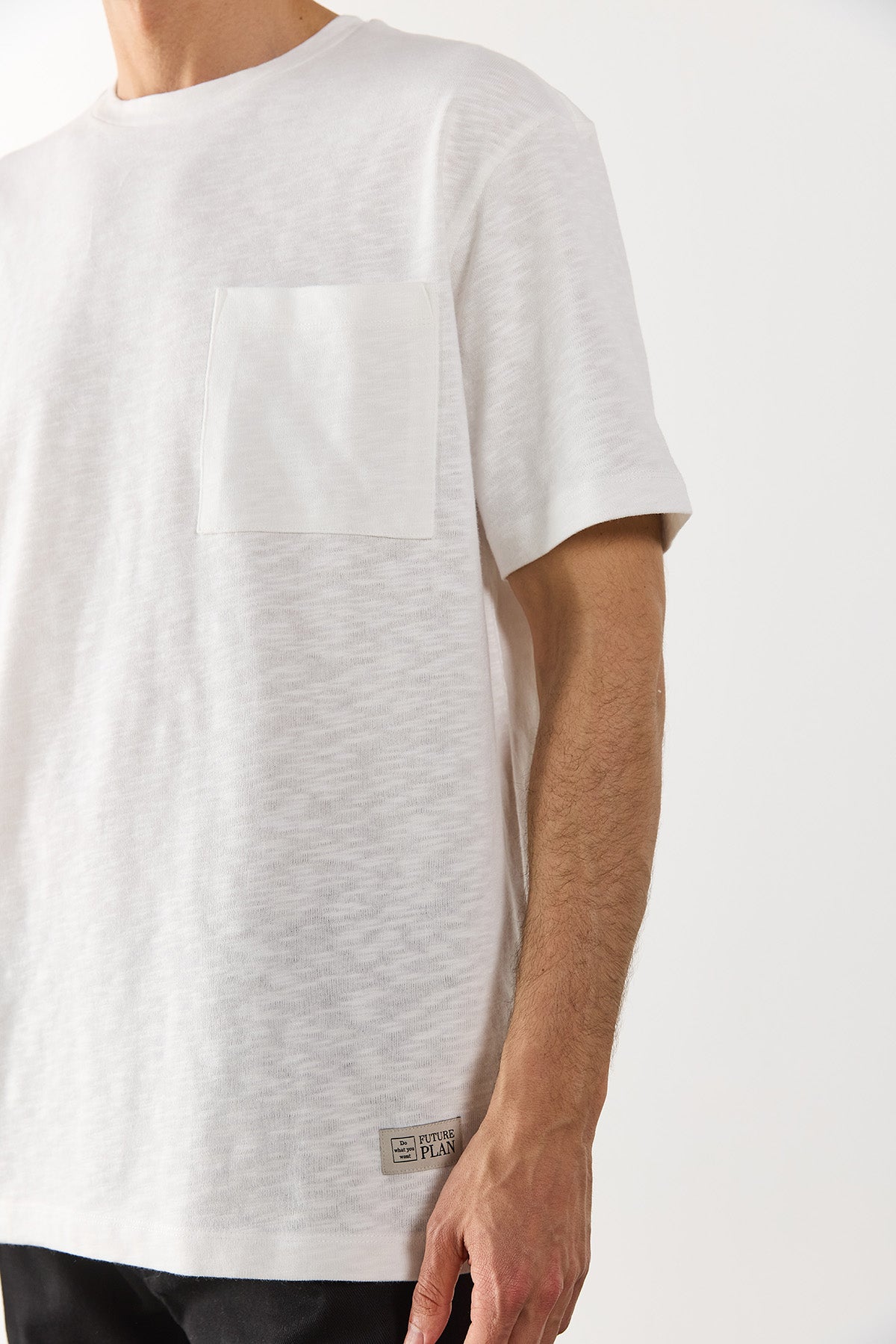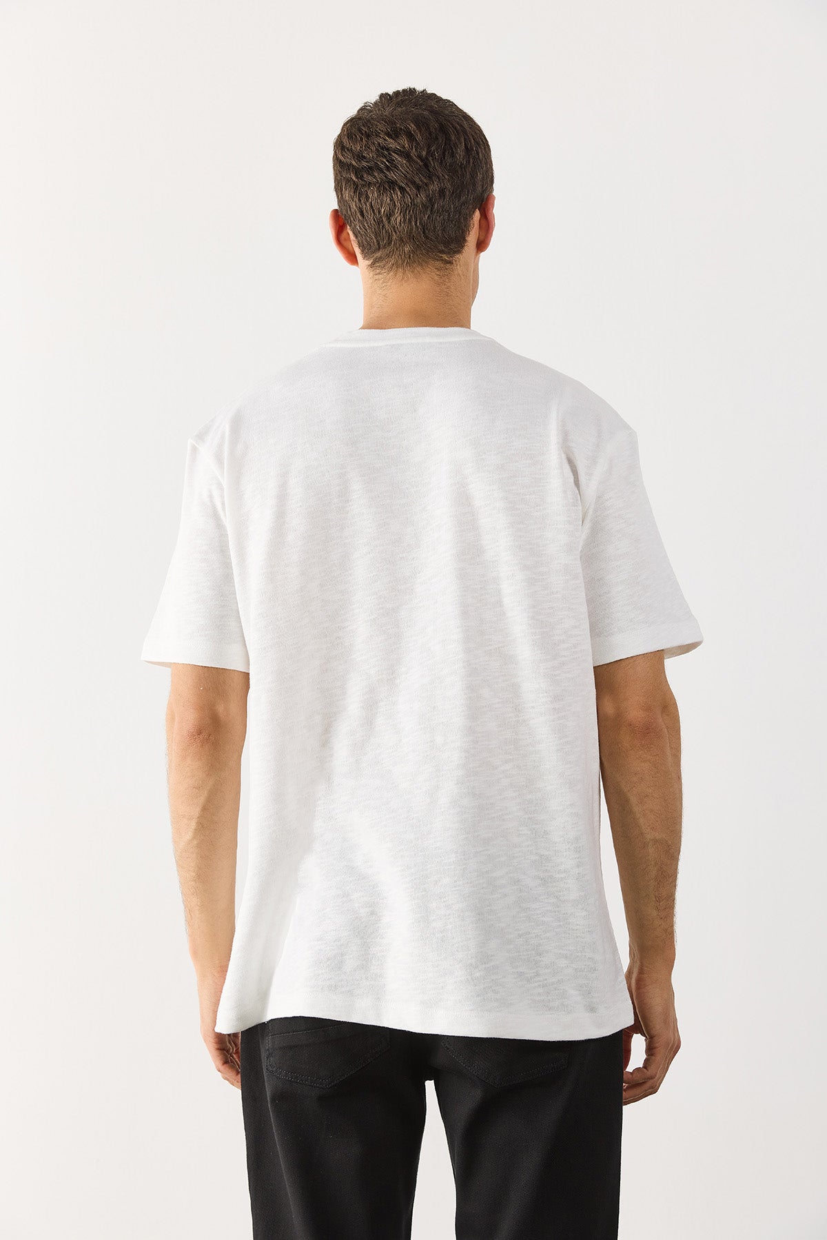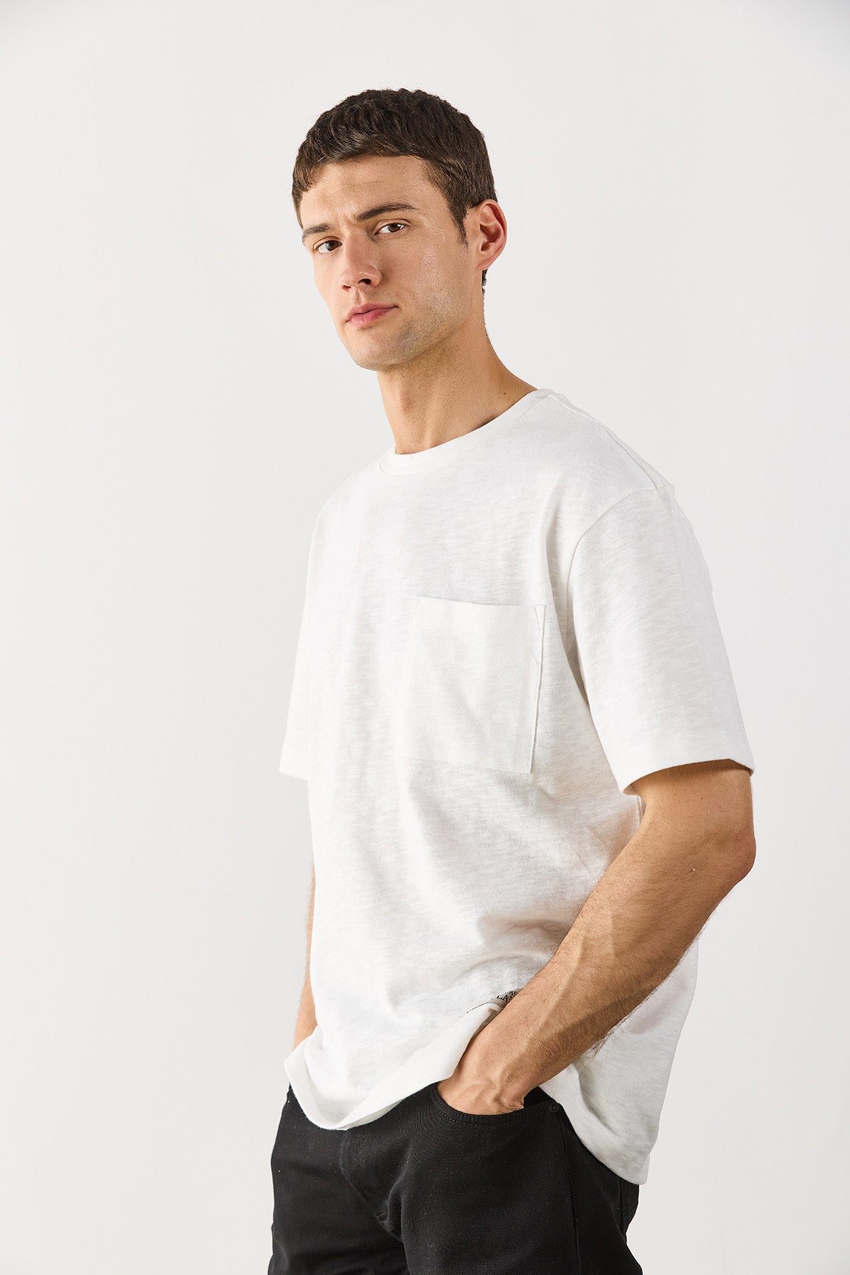 Erkek Cep Detaylı Bisiklet Yaka Flamlı Tişört %100 Pamuk - Fildişi