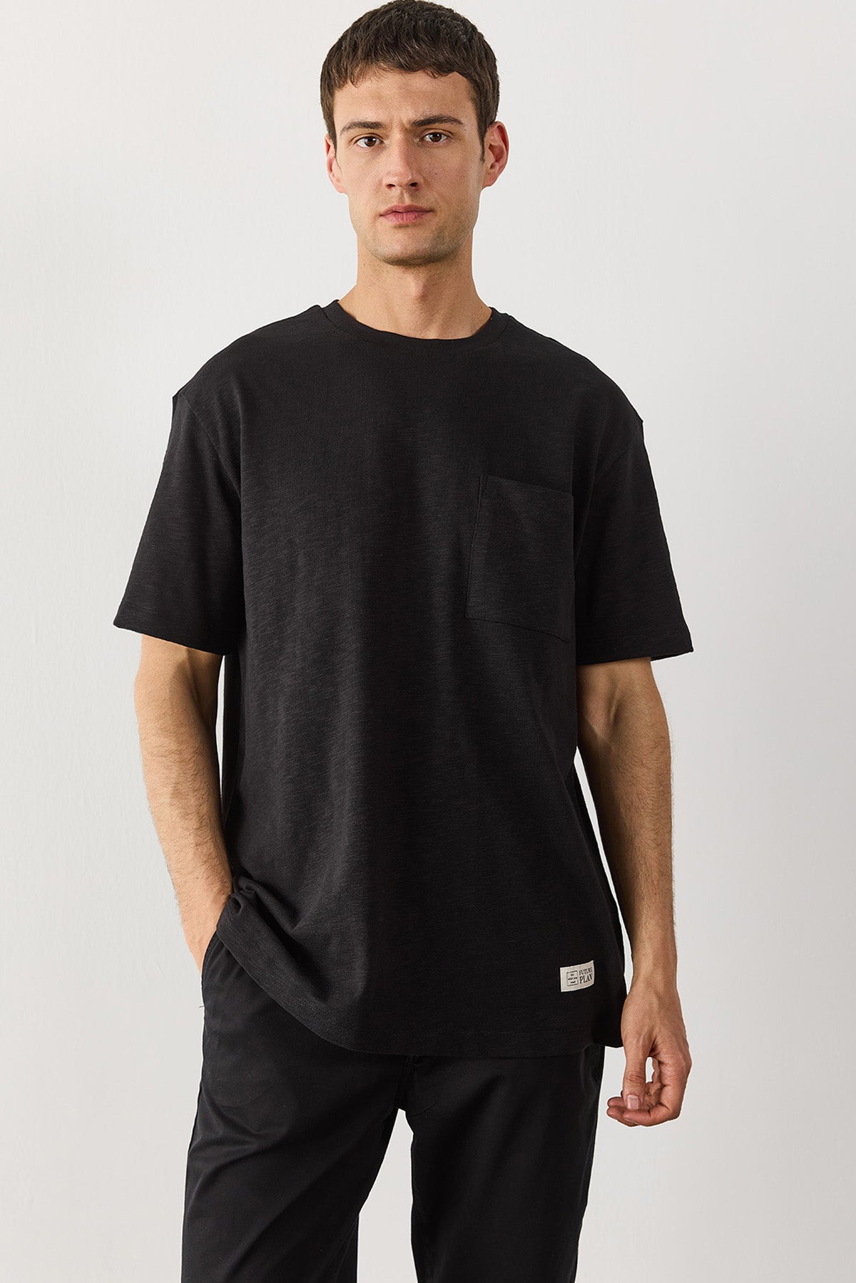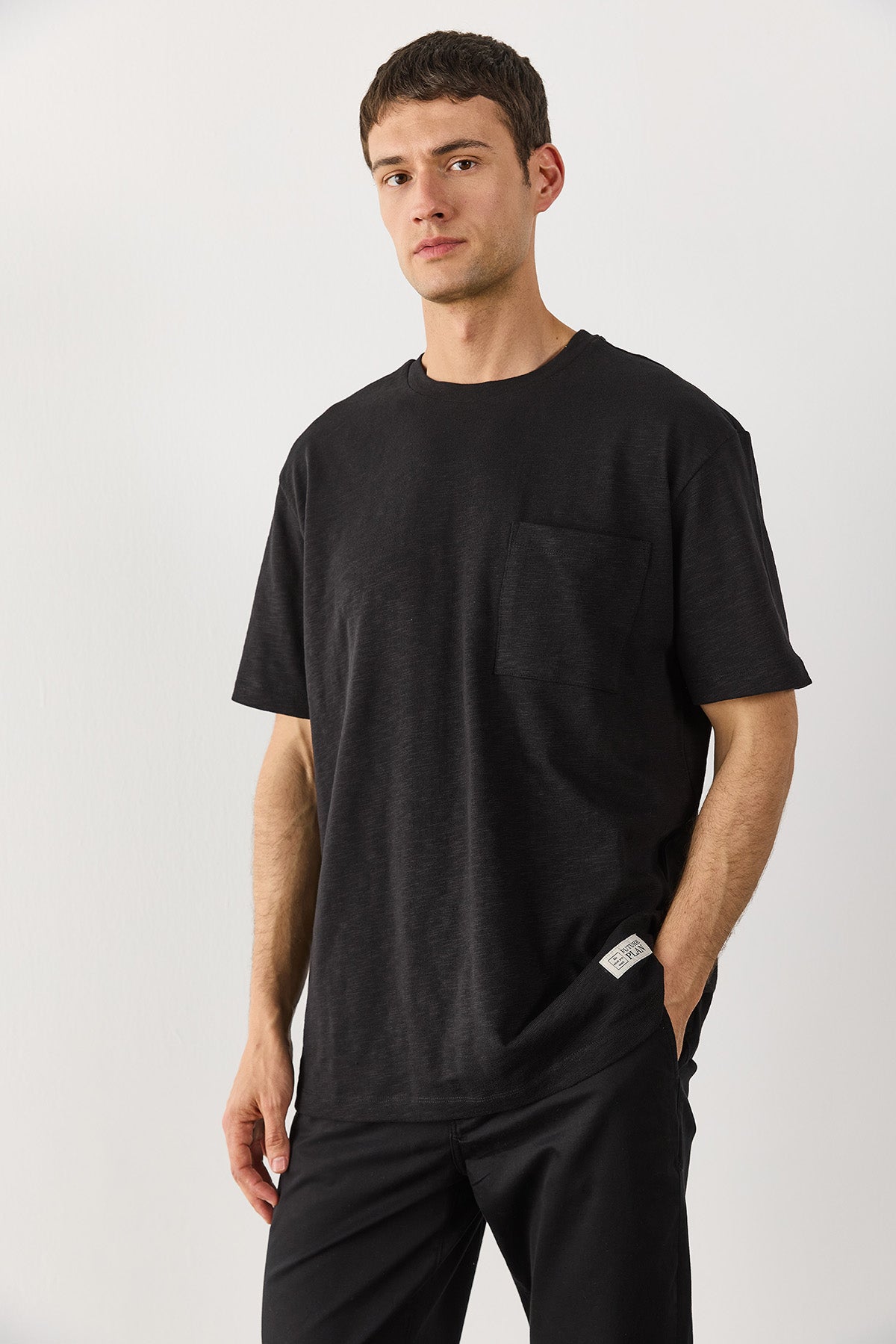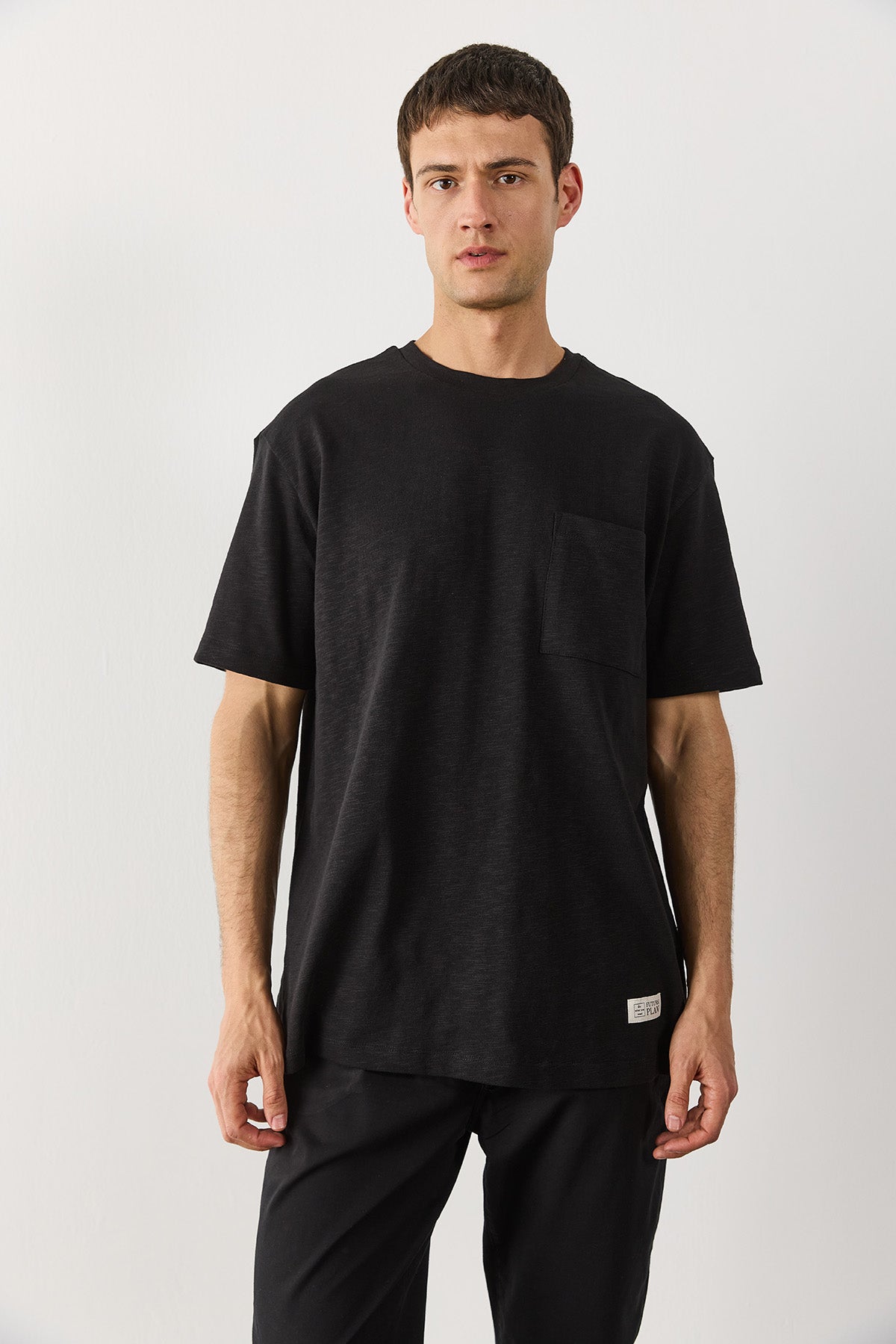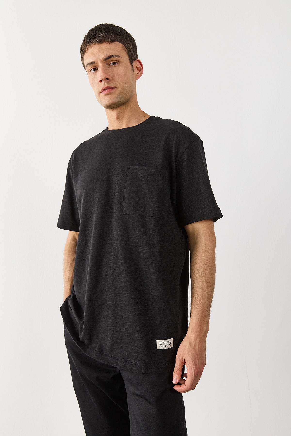 Erkek Cep Detaylı Bisiklet Yaka Flamlı Tişört %100 Pamuk - Siyah