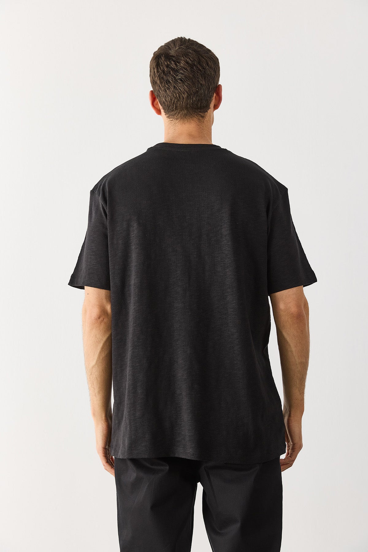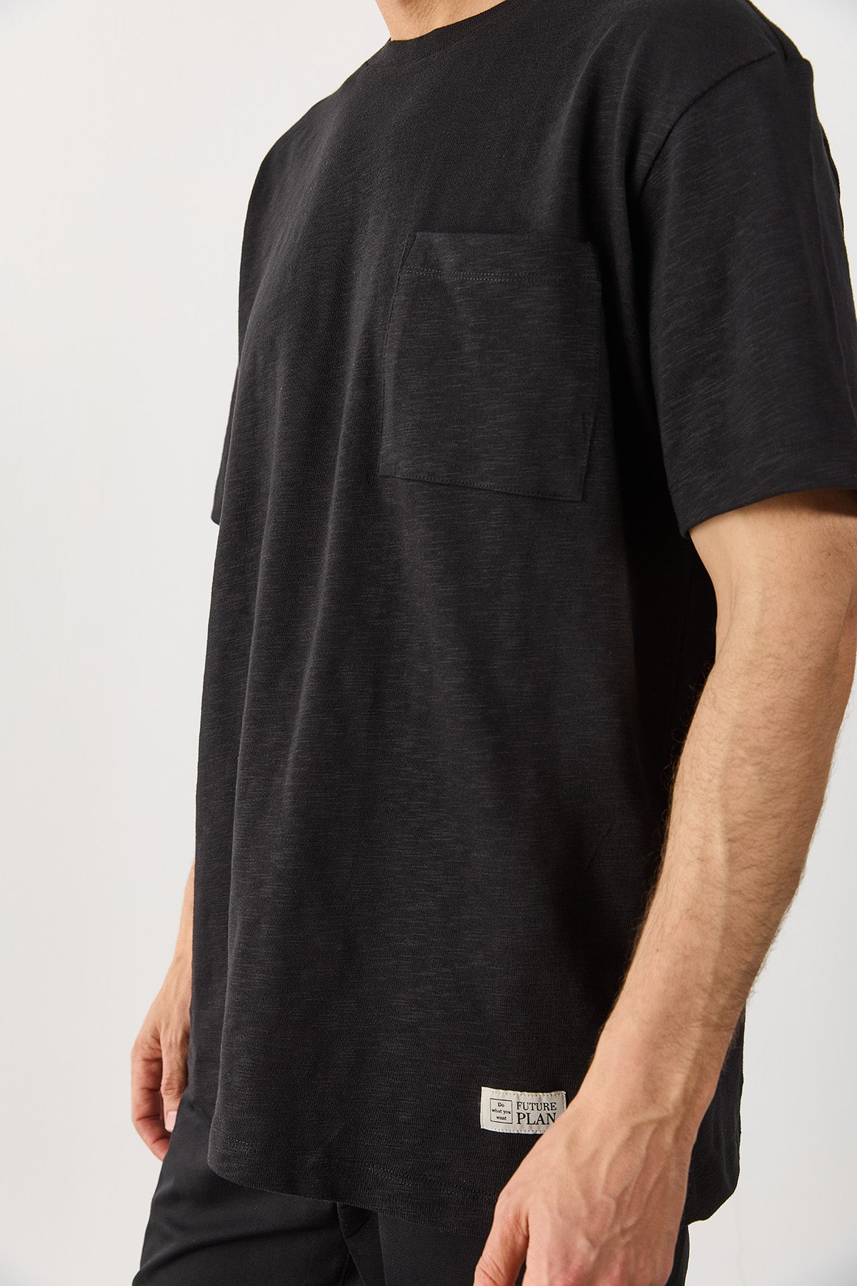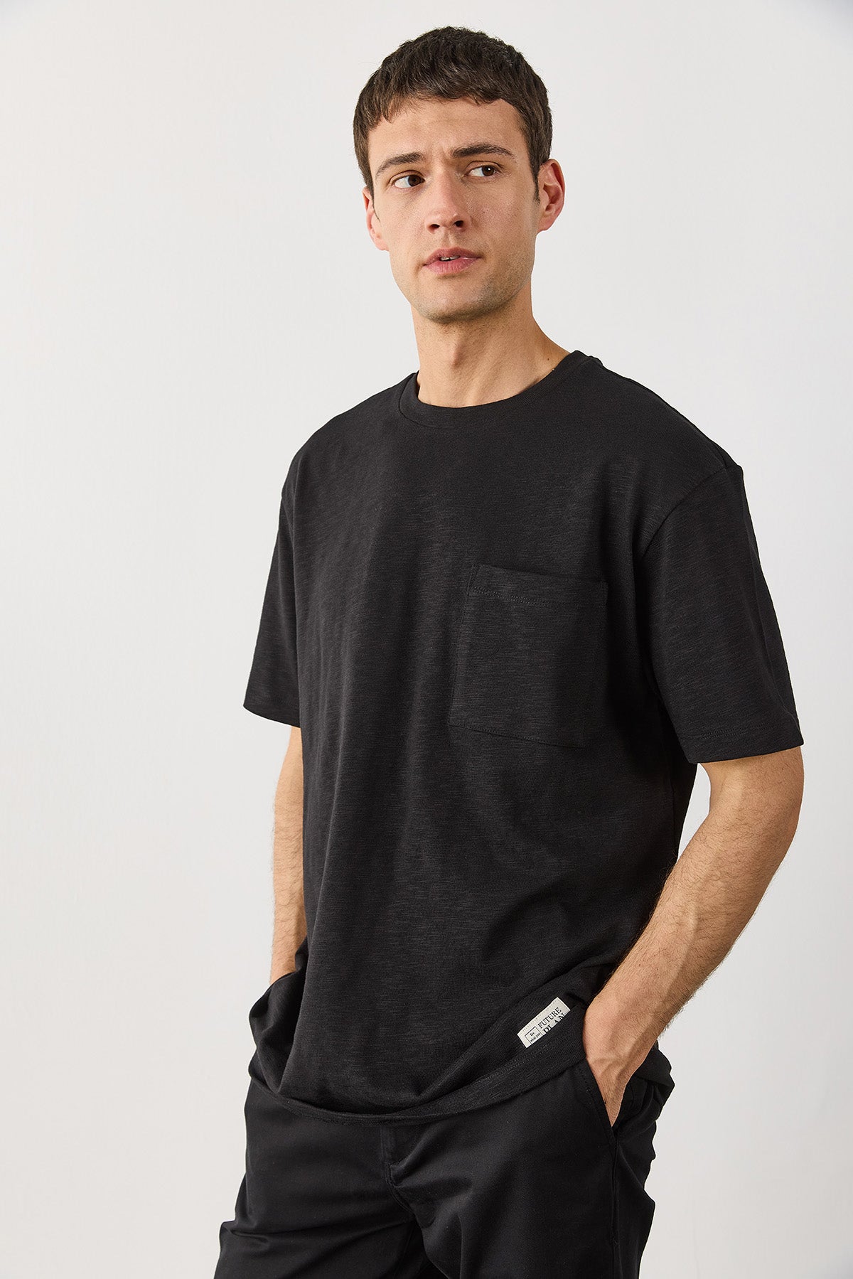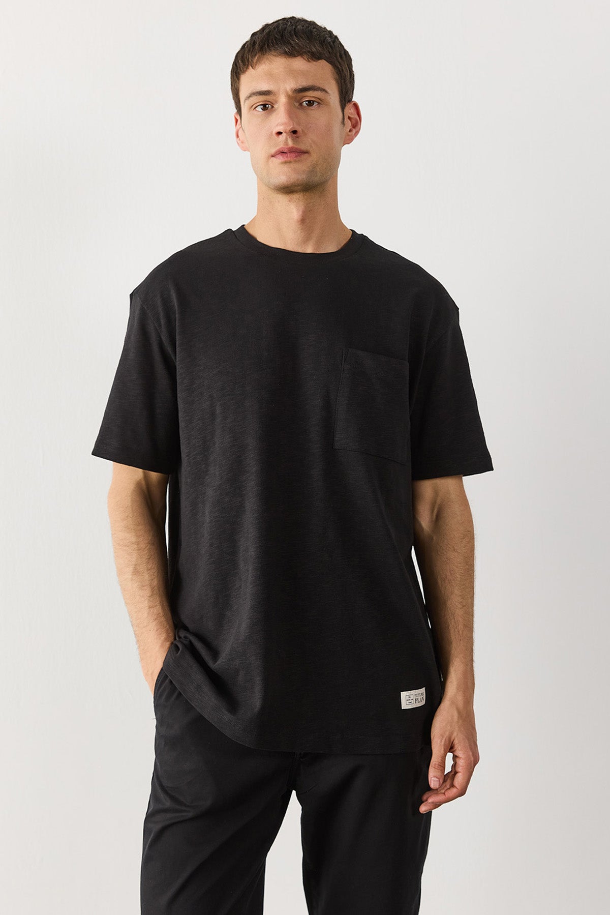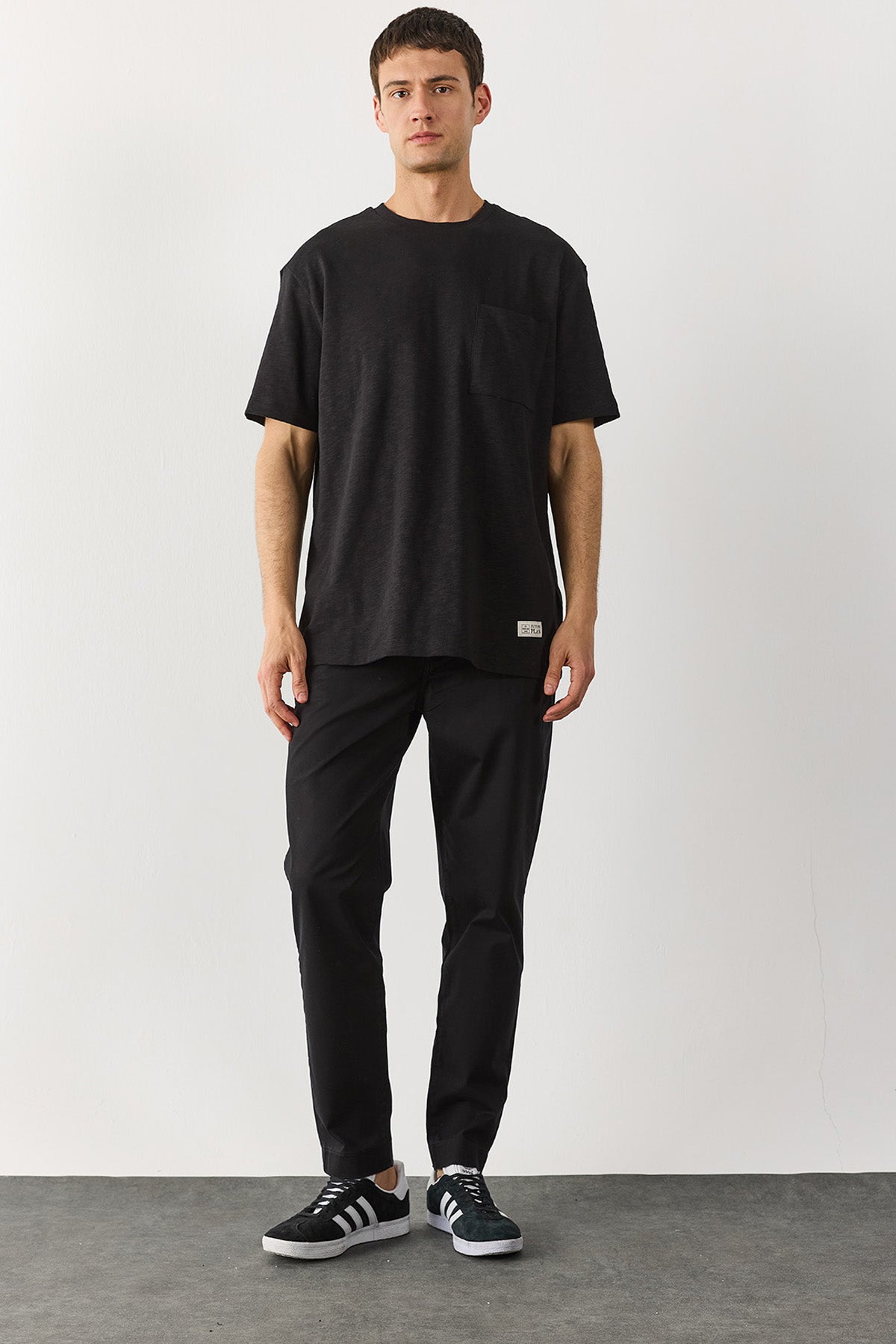 Erkek Cep Detaylı Bisiklet Yaka Flamlı Tişört %100 Pamuk - Siyah
