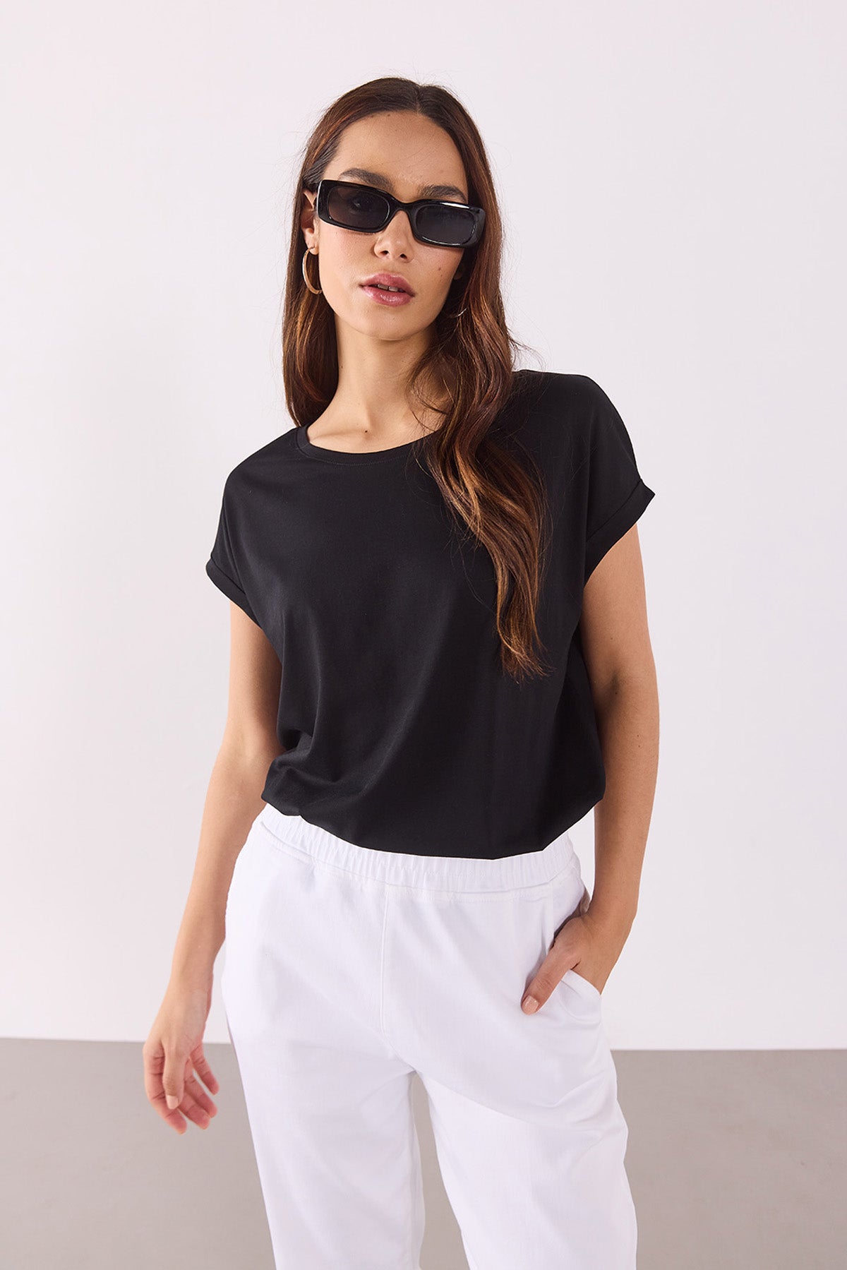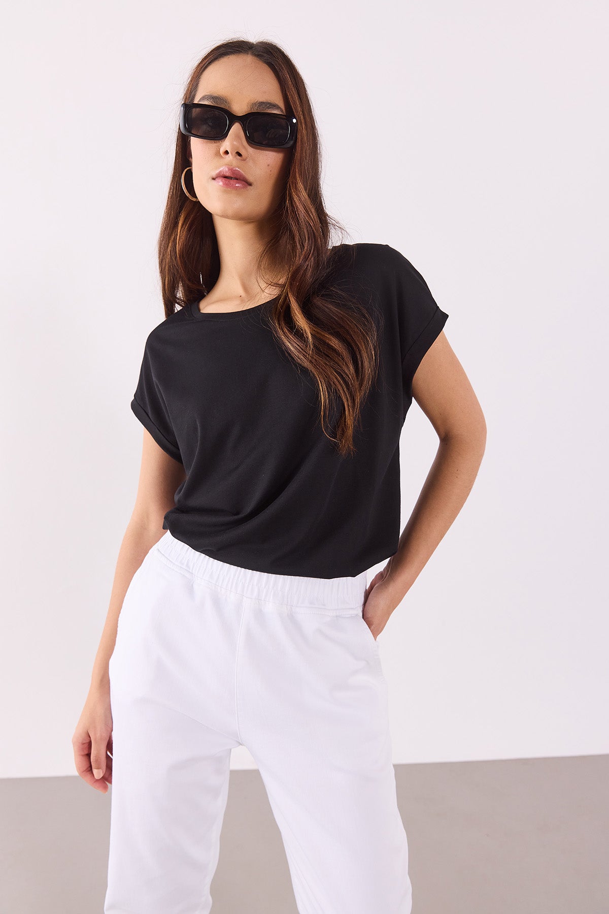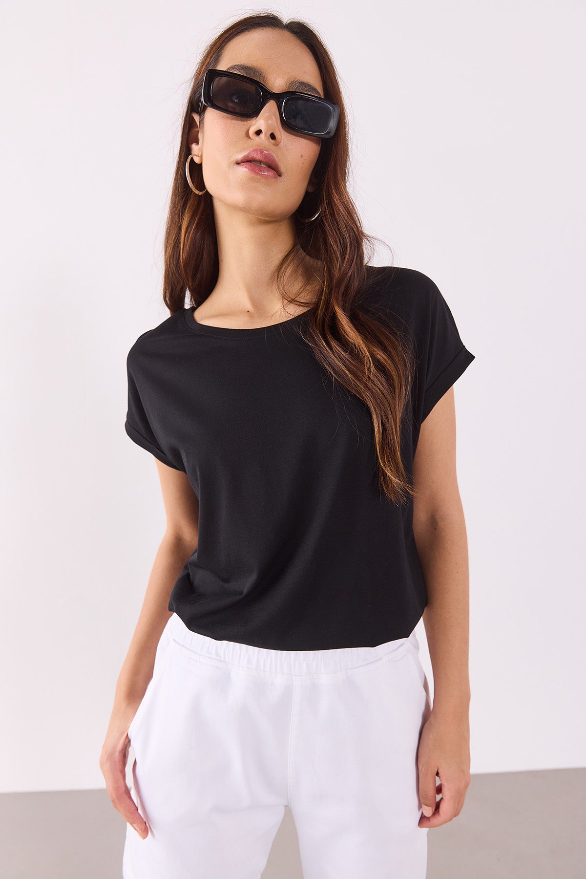 Kadın Cindy Bisiklet Yaka Regular Fit Basic Modal Tişört (TENCEL)™ - Siyah