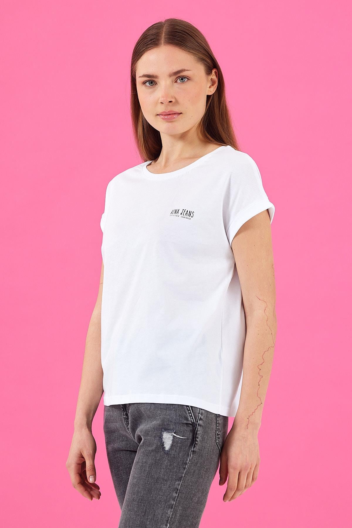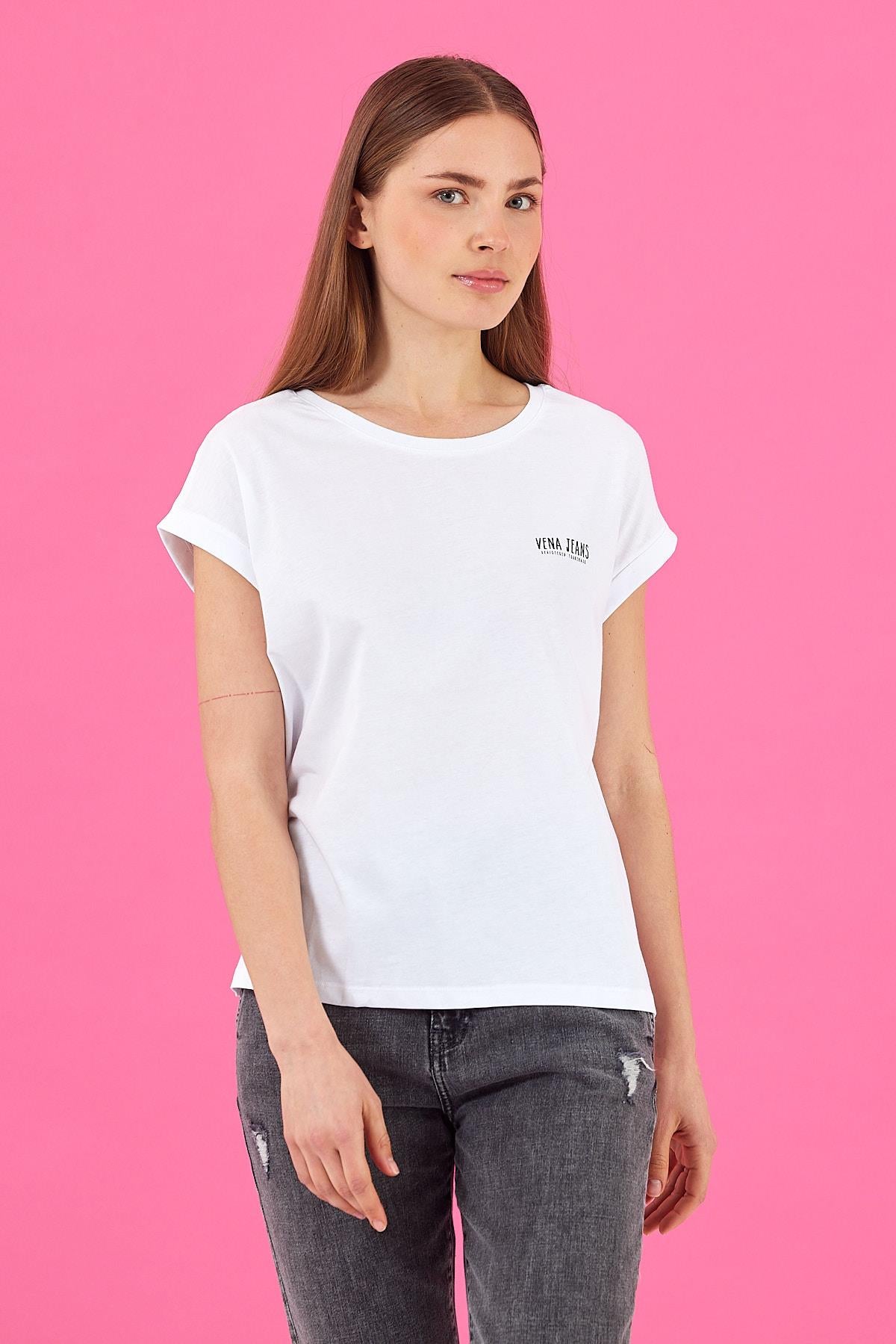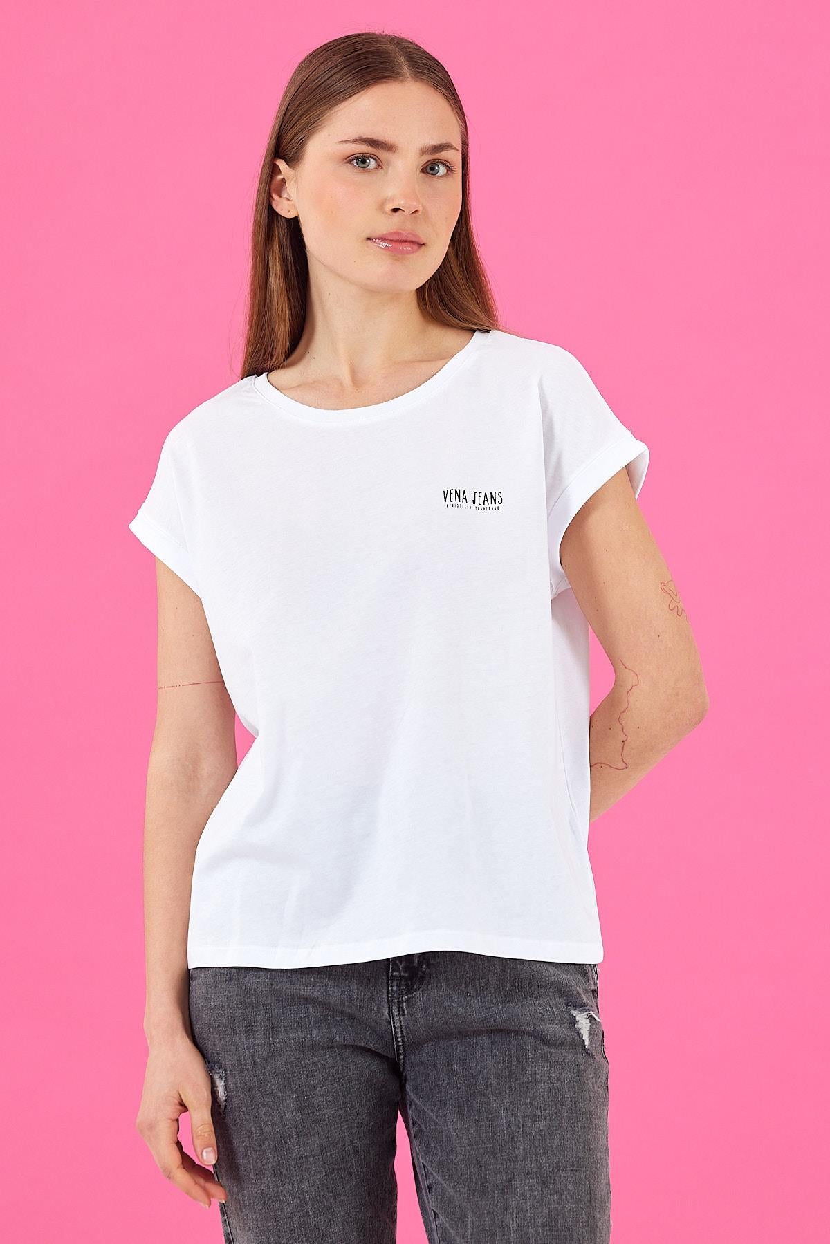 Kadın Cindy Vena Logolu Tişört %100 Pamuk - Beyaz