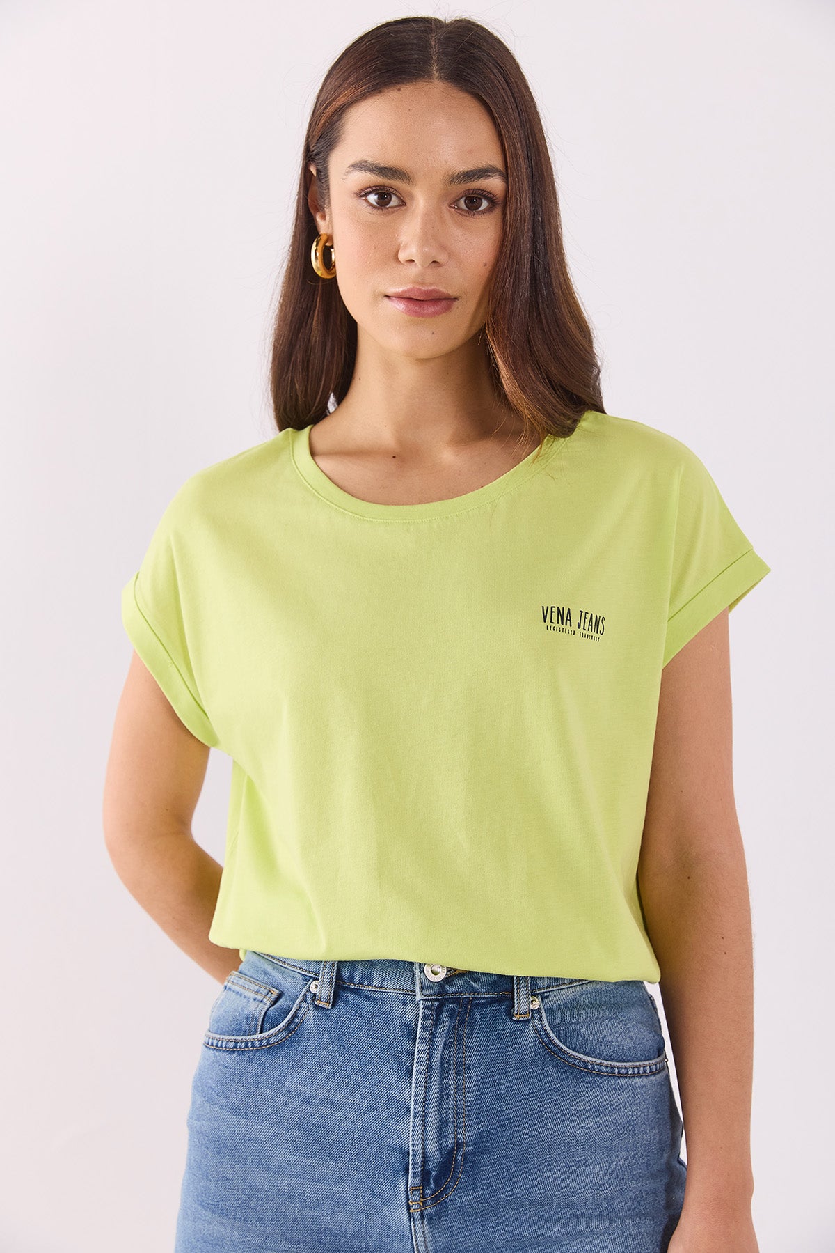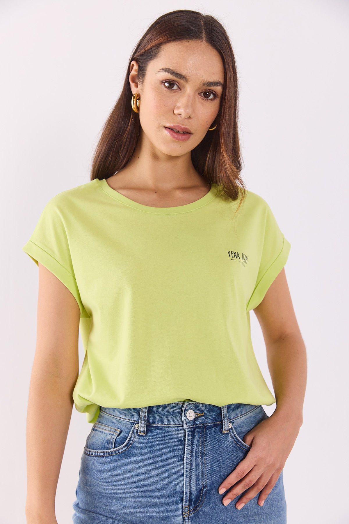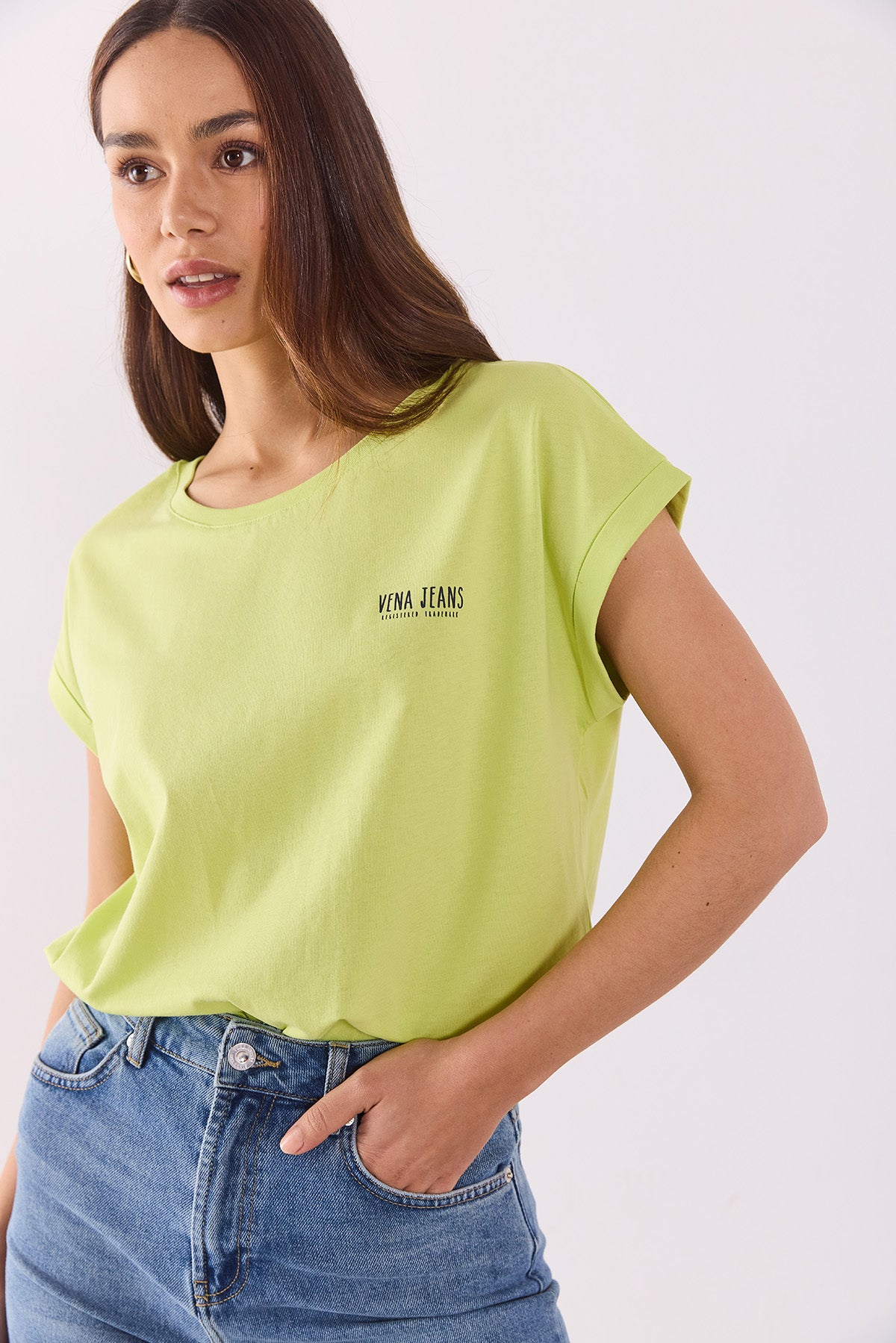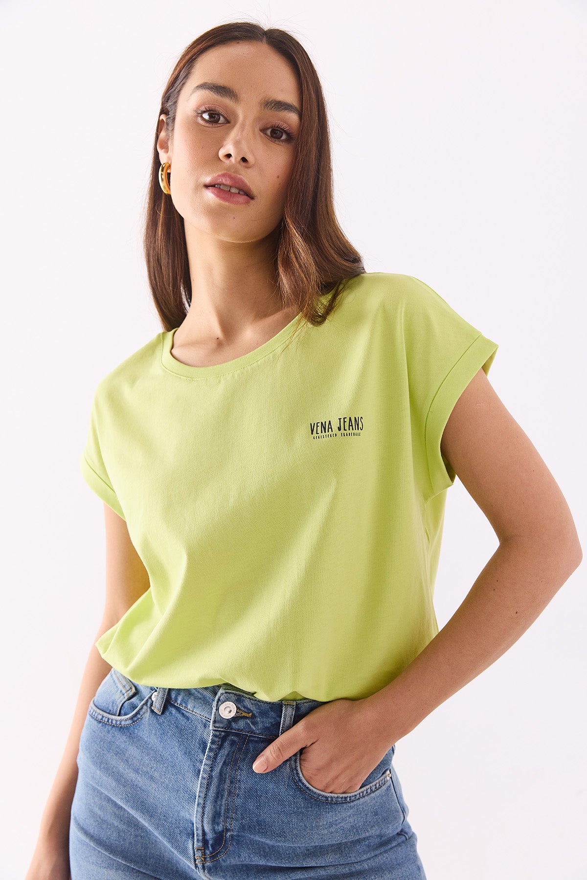 Kadın Cindy Vena Logolu Tişört %100 Pamuk - LIME