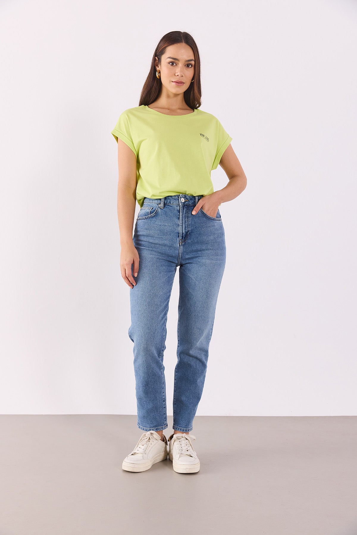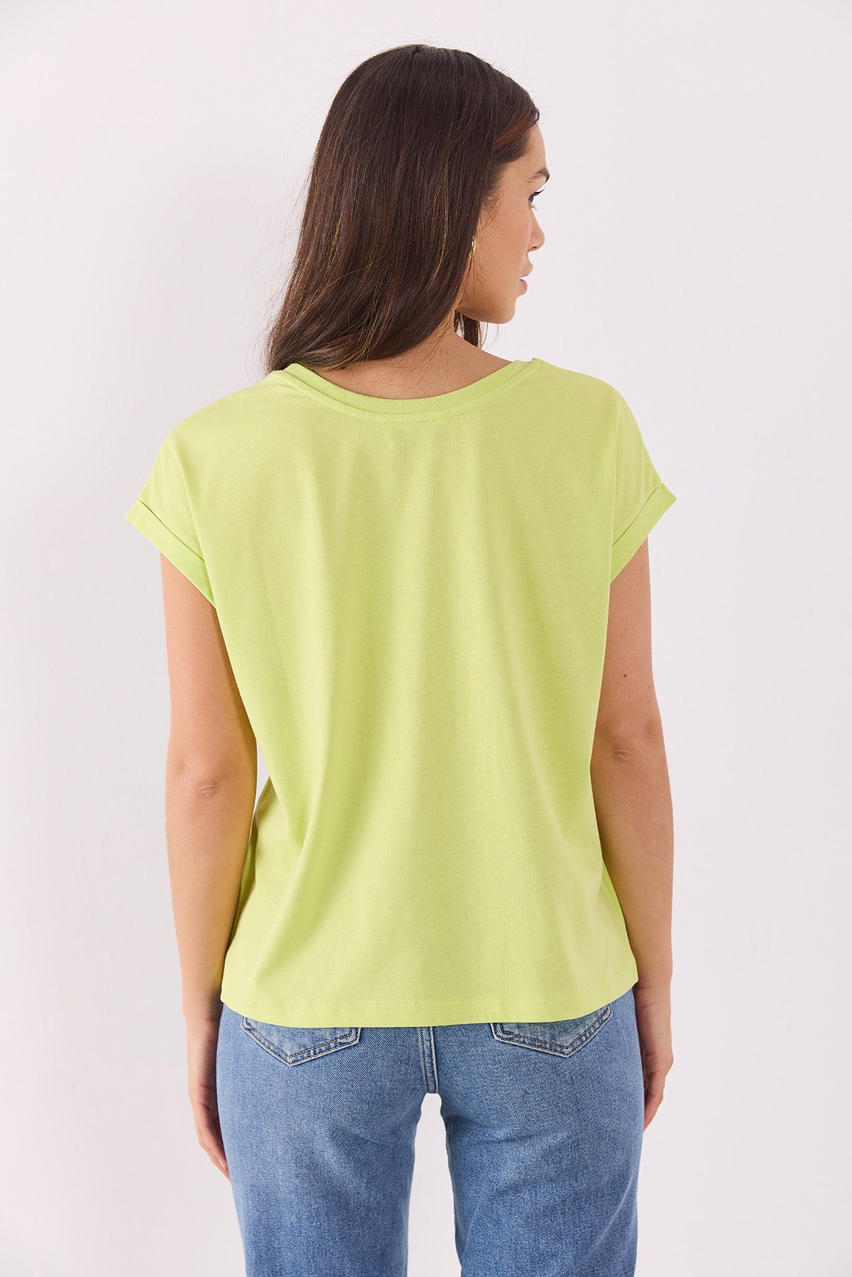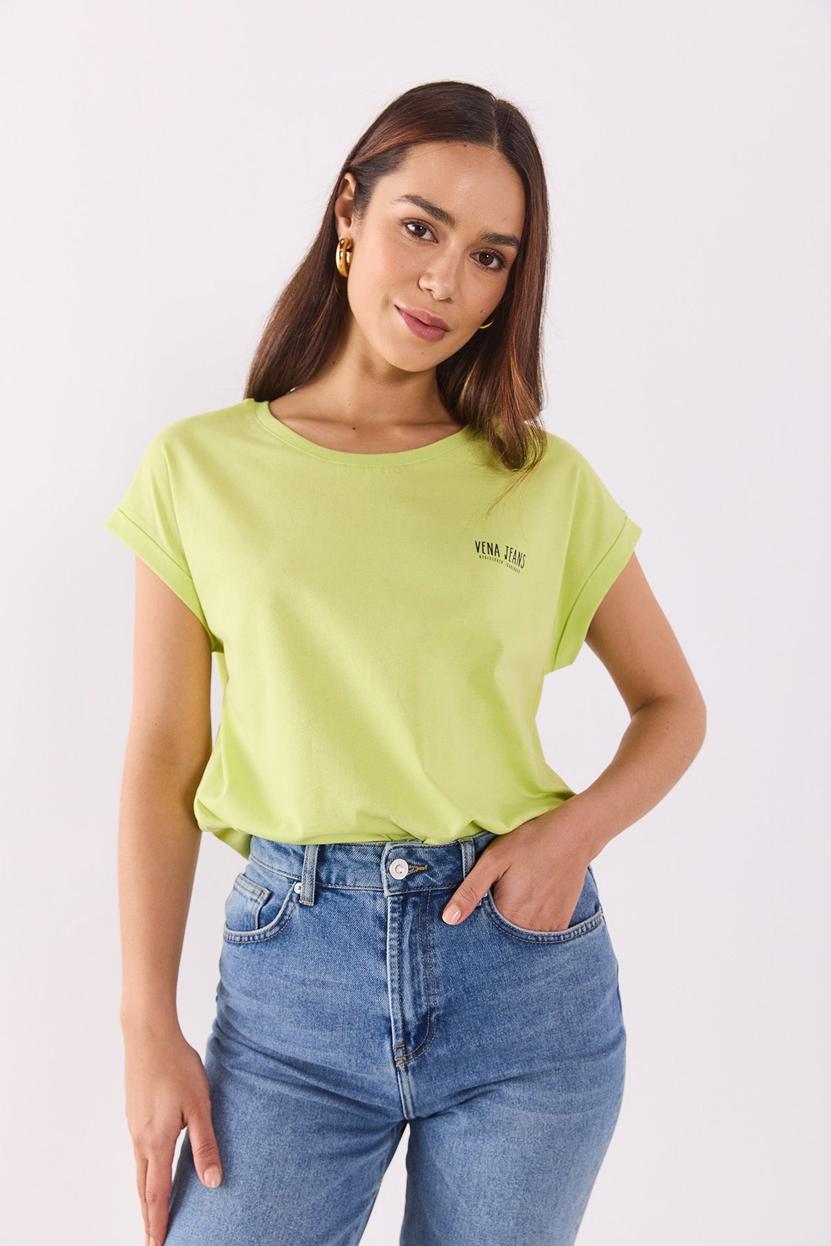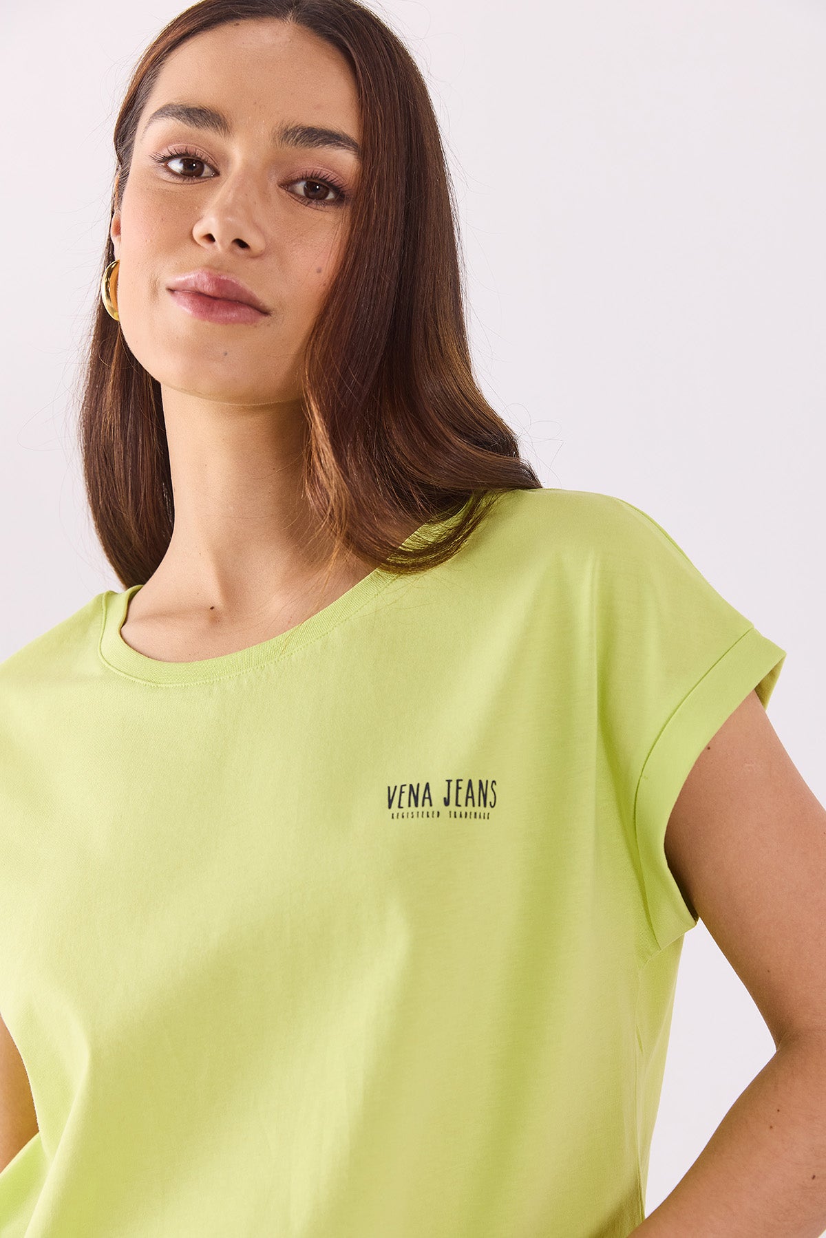 Kadın Cindy Vena Logolu Tişört %100 Pamuk - LIME