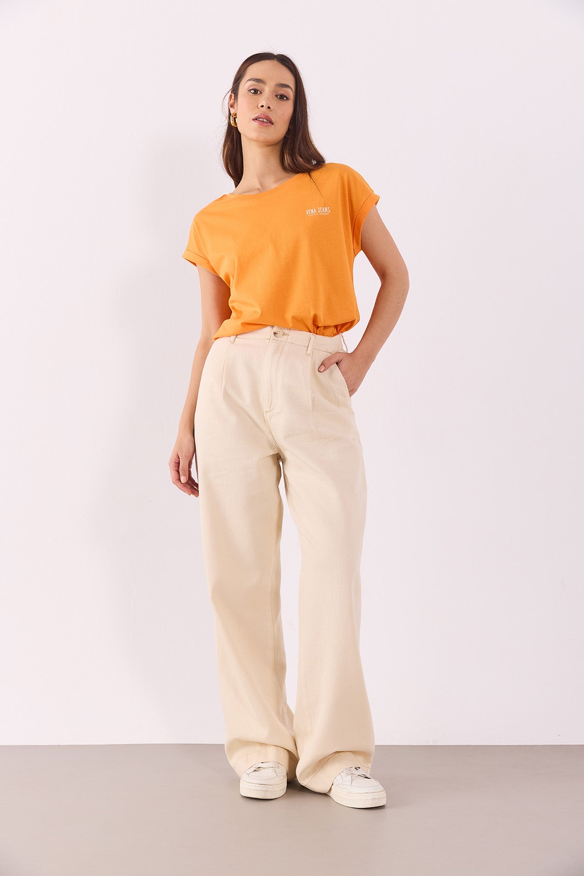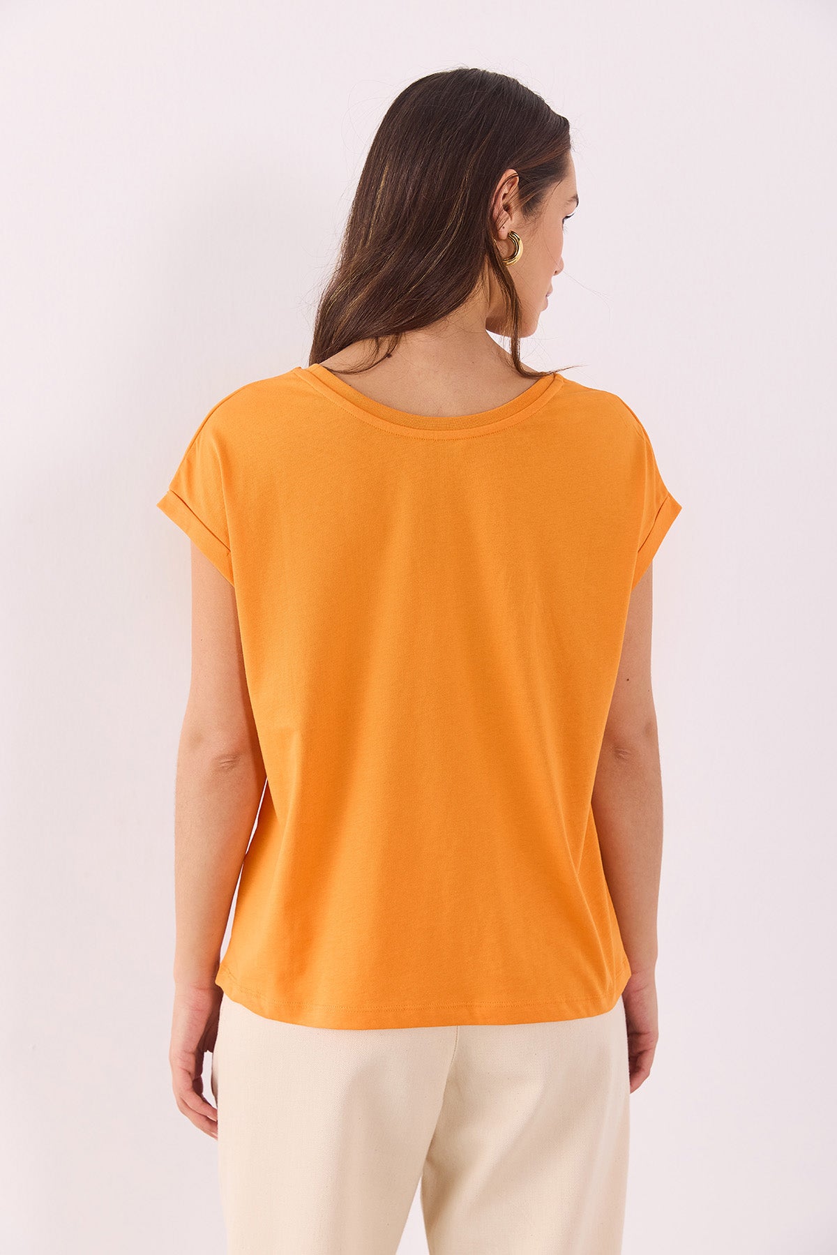 Kadın Cindy Vena Logolu Tişört %100 Pamuk - Turuncu