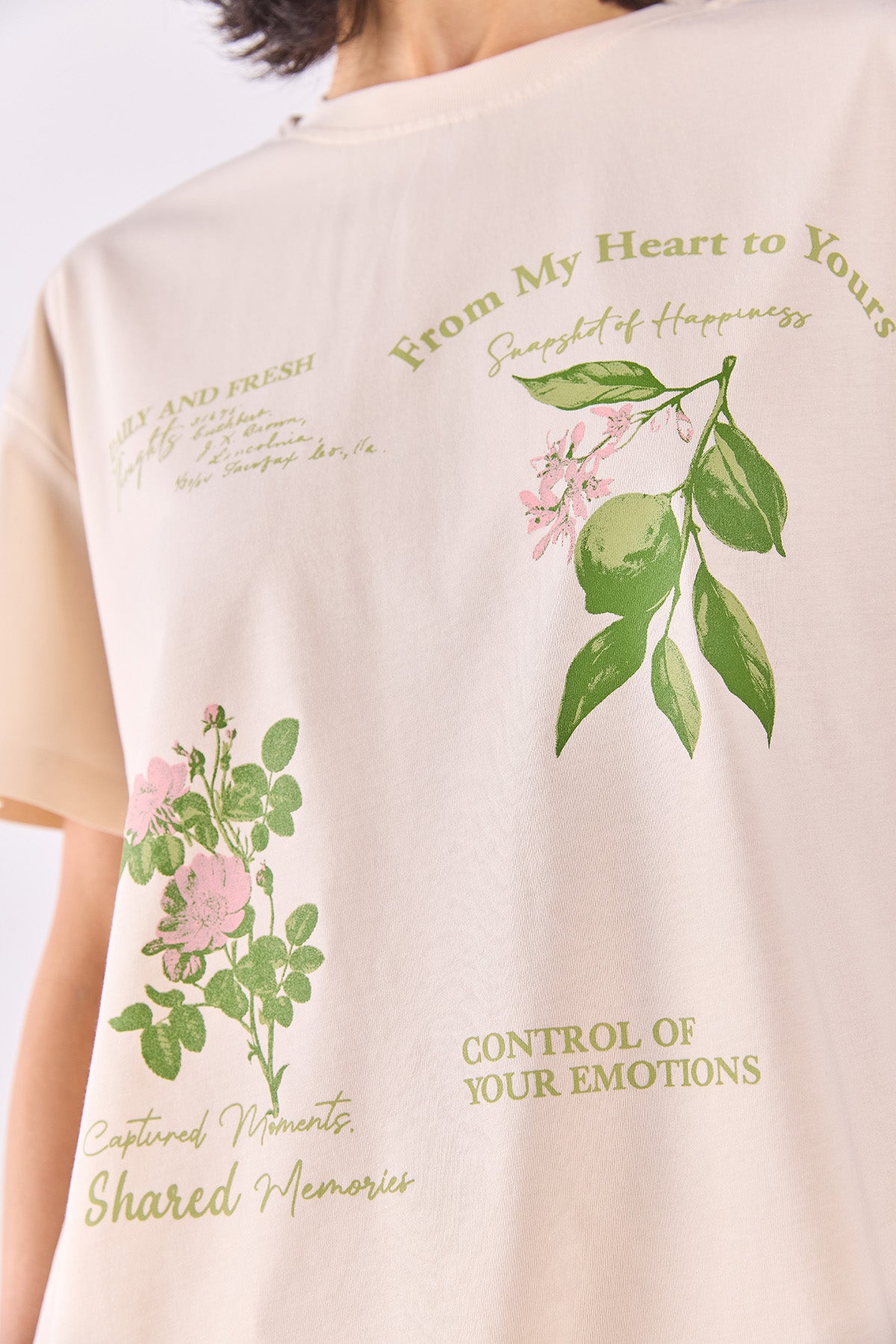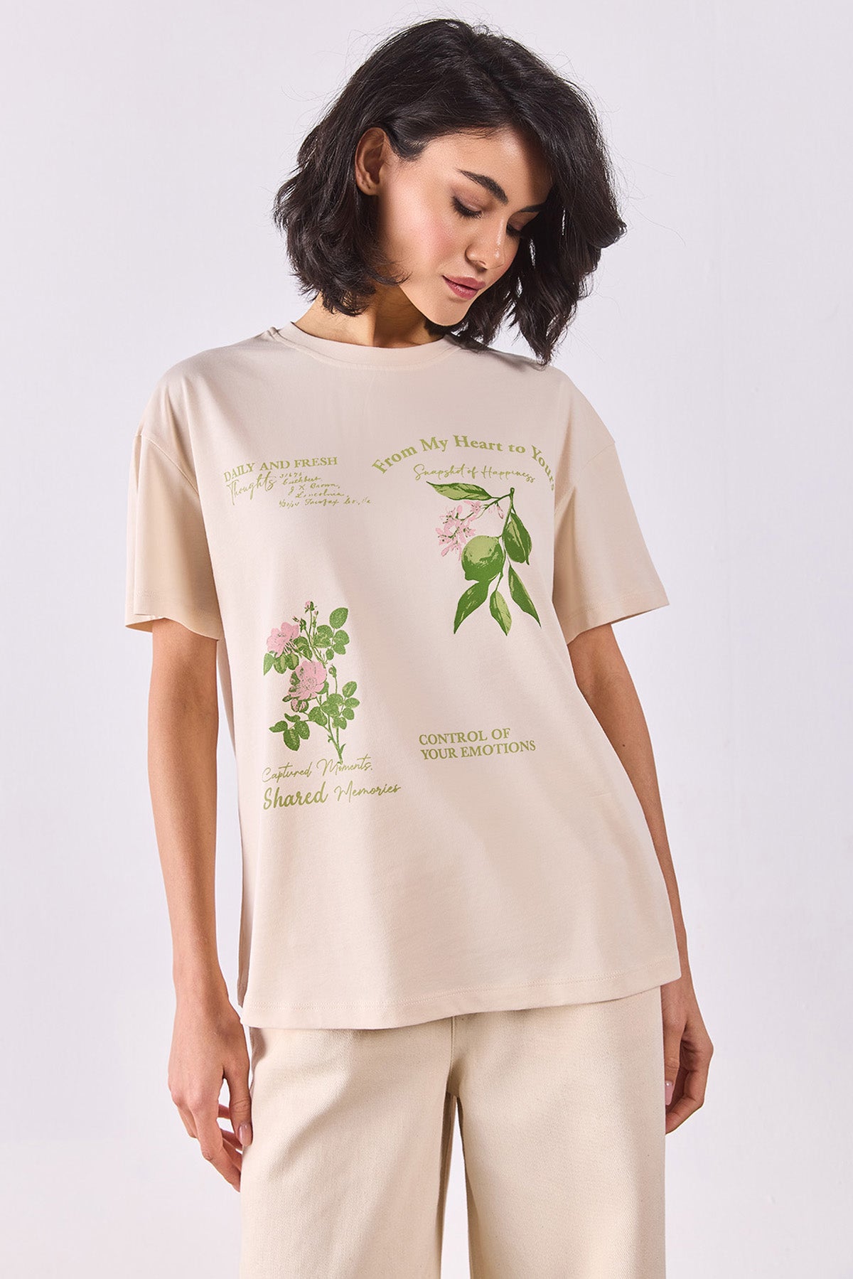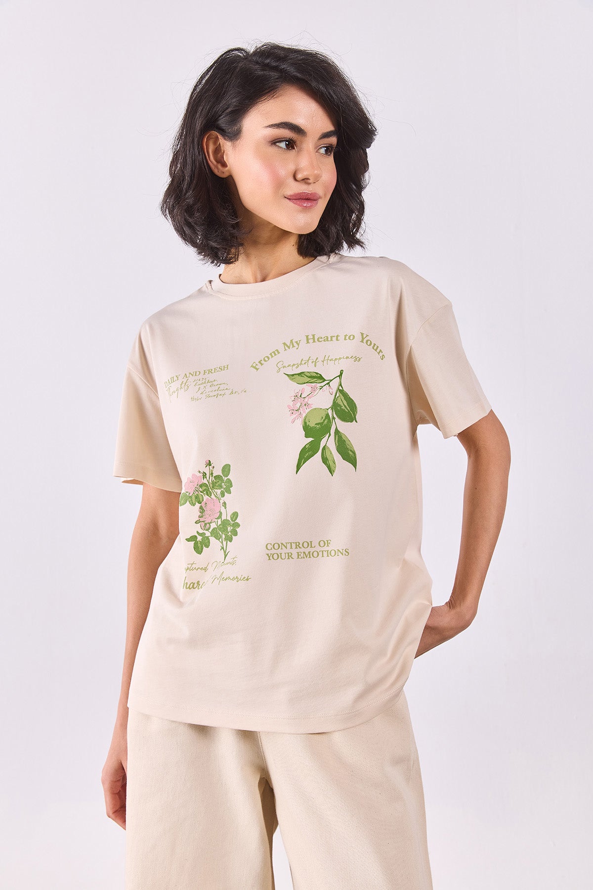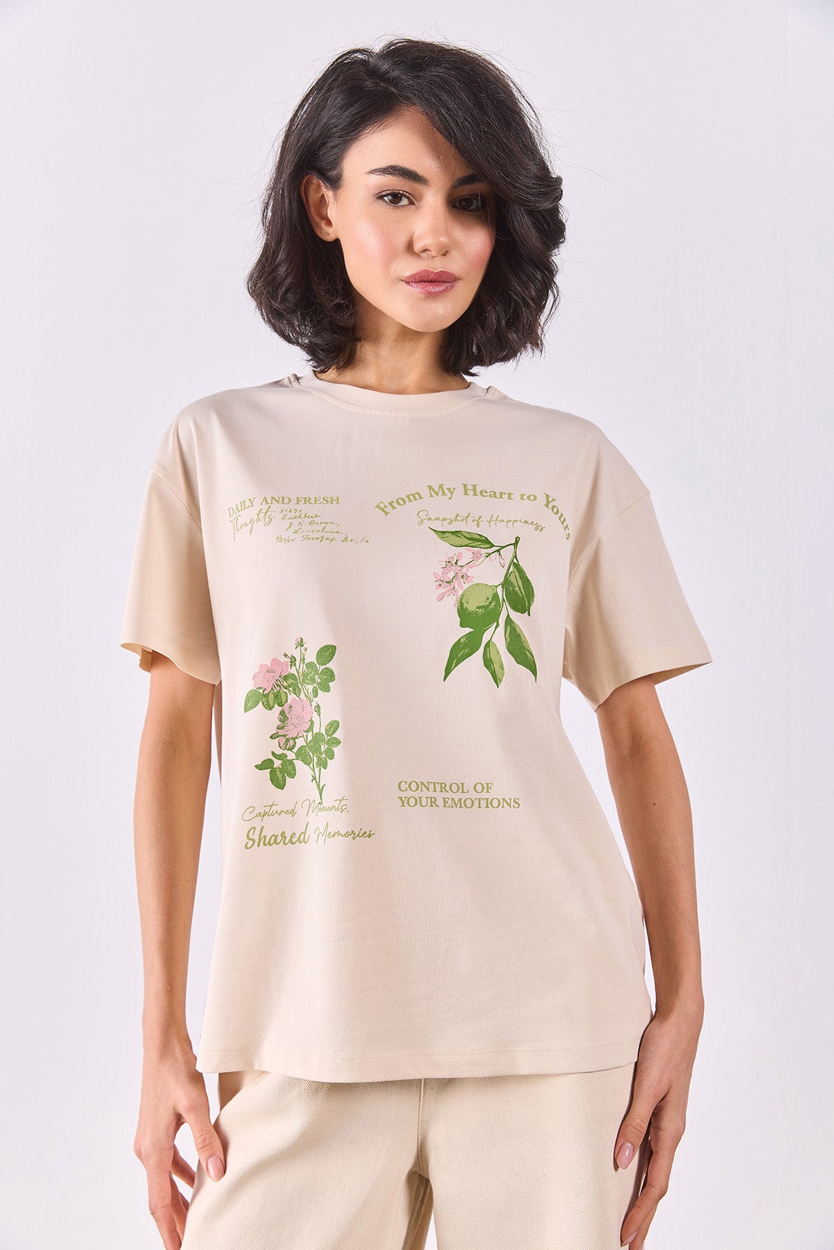Kadın Daily Fresh Baskılı Tişört %100 Pamuk - Bej