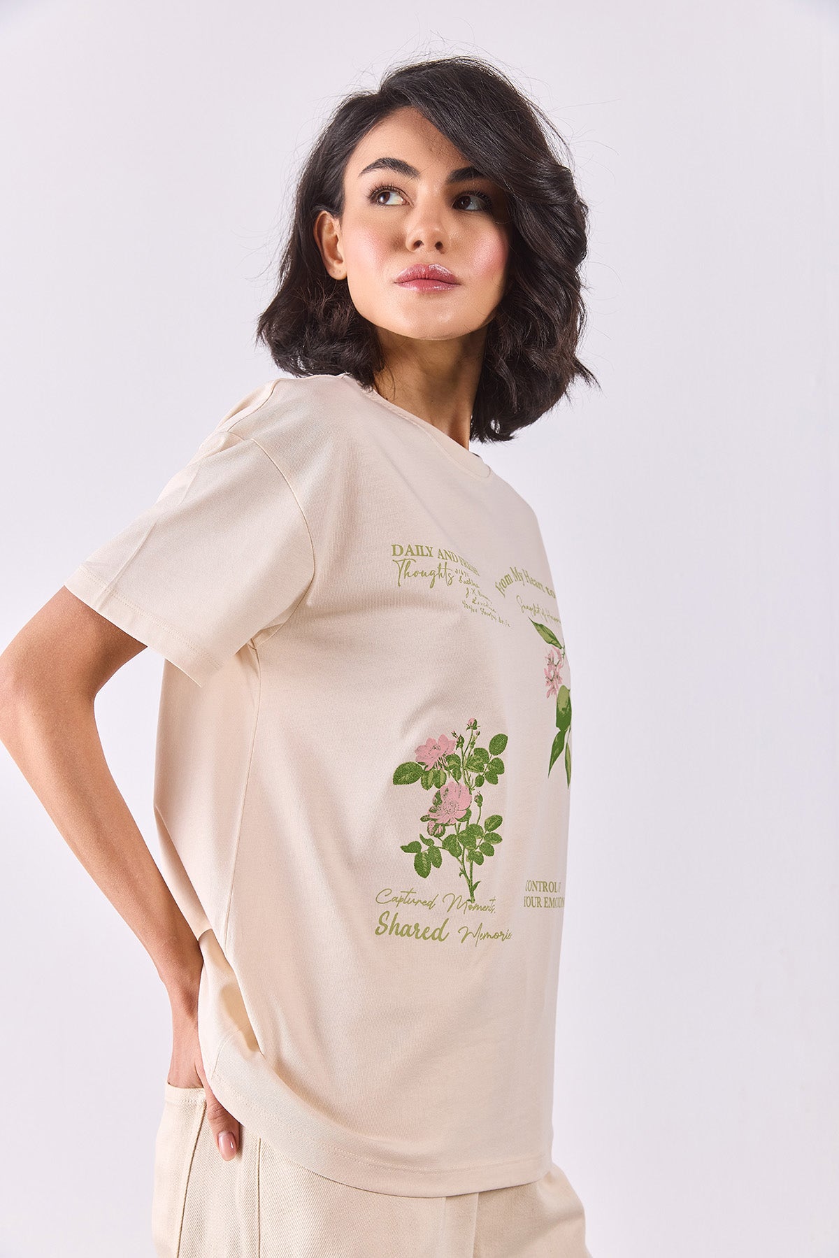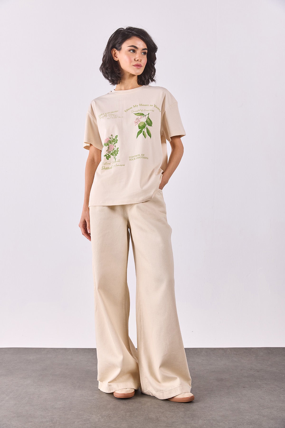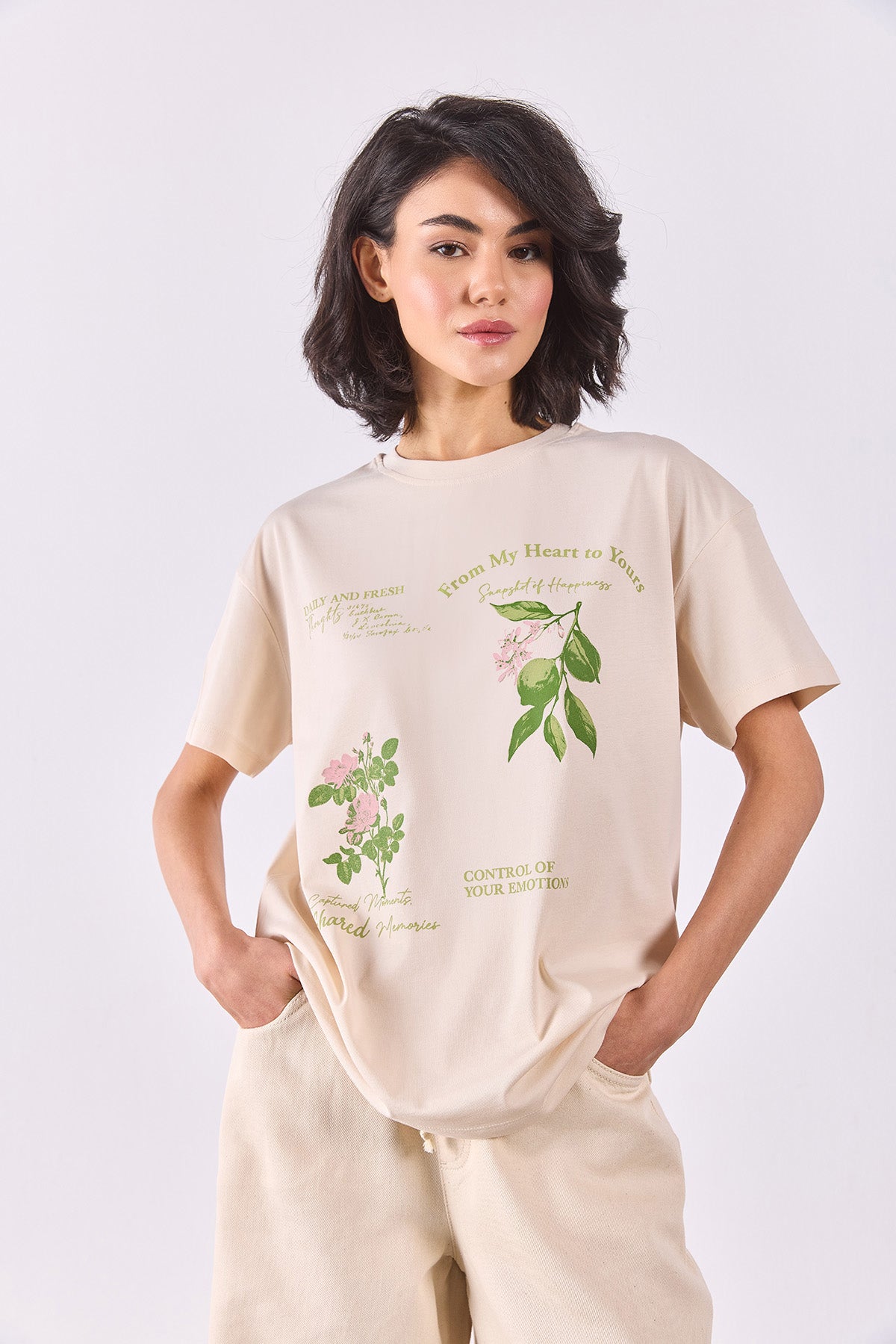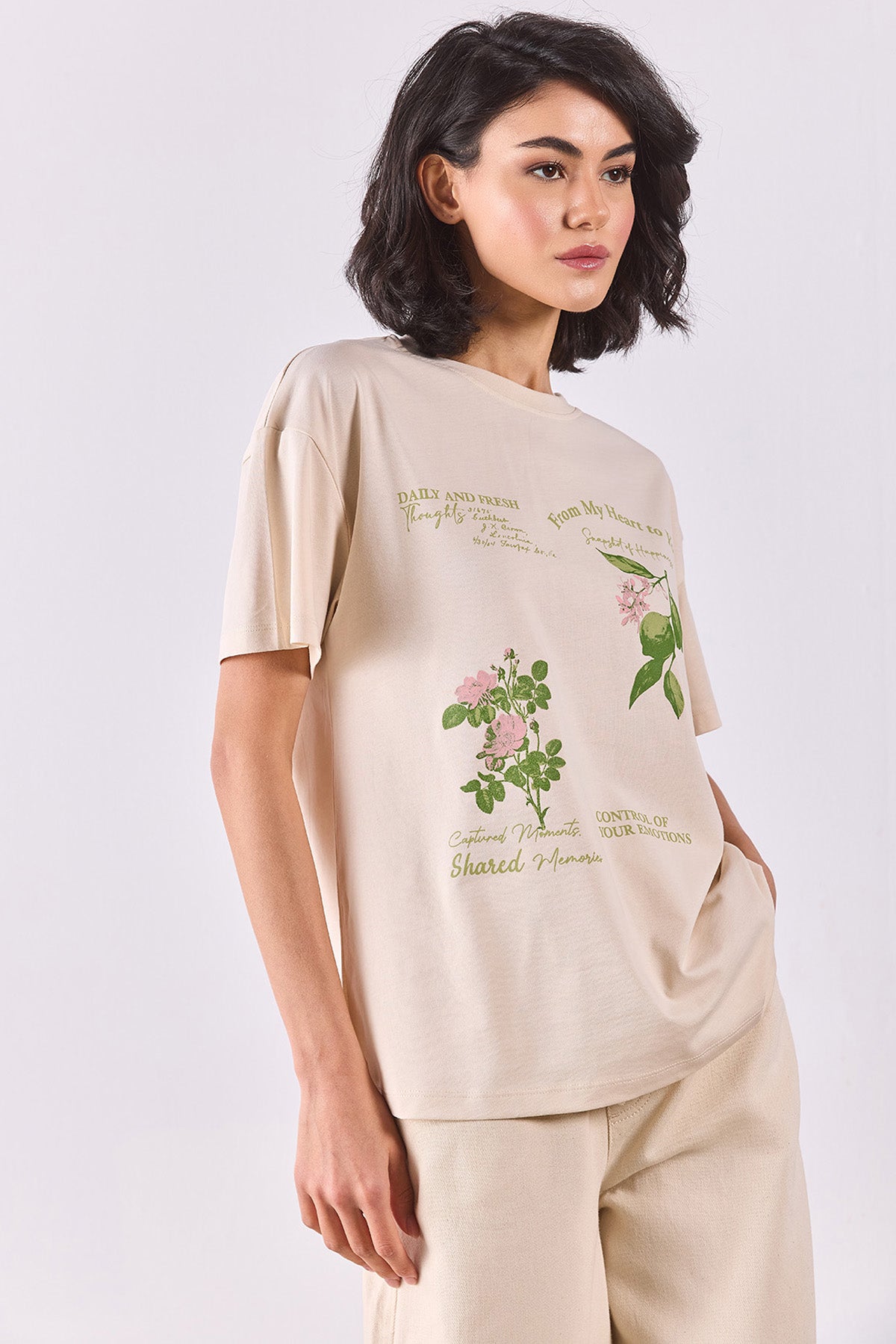 Kadın Daily Fresh Baskılı Tişört %100 Pamuk - Bej