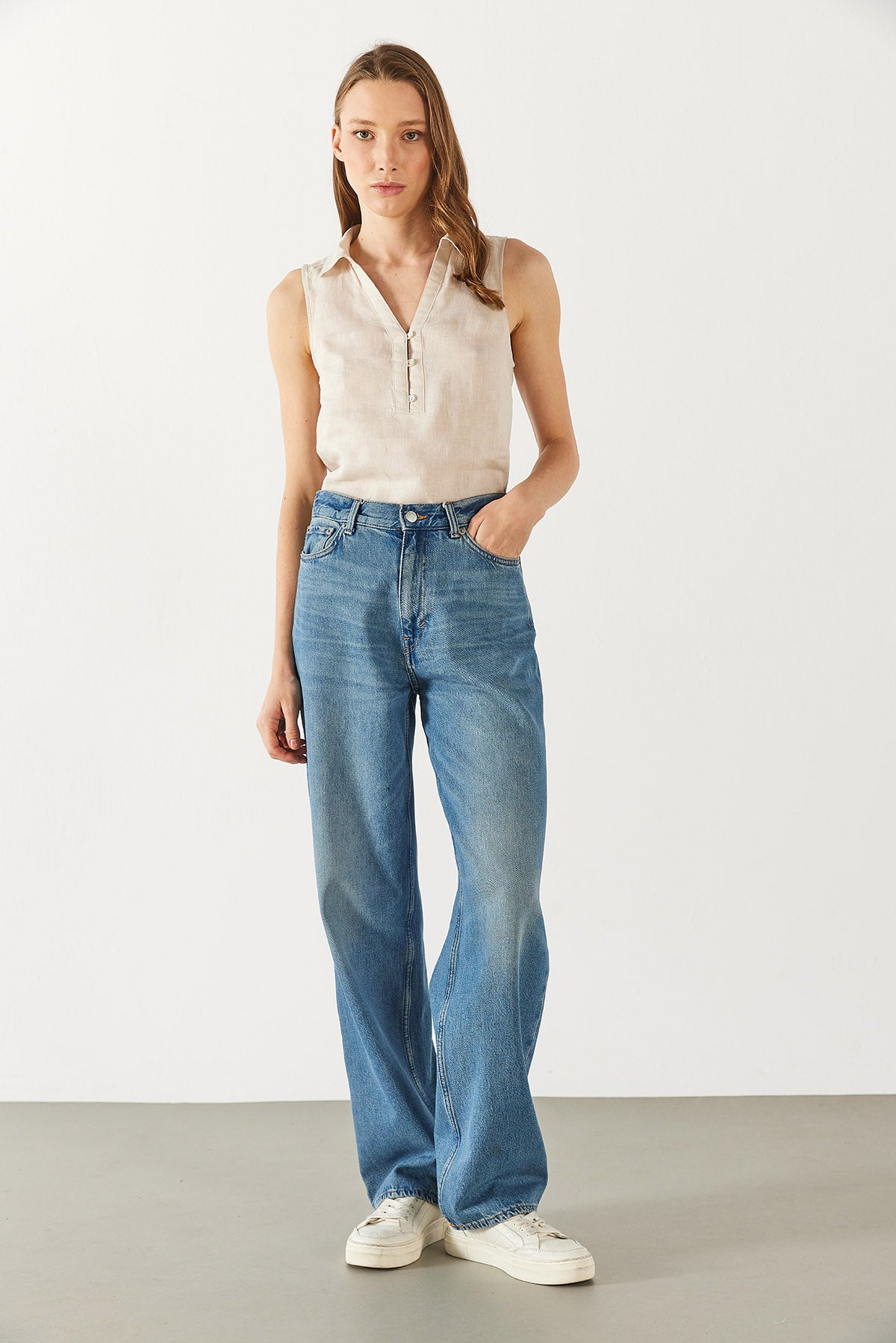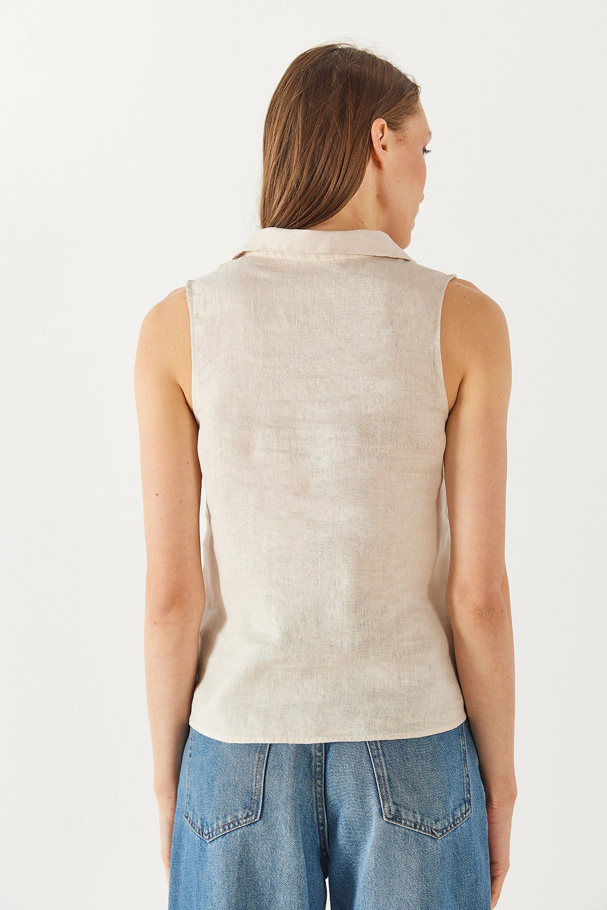 Darya Gömlek Yaka Kolsuz Keten Bluz
