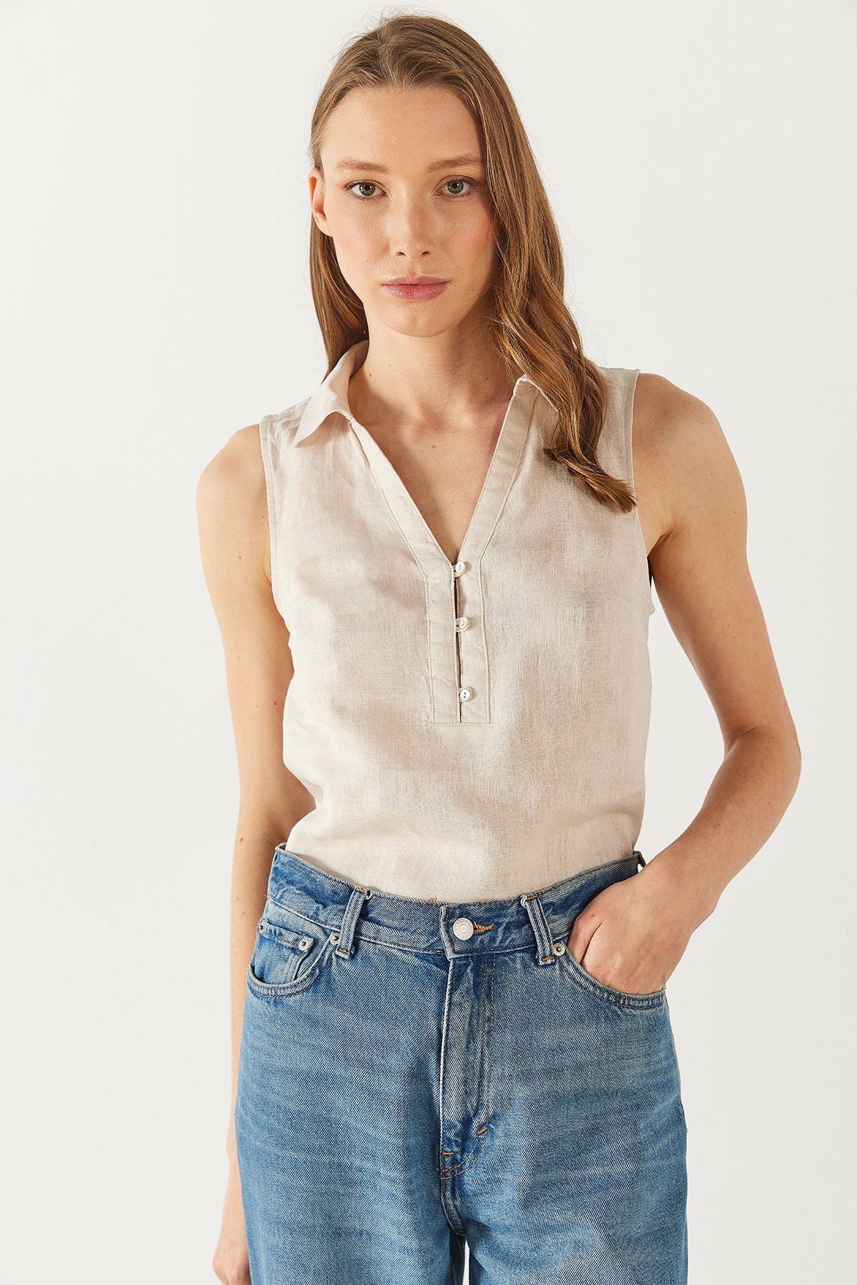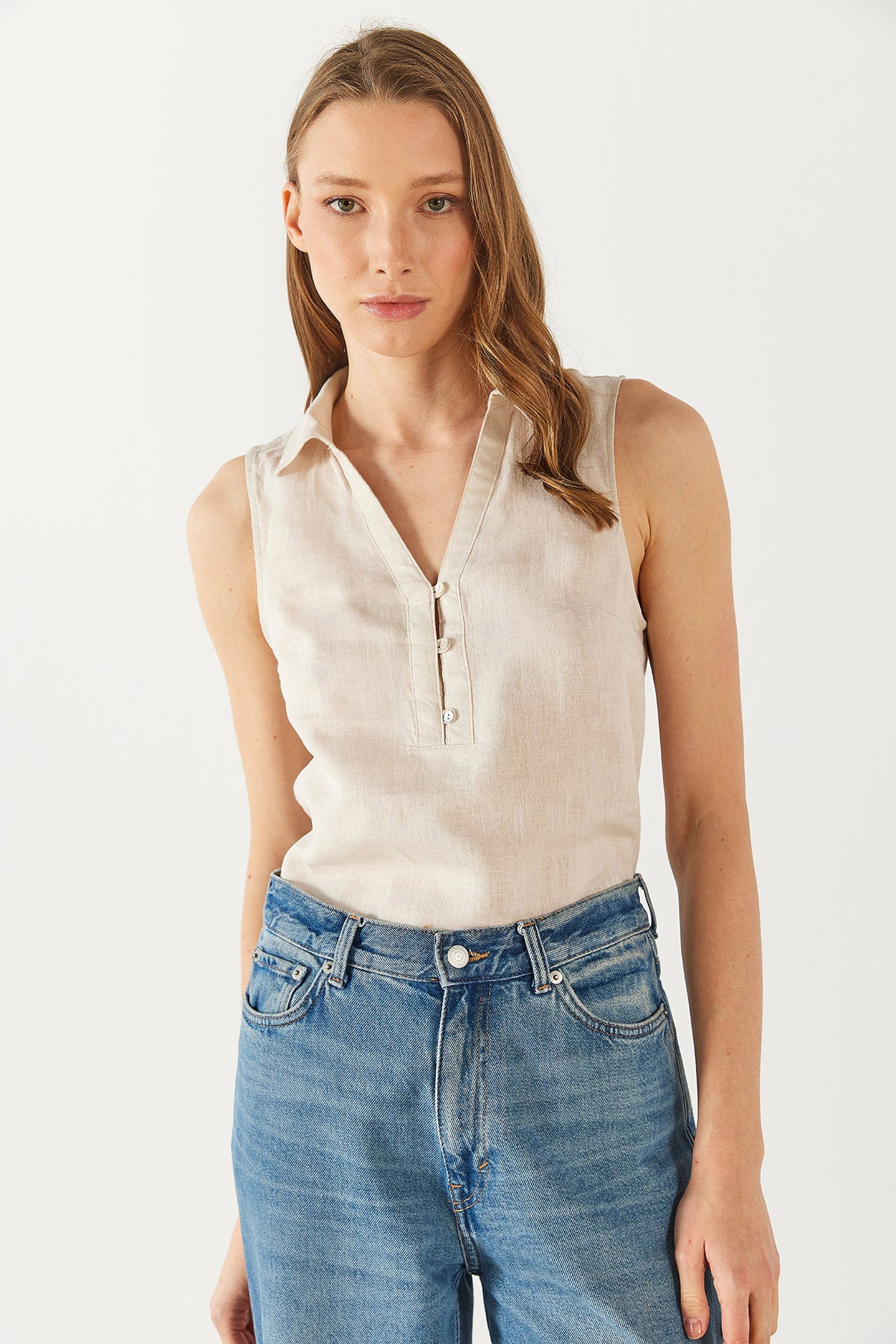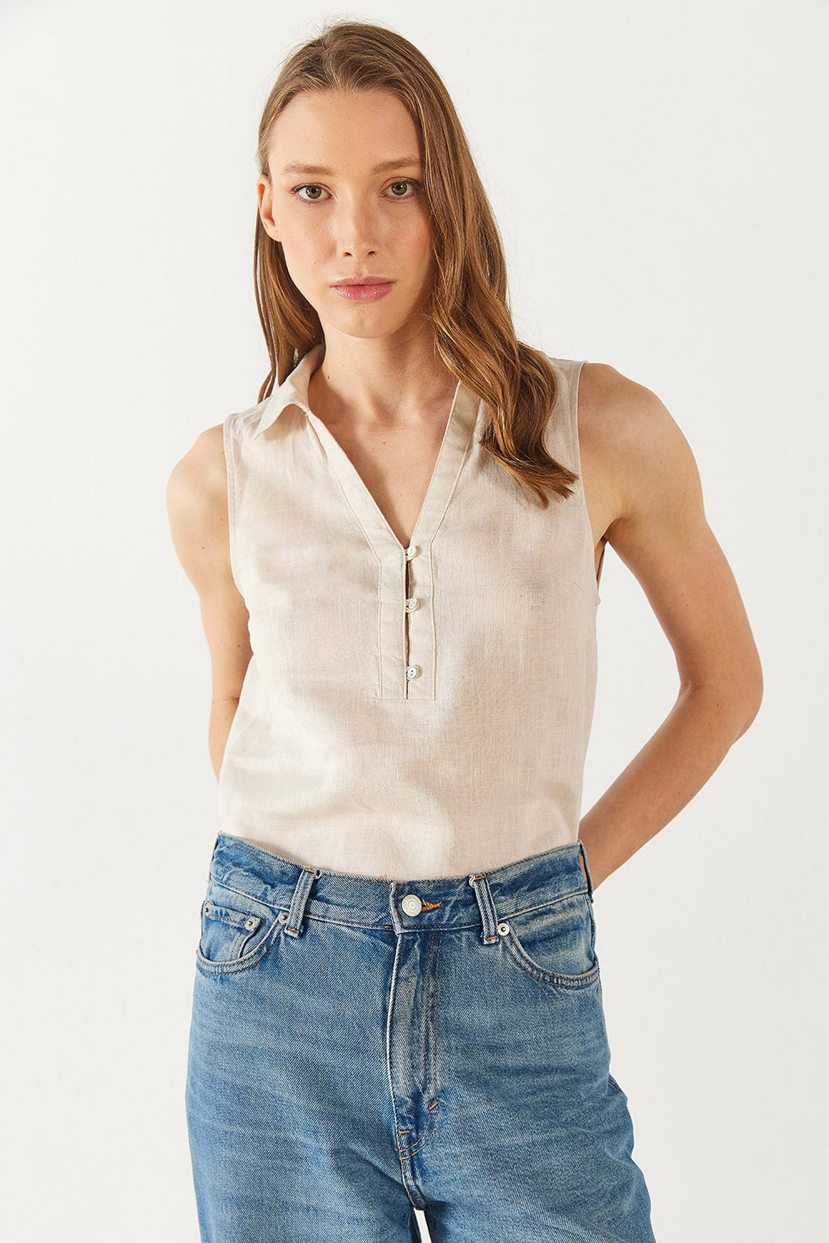 Kadın Darya Gömlek Yaka Kolsuz Bluz %100 Keten - Krem