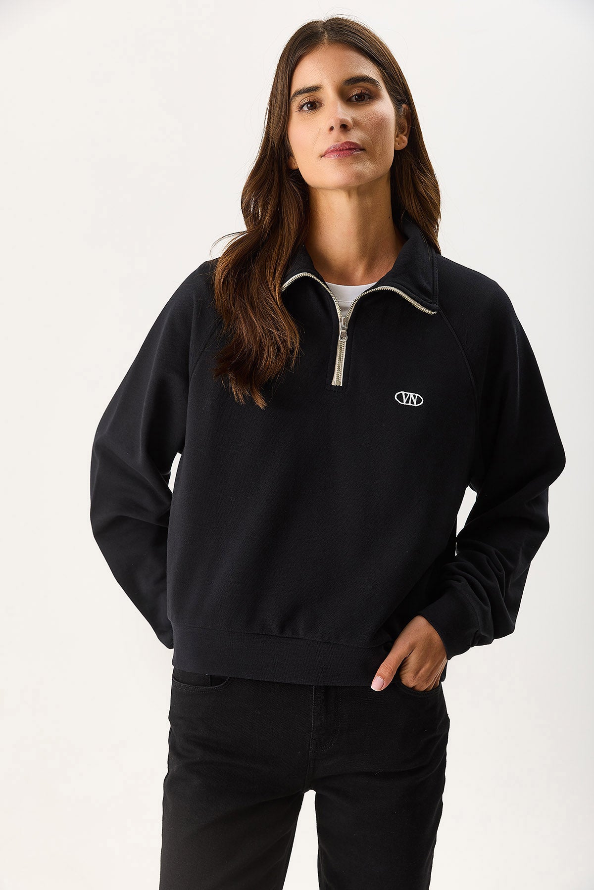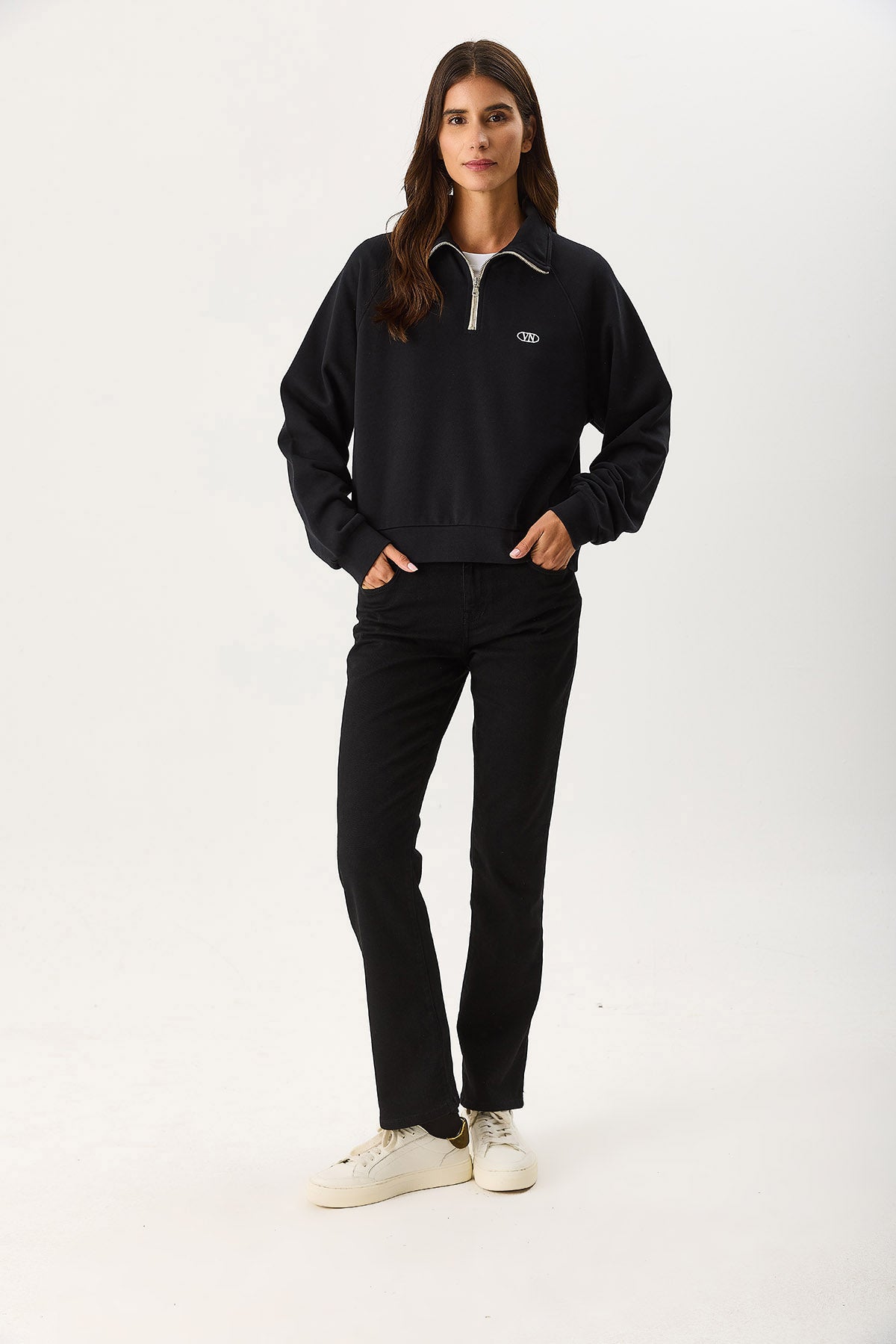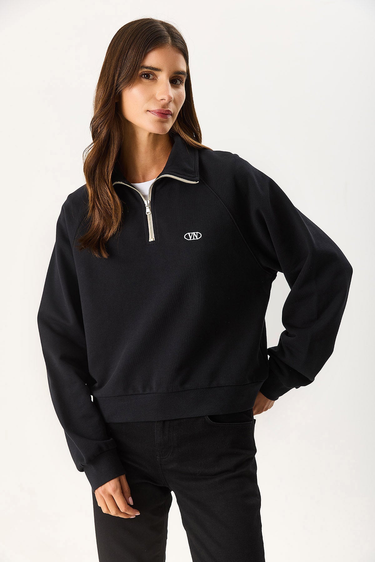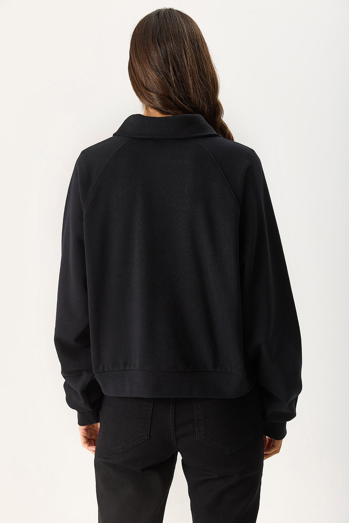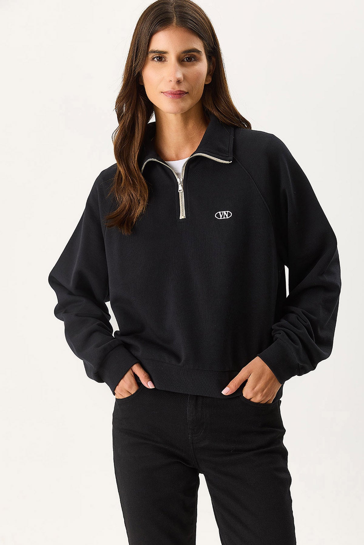 Kadın Eliza Kontrast Fermuar Detaylı Polo Yaka Sweatshirt %100 Pamuk - Siyah