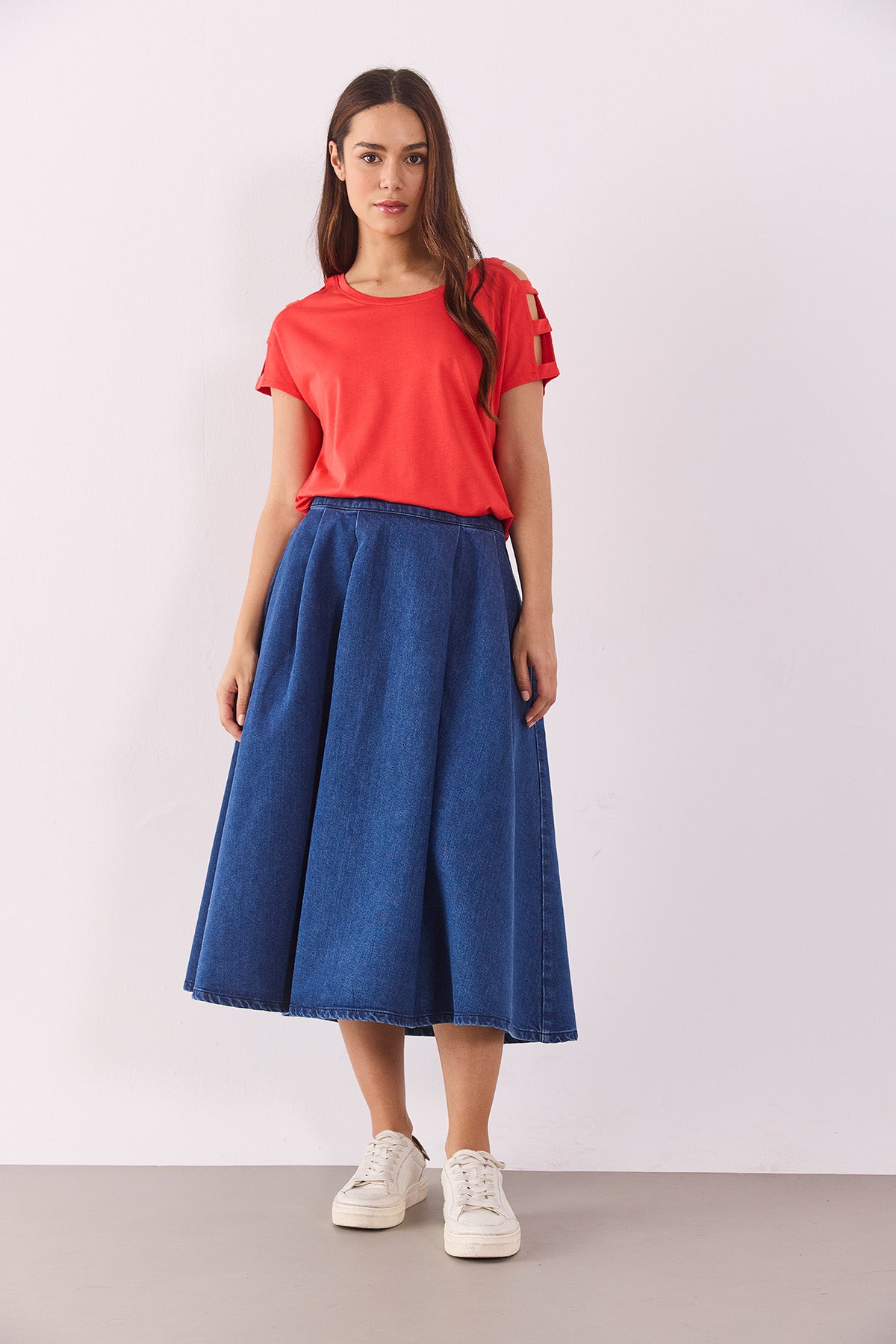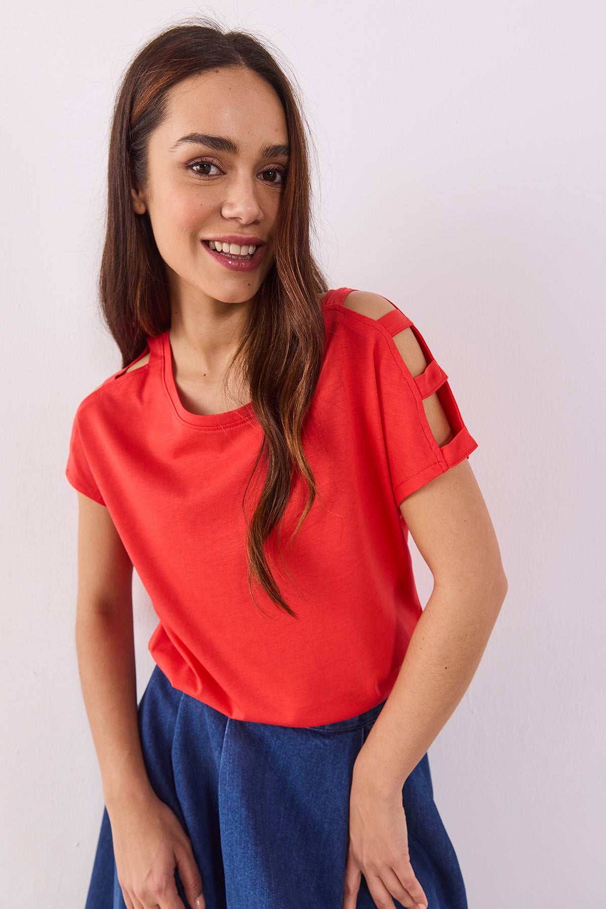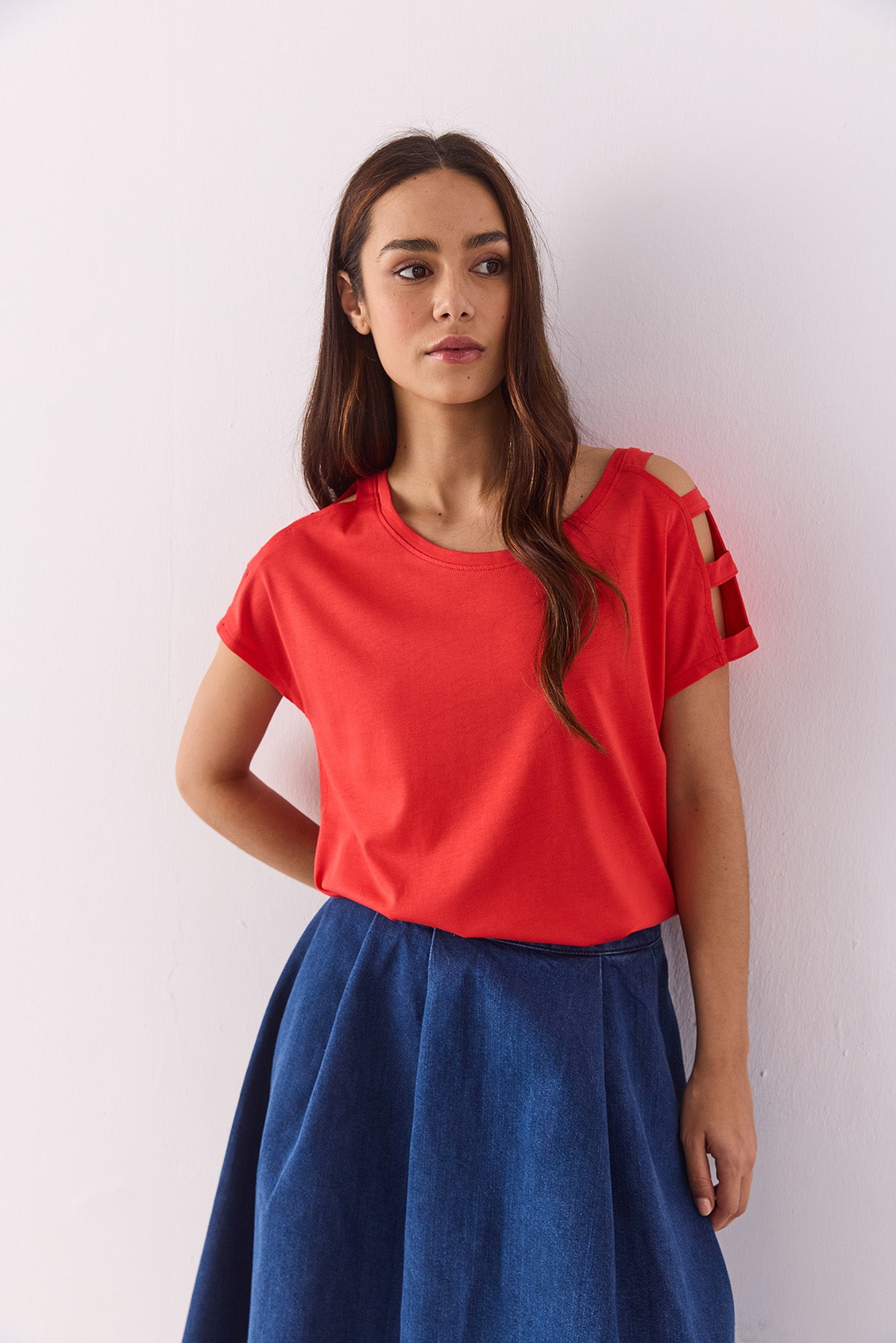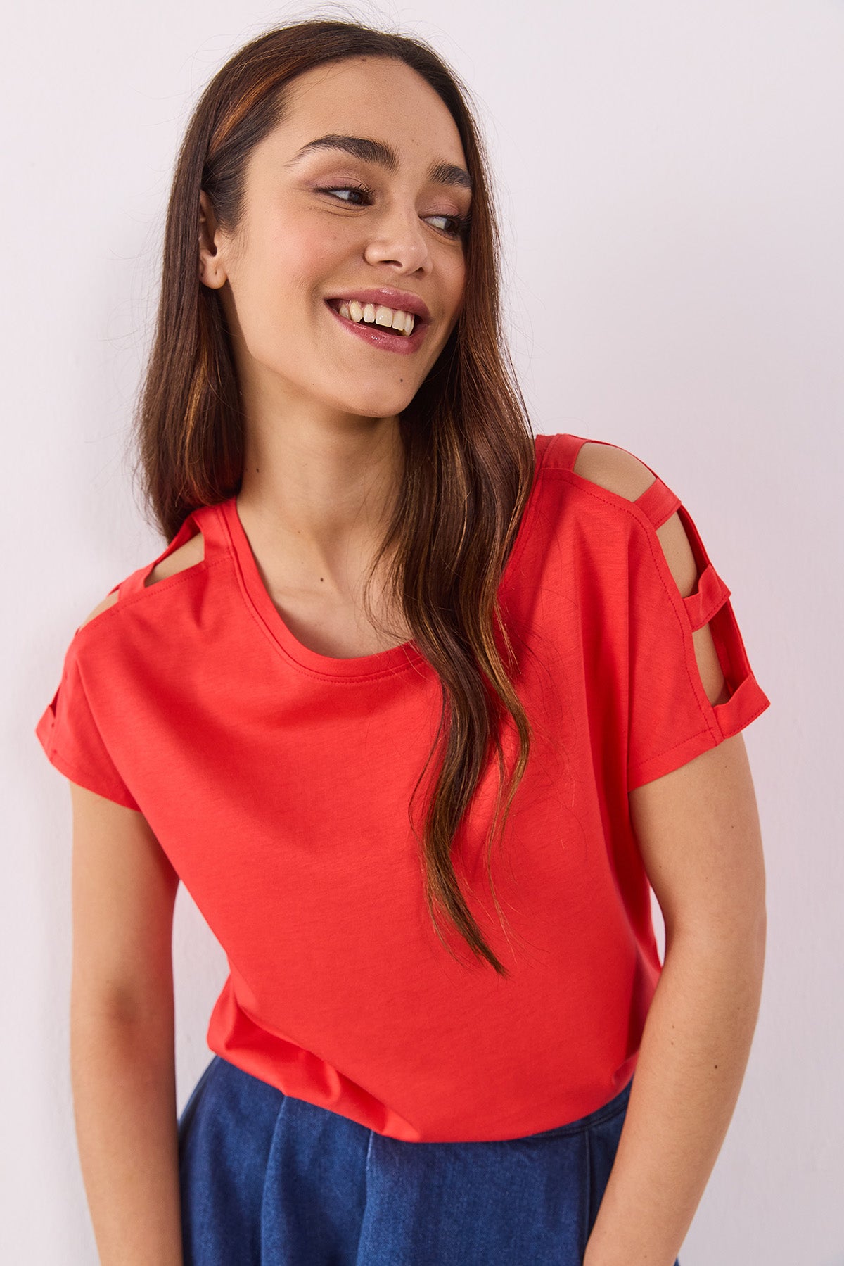 Bisiklet yaka tasarımı ve omuzlarındaki cut-out detaylar, tişörte modern bir dokunuş katarken, regular fit kesimi rahat bir kullanım sağlar. %50 modal ve %50 pamuk karışımı kumaşı sayesinde yumuşak, nefes alabilir ve hafif bir doku sunar.