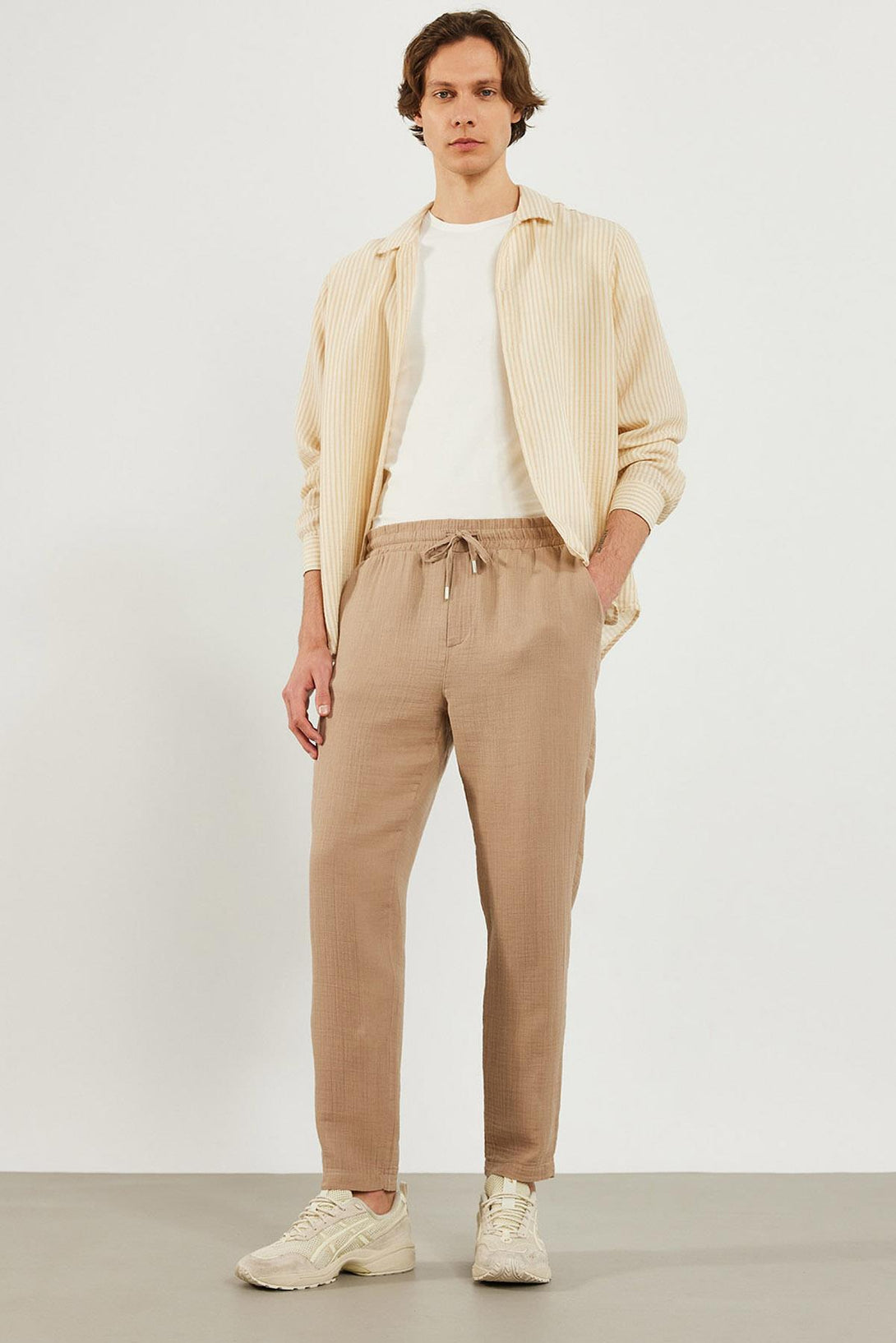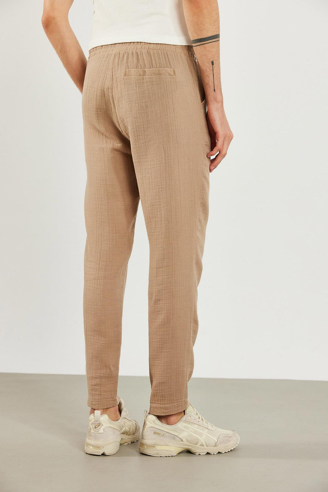 Erkek Beli Lastikli Müslin Chino Pantolon %100 Pamuk - Taş
