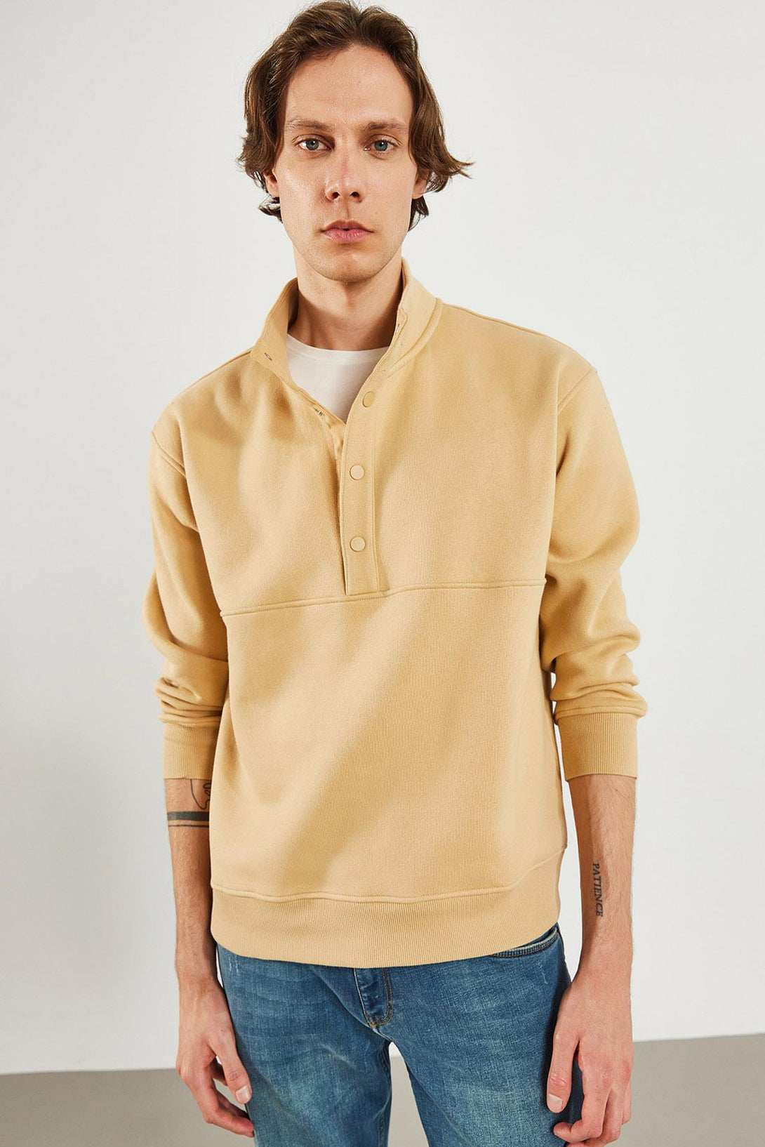 Erkek Dik Yaka Bej Çıt Çıtlı Sweatshirt