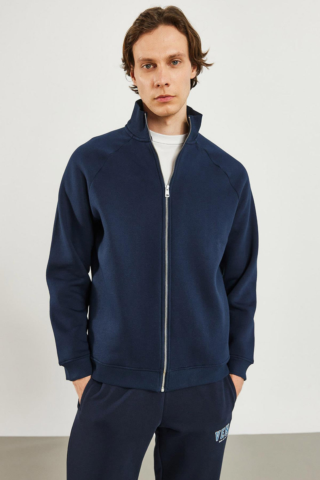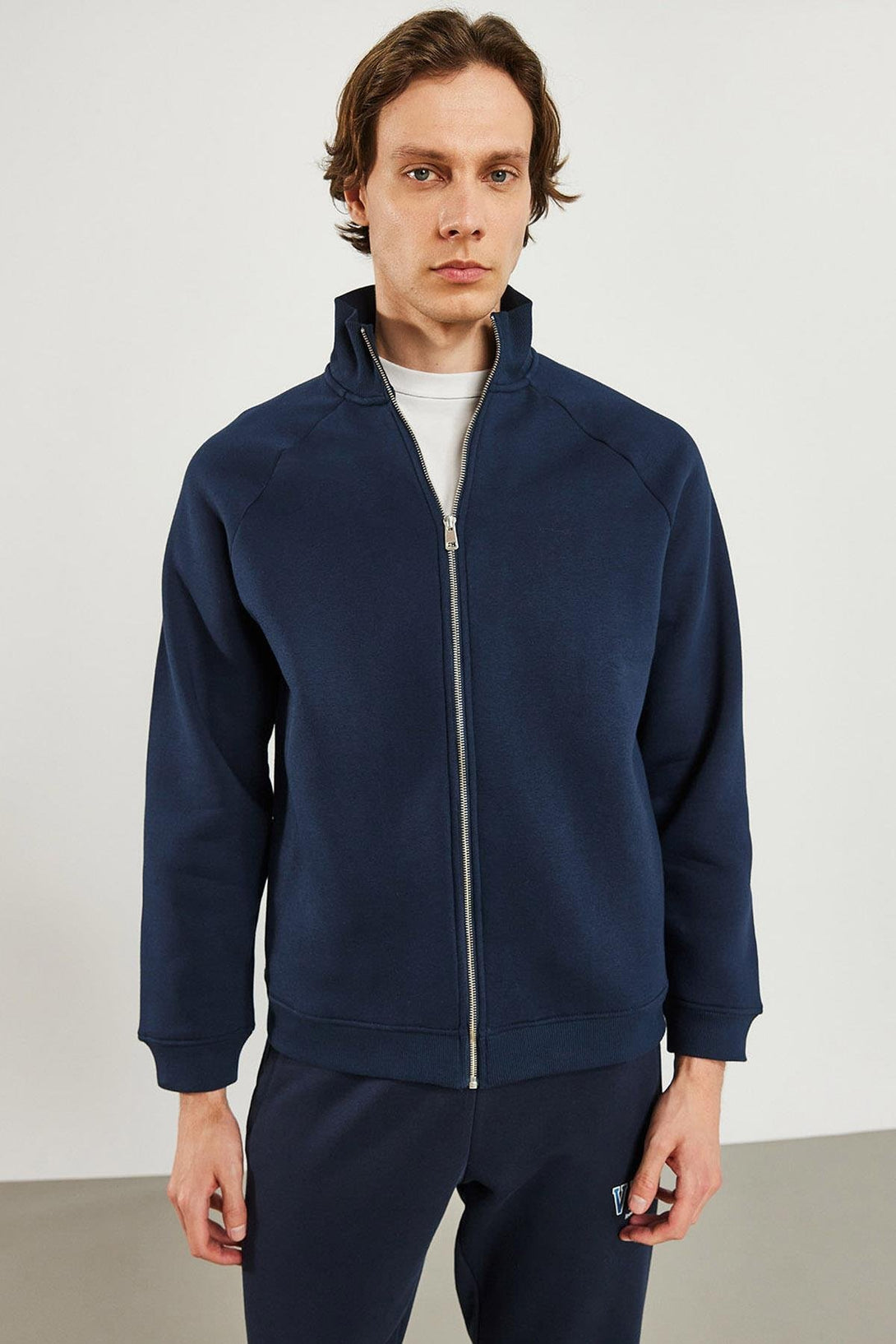 Erkek Dik Yaka Lacivert Oversize Önü Fermuarlı Sweatshirt