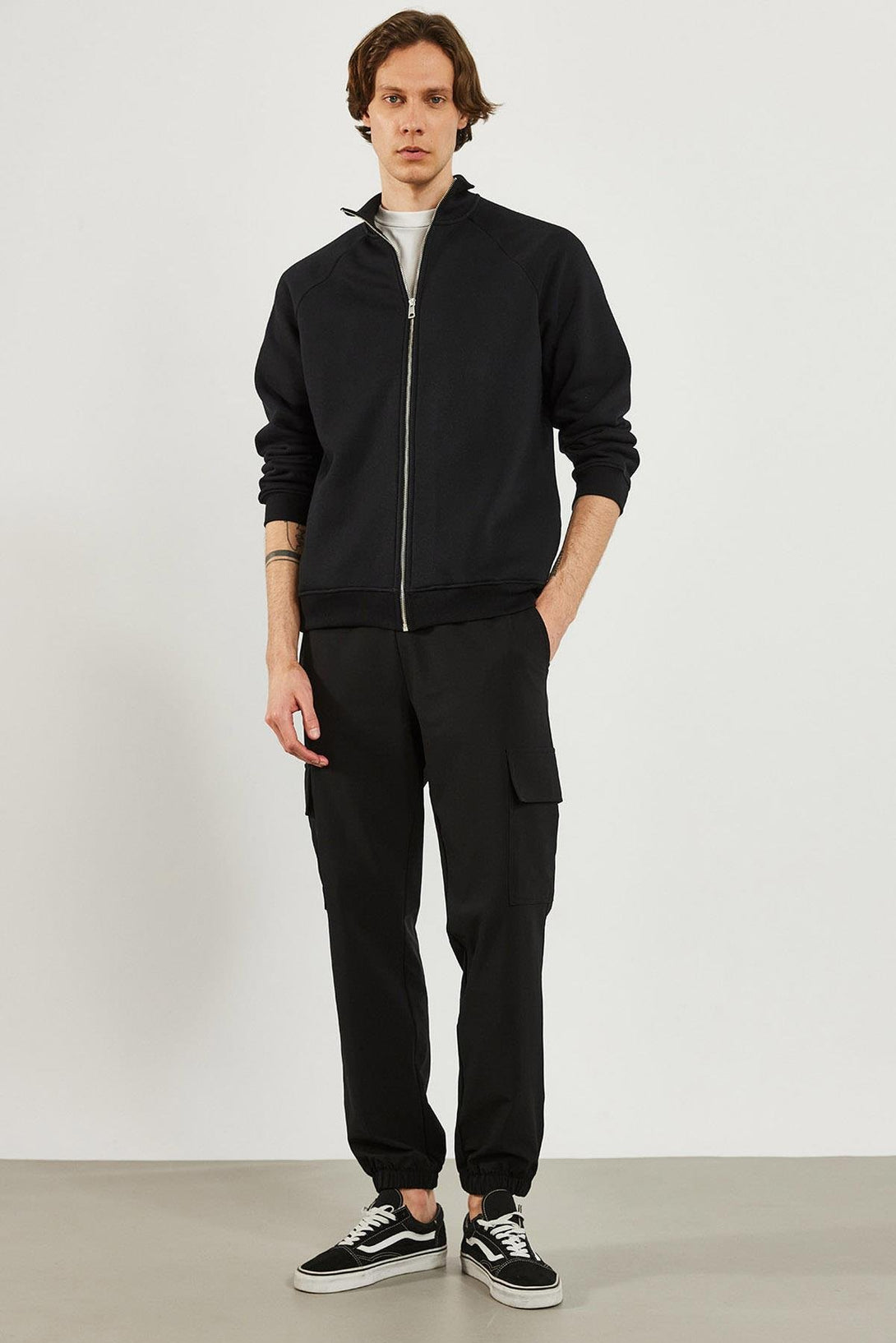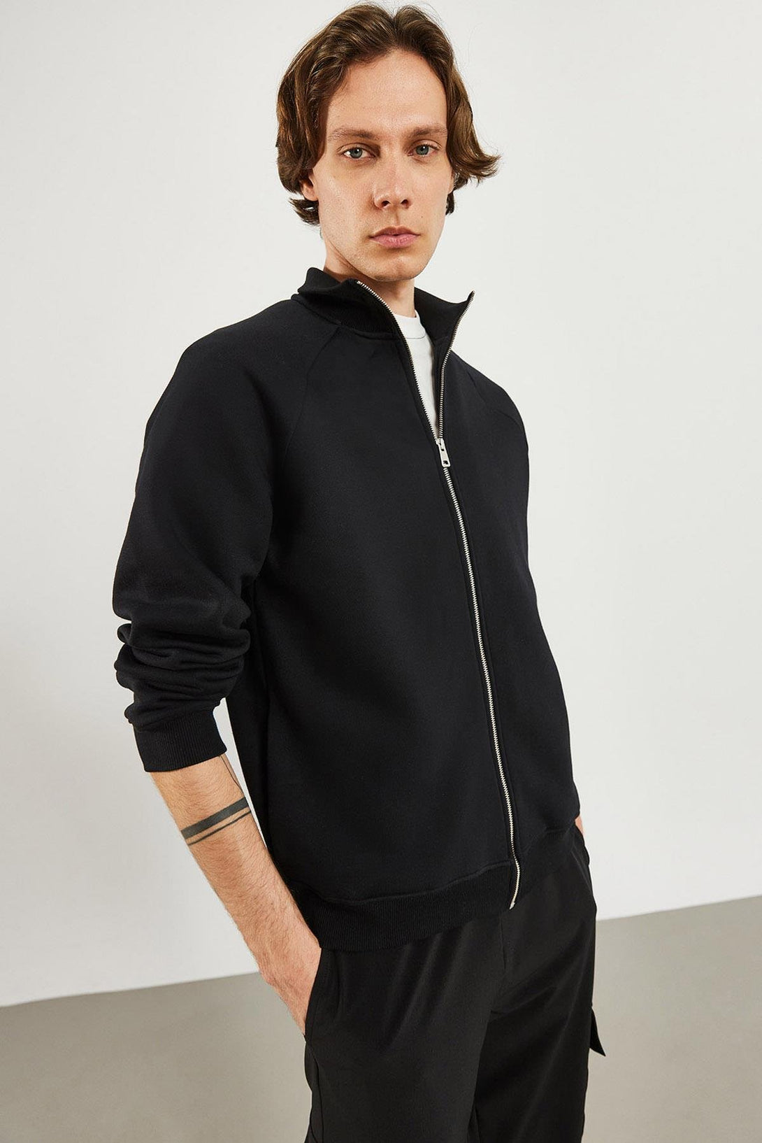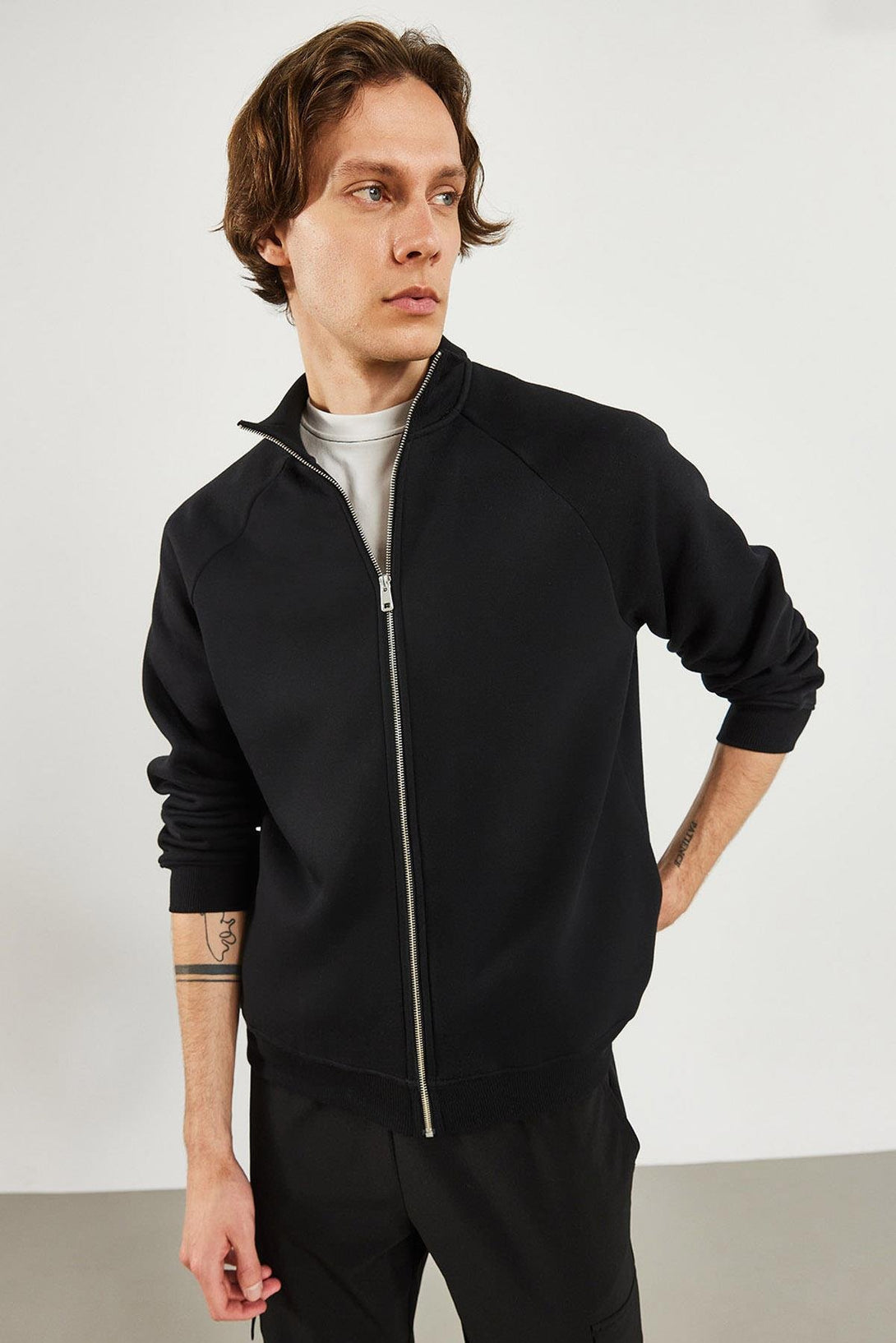 Erkek Dik Yaka Siyah Oversize Önü Fermuarlı Sweatshirt