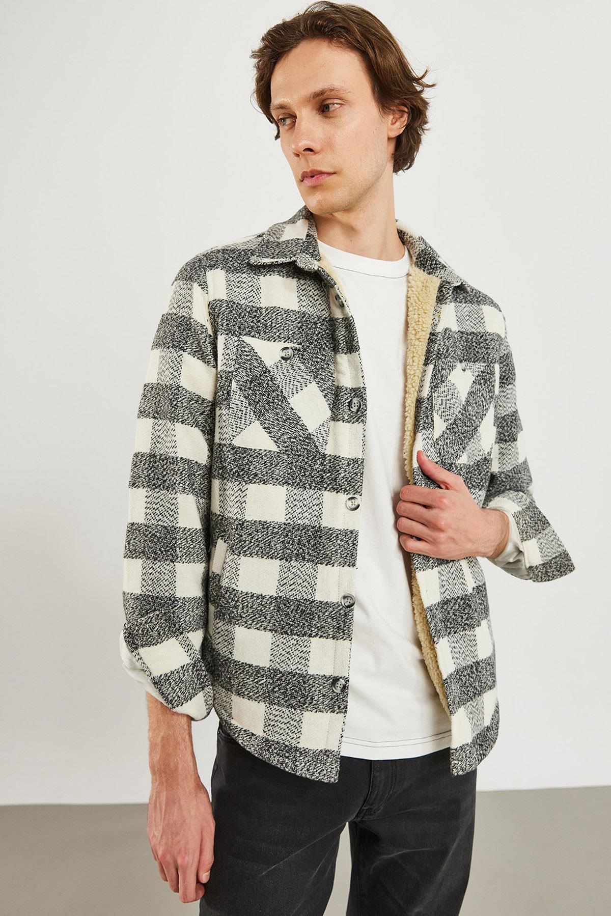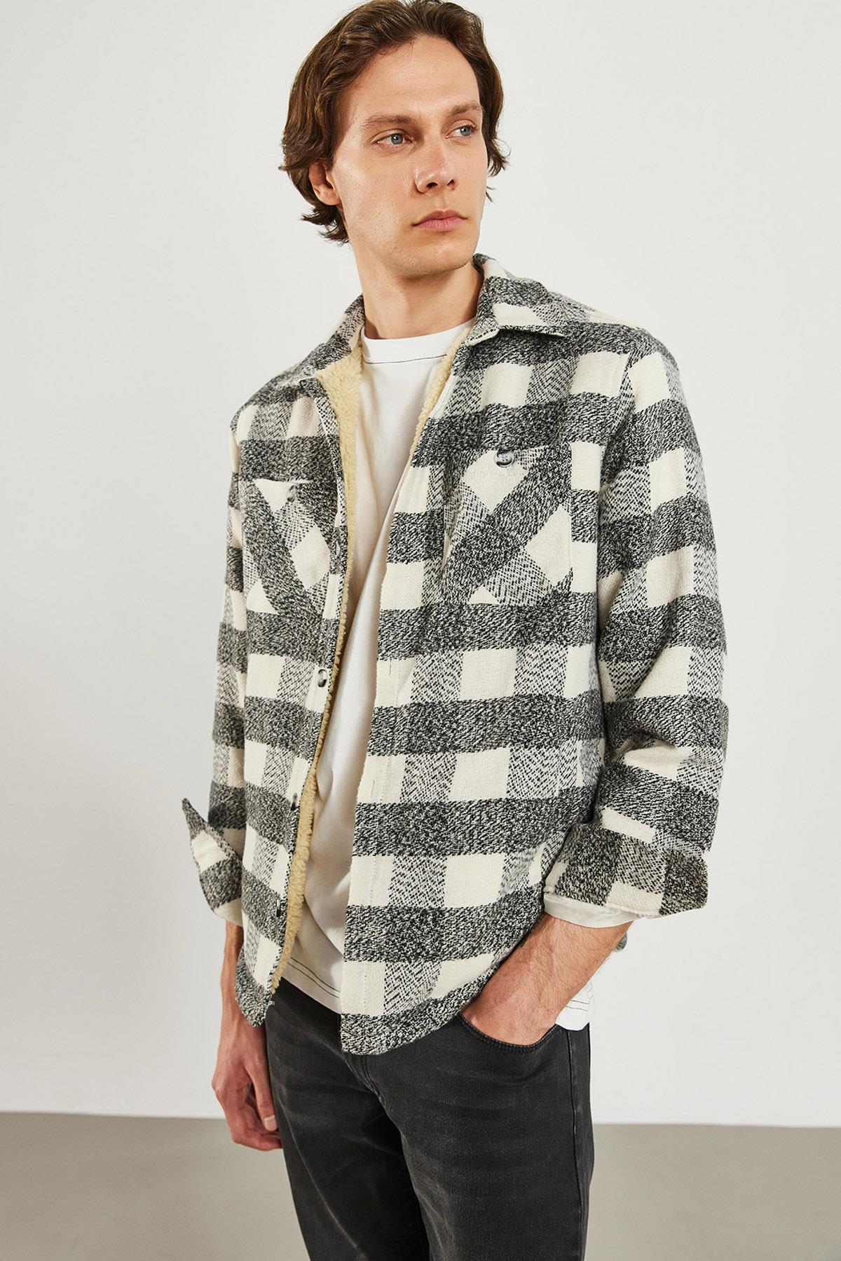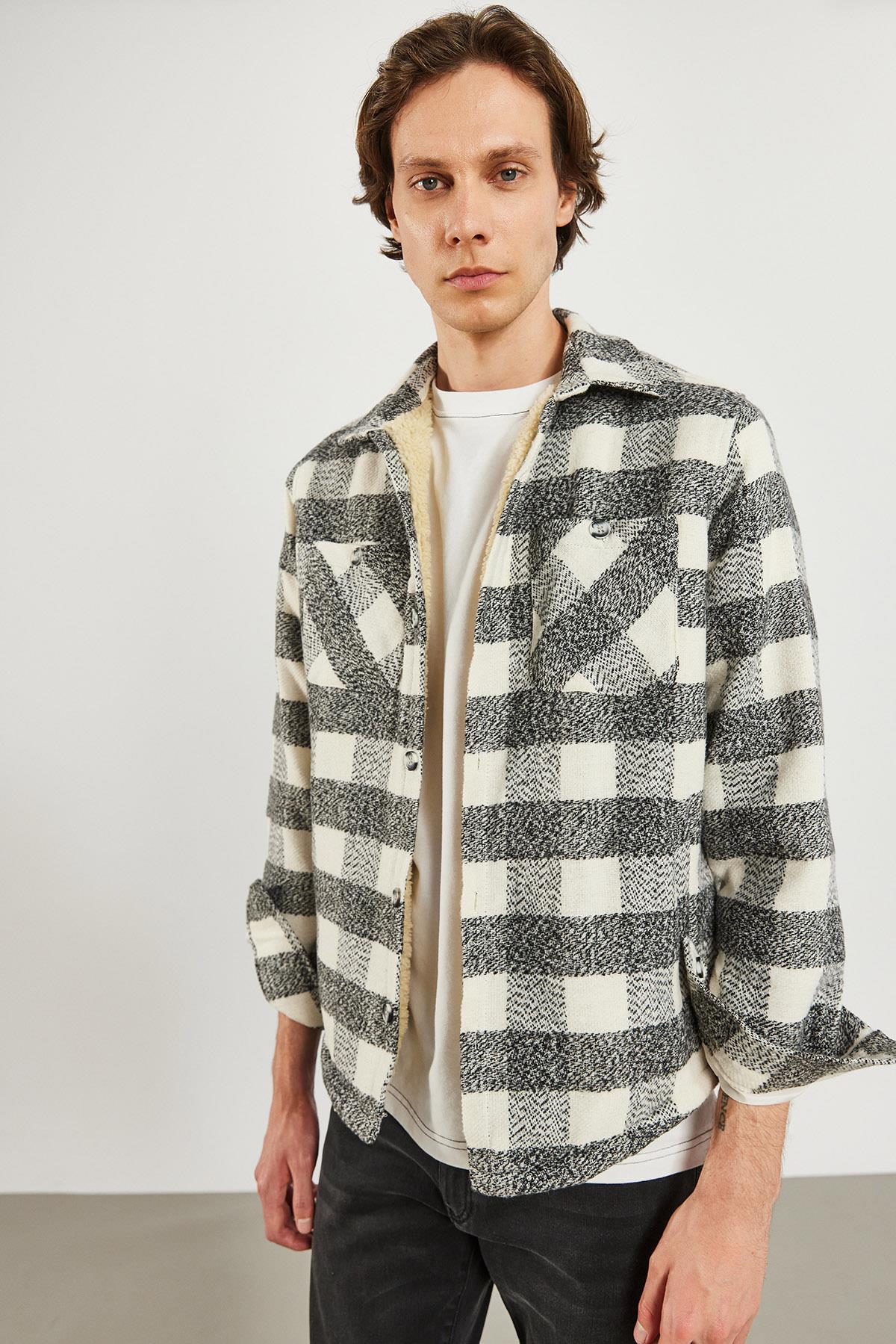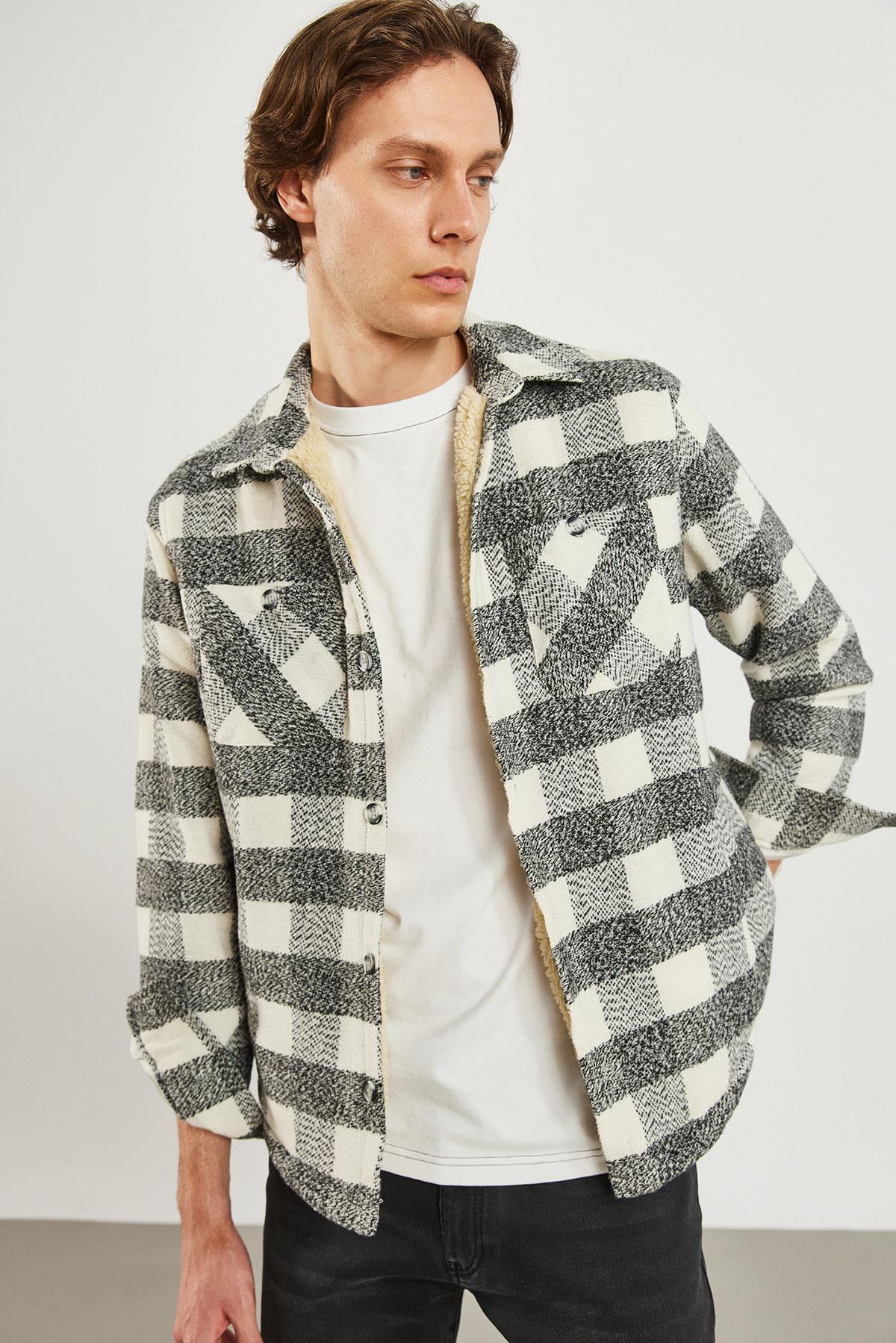 Erkek İçi Peluşlu Ekose Gömlek Ceket - Siyah