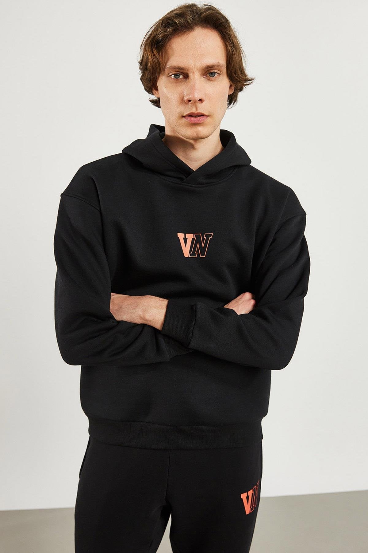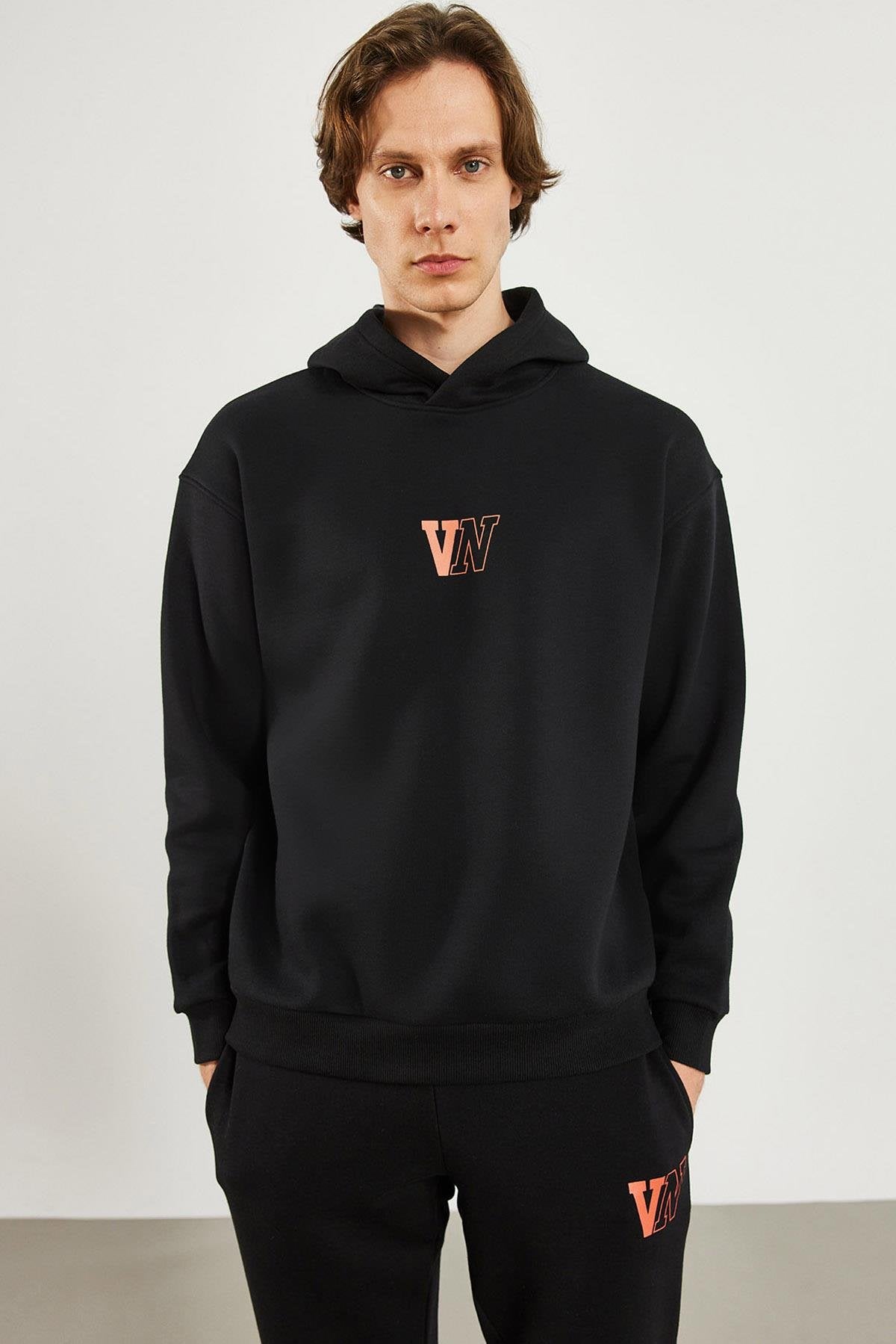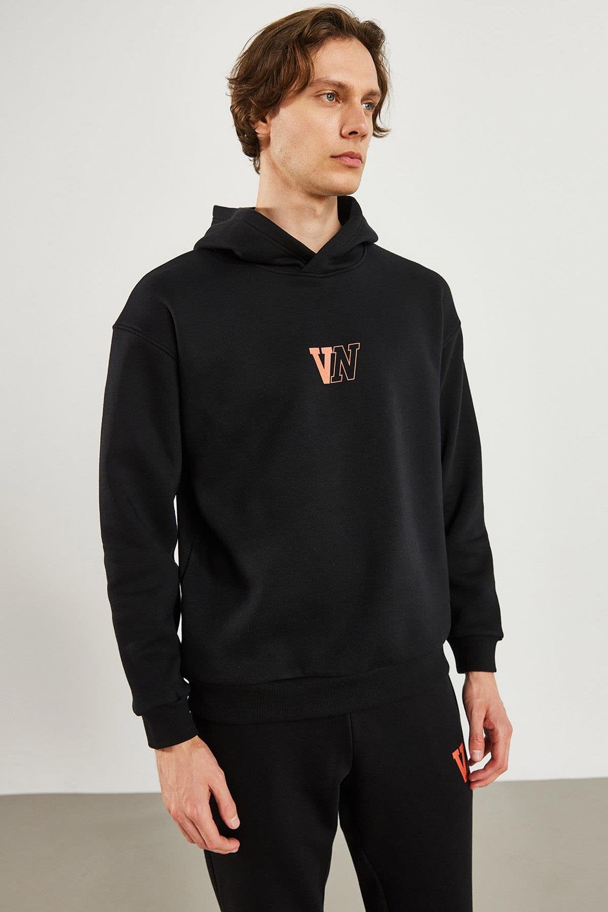 Erkek Kapüşonlu Logo Baskılı Oversize Şardonlu Sweatshirt - Siyah