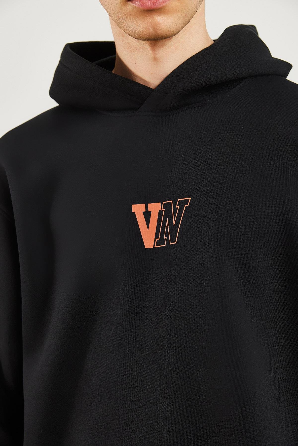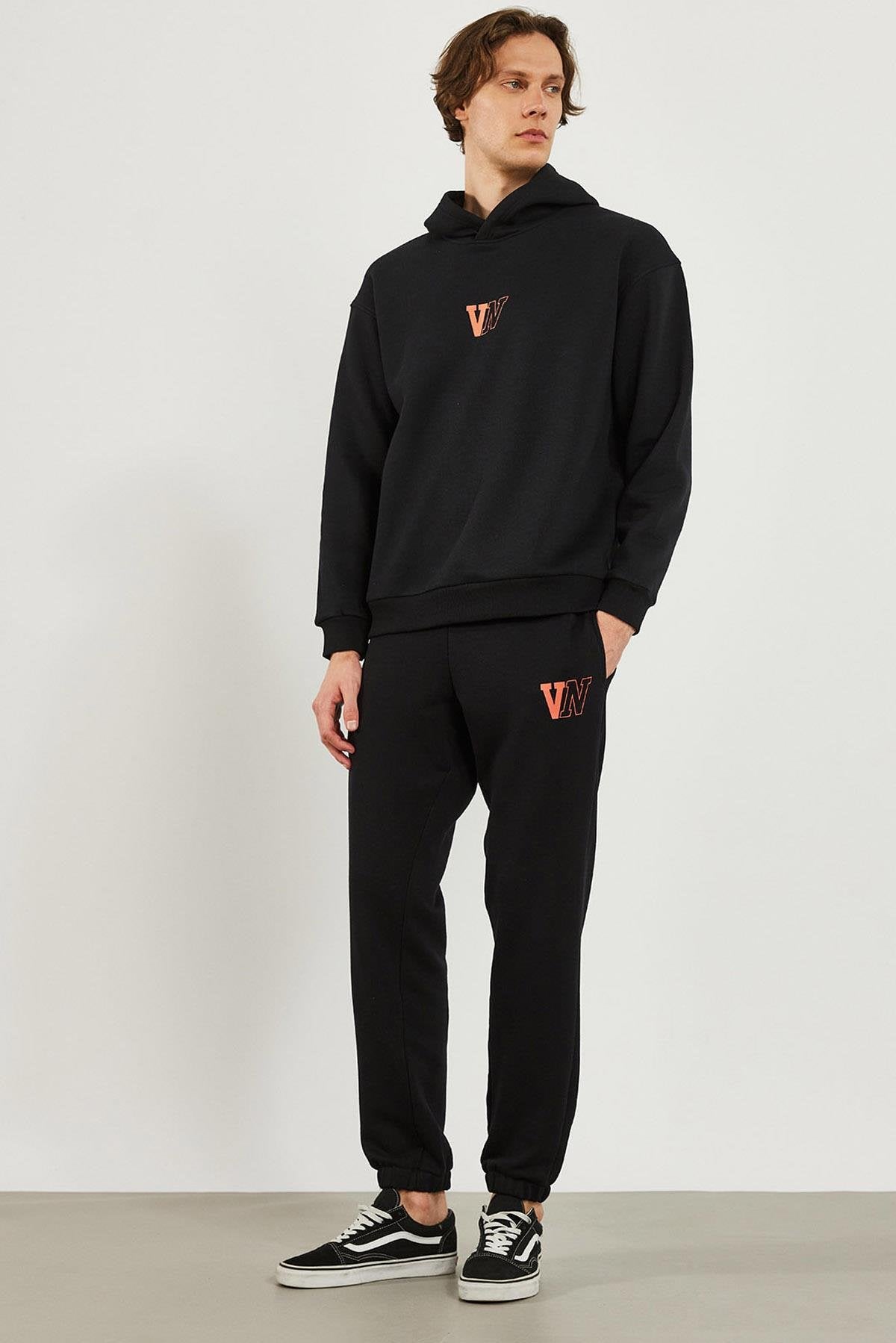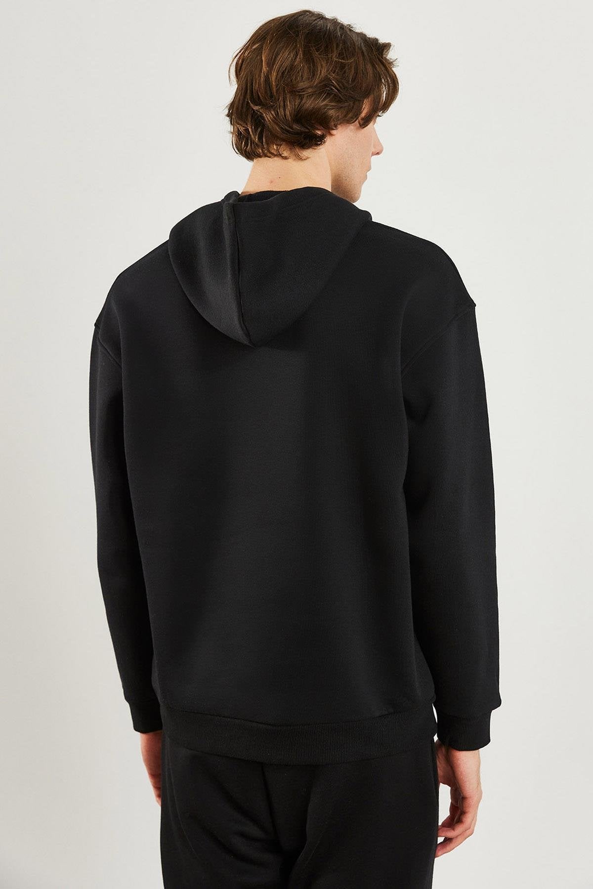Erkek Kapüşonlu Logo Baskılı Oversize Şardonlu Sweatshirt - Siyah