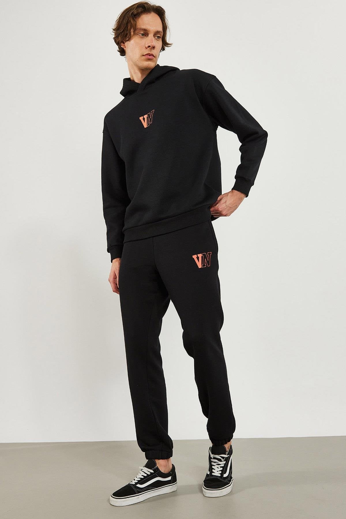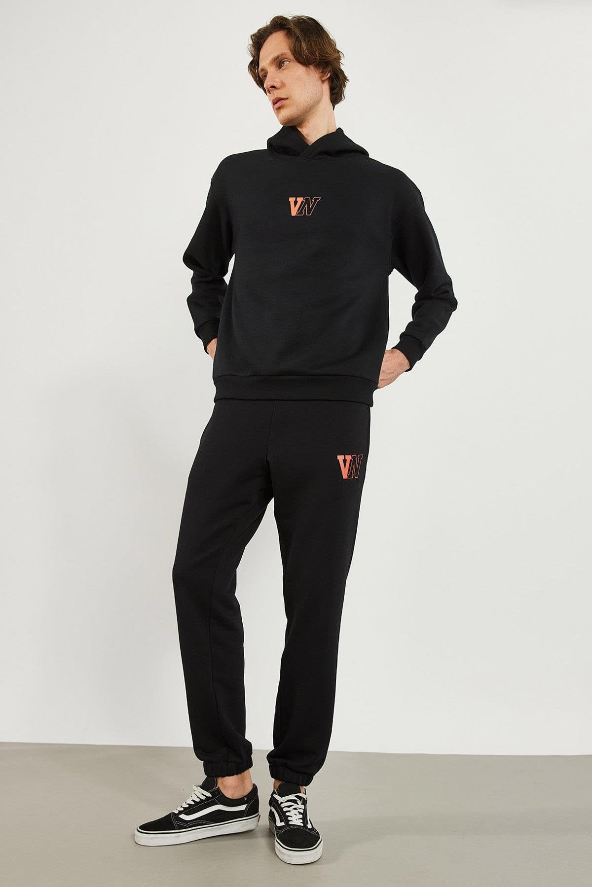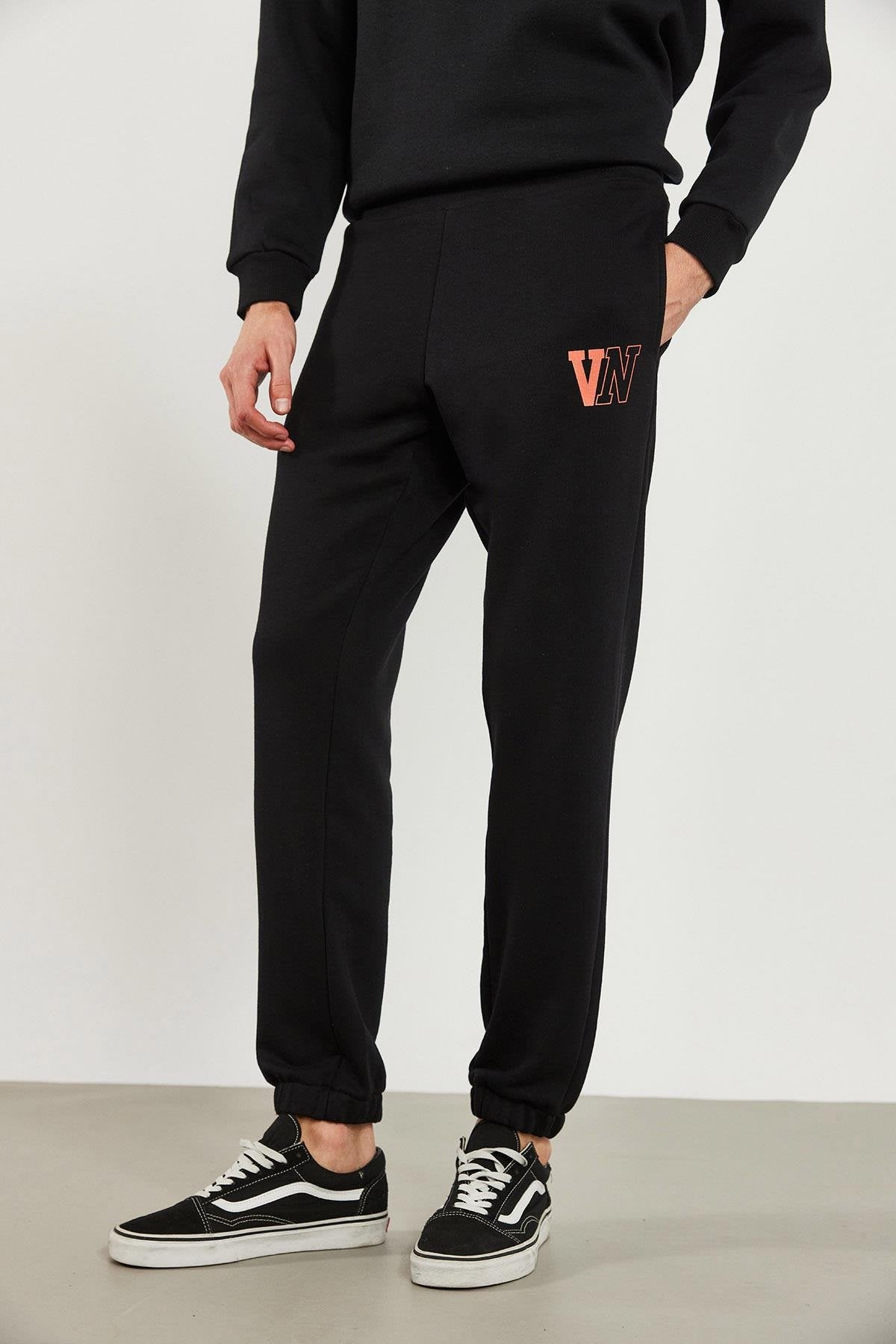 Erkek Paçası Lastikli Logo Baskılı Eşofman Altı - Siyah