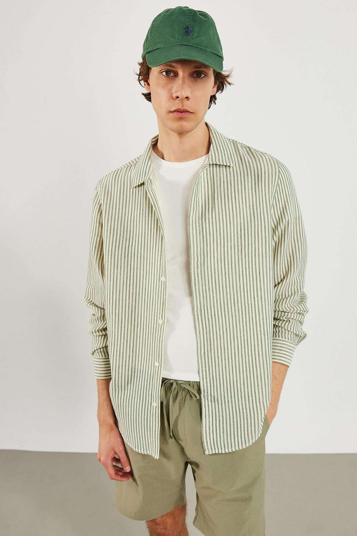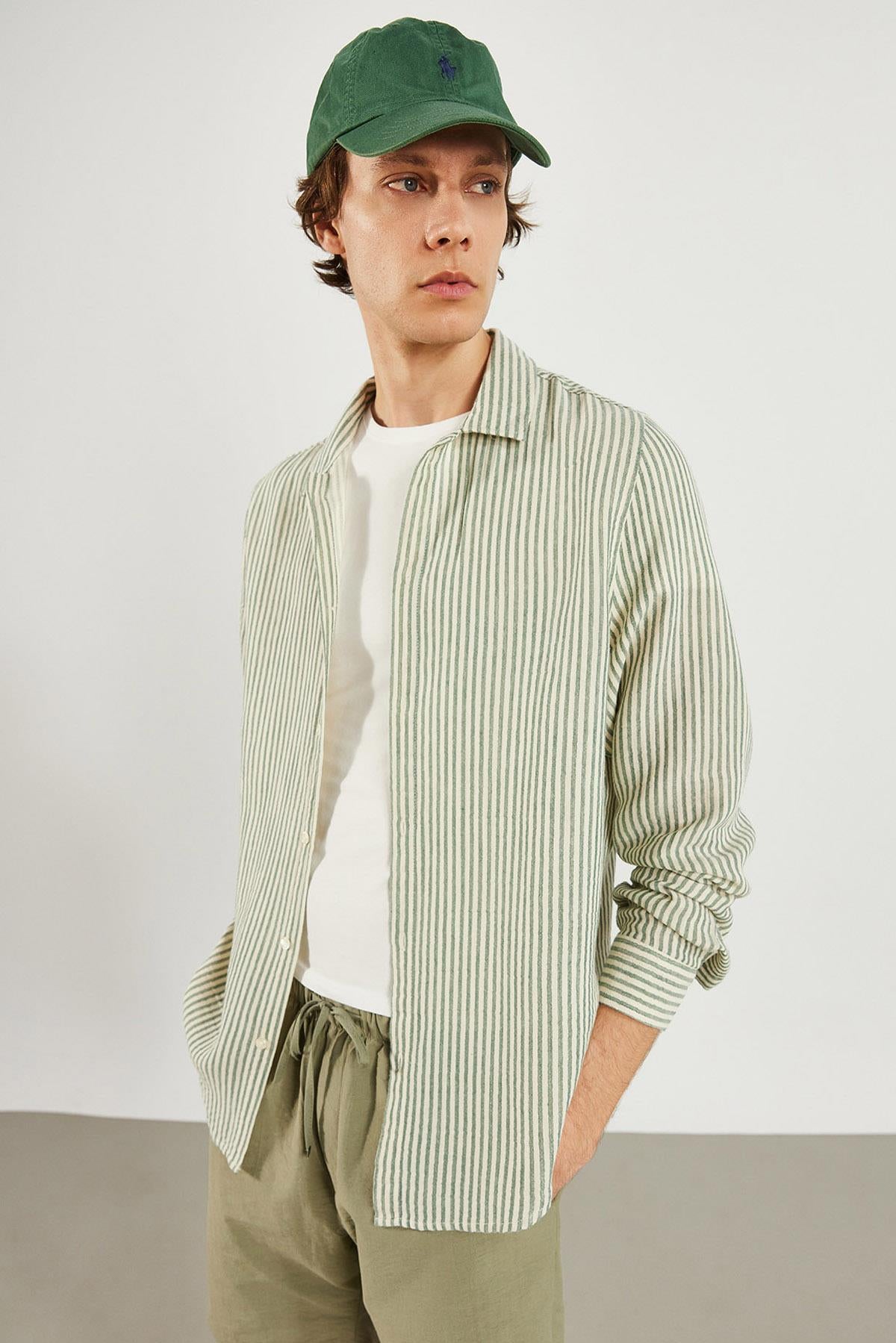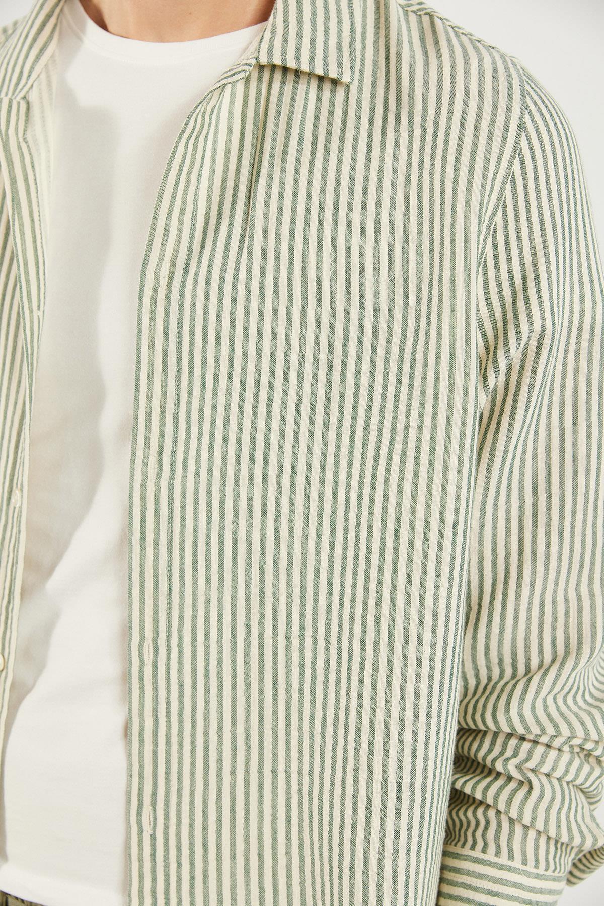 Erkek Regular Fit Çizgili Armürlü Gömlek %100 Pamuk - Haki