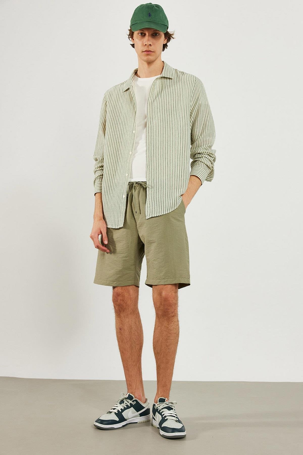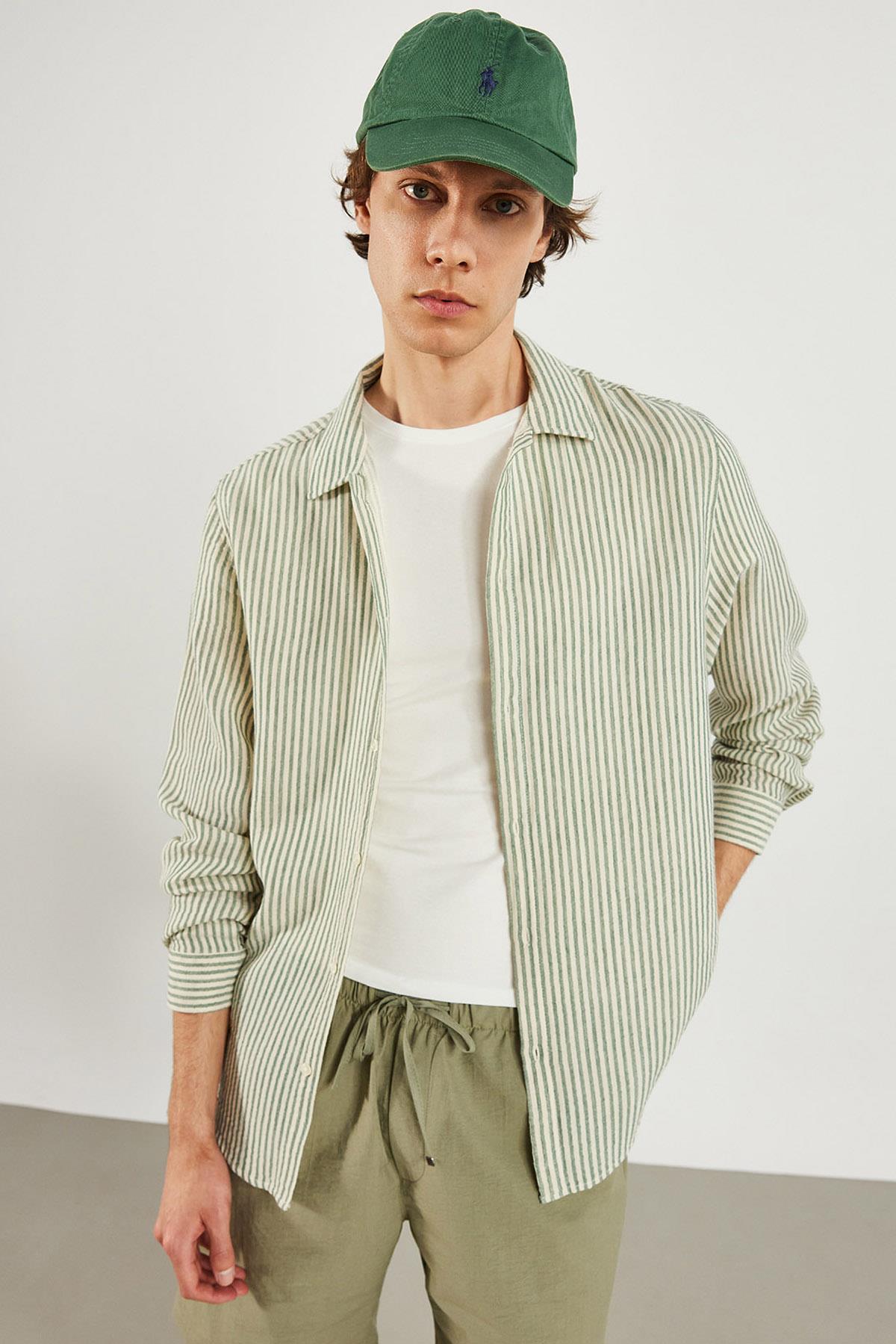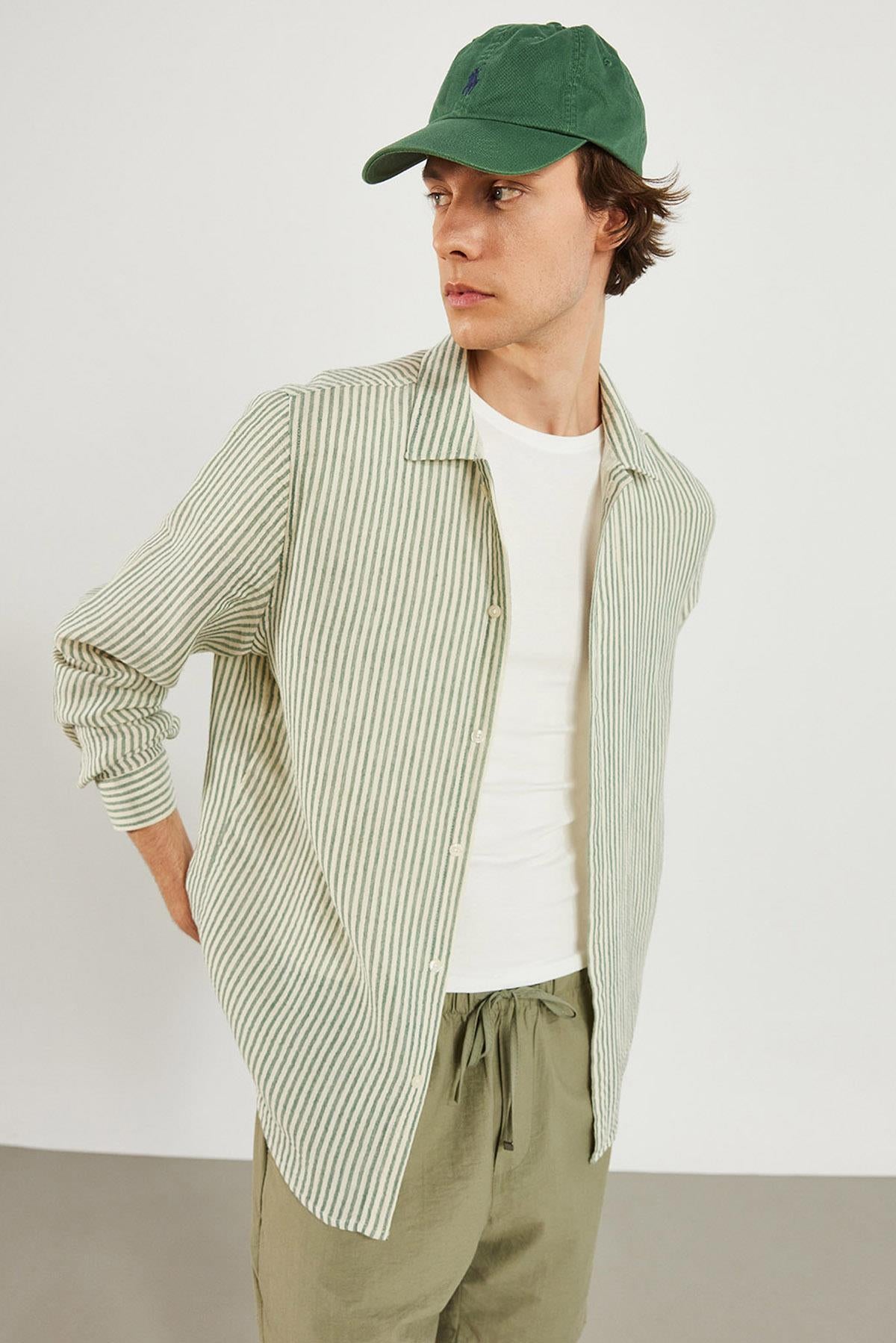Erkek Regular Fit Çizgili Armürlü Gömlek %100 Pamuk - Haki