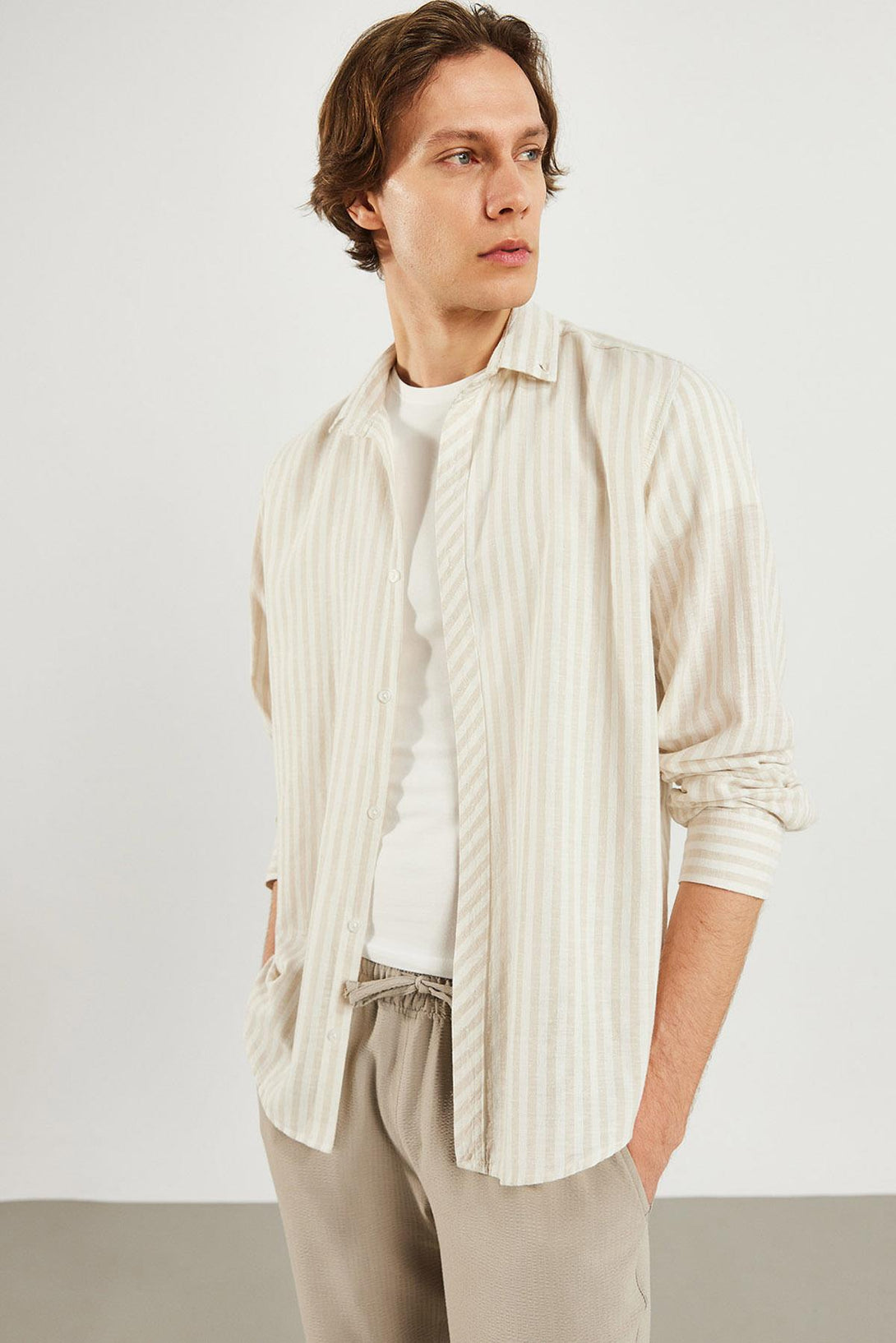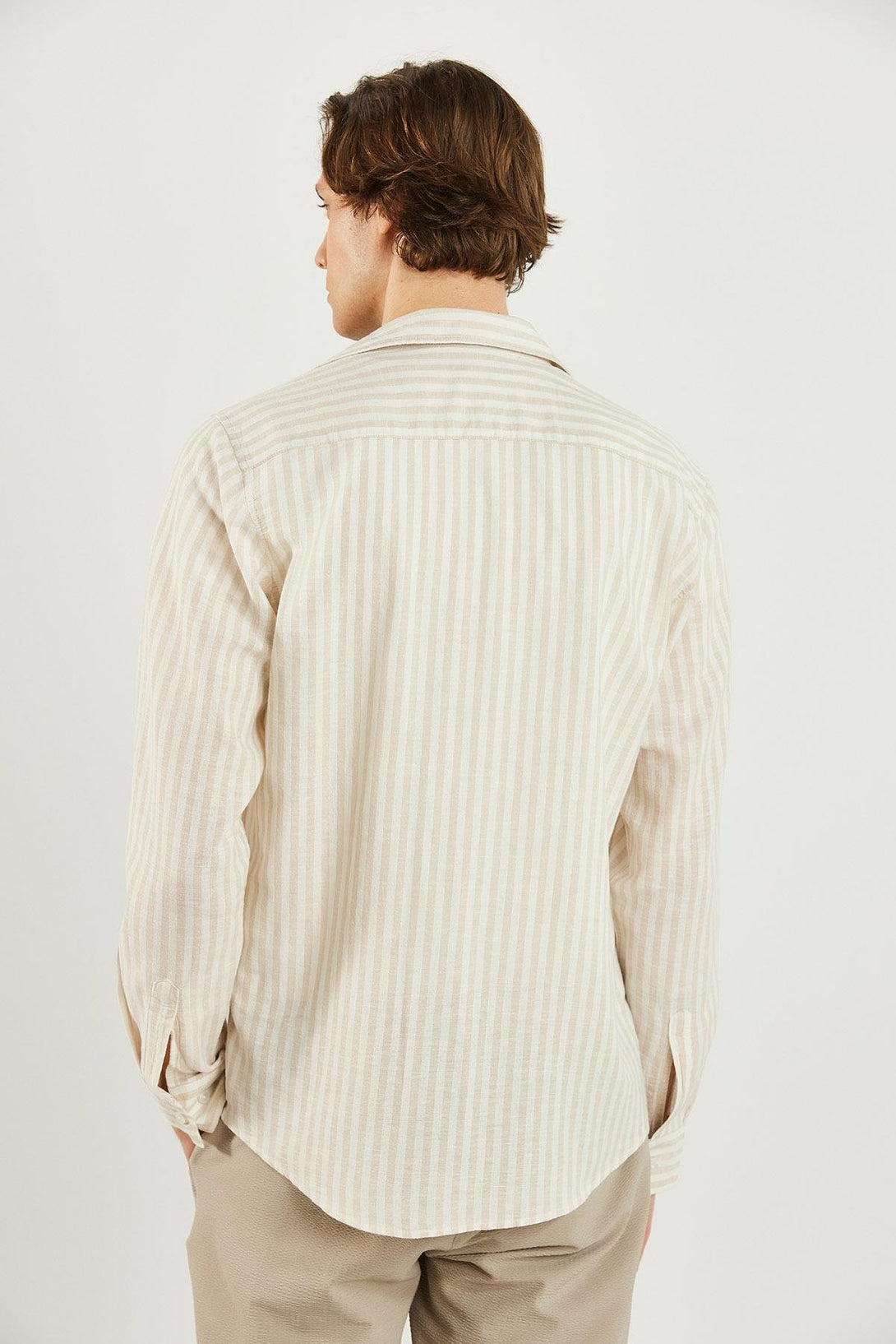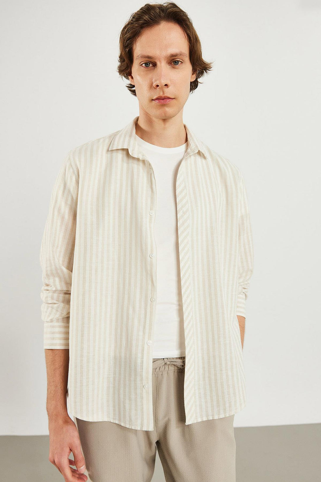 Erkek Steven Regular Fit Bej Çizgili Oxford Gömlek