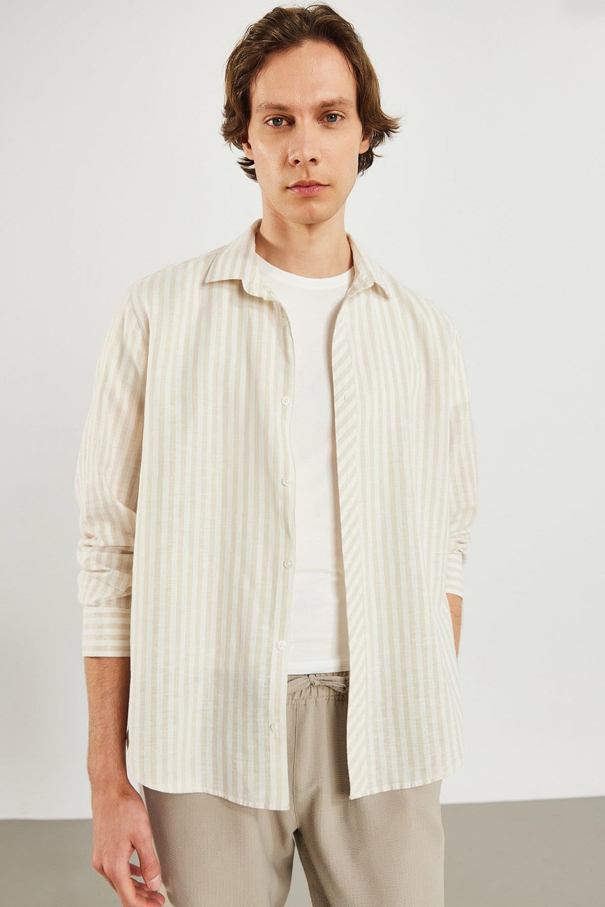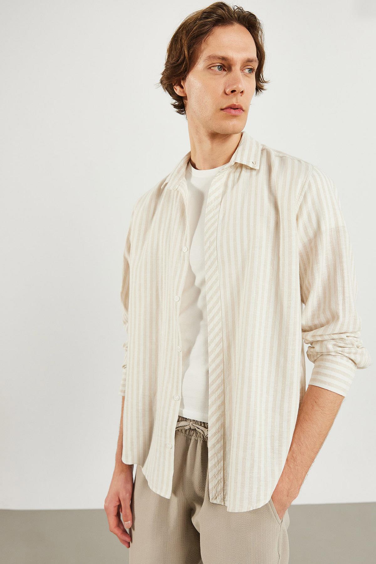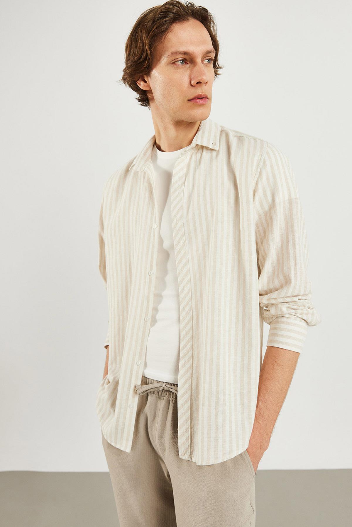 Erkek Steven Regular Fit Çizgili Oxford Gömlek %100 Pamuk - Bej Çizgili