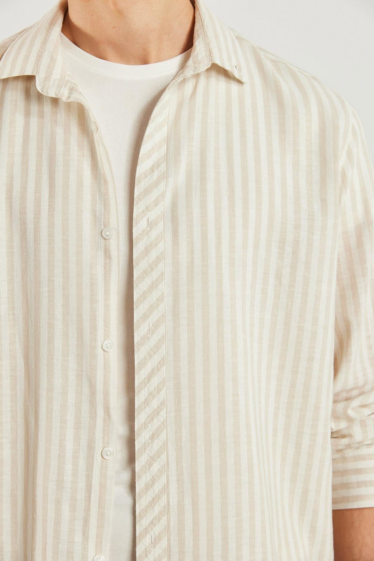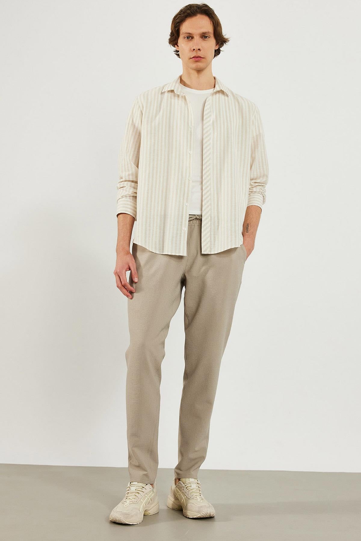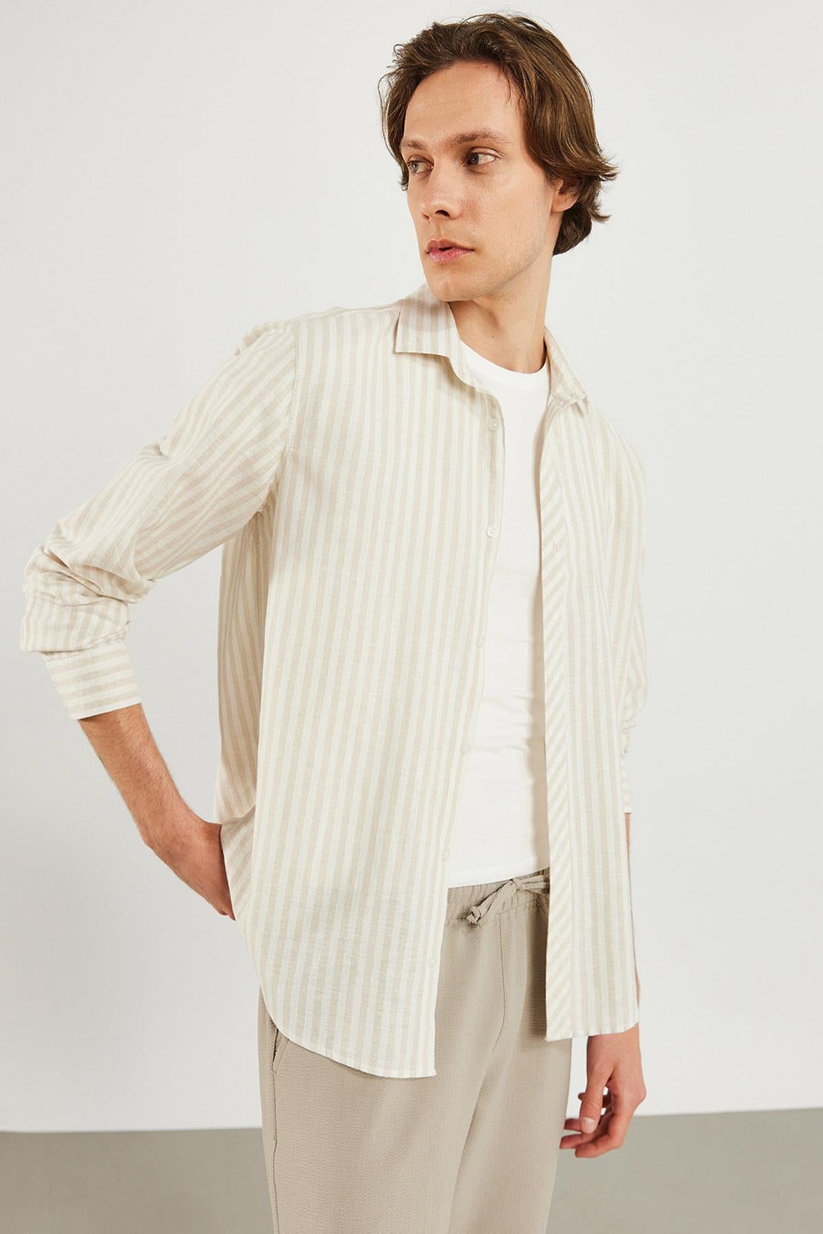 Erkek Steven Regular Fit Çizgili Oxford Gömlek %100 Pamuk - Bej Çizgili