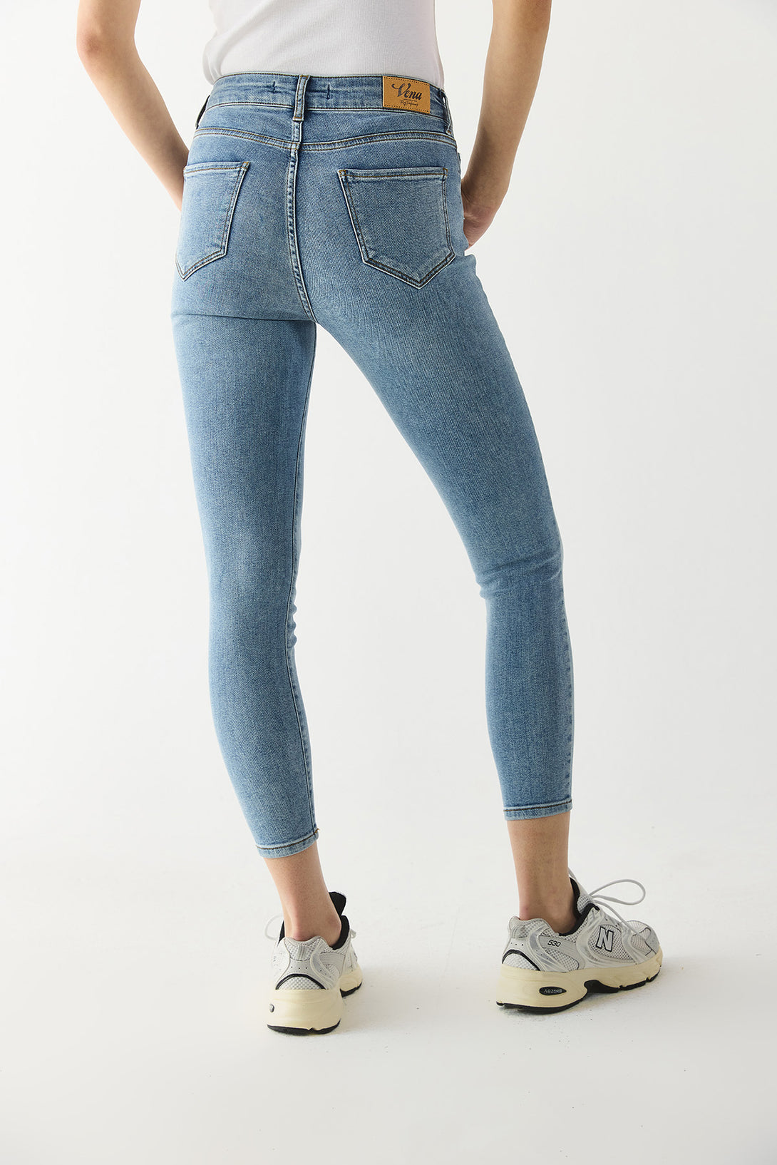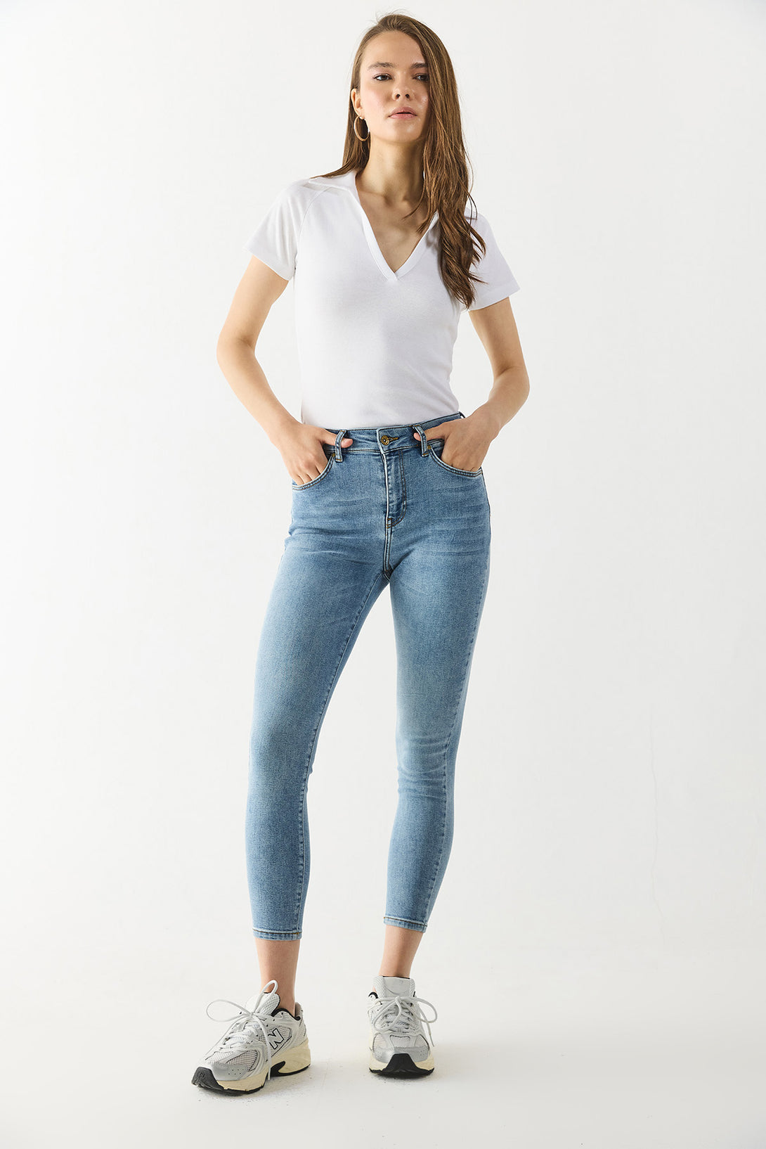 Orta bel, beli ve baseni kavrayan, vücudu saran jean pantolon. Dar kesimi ve dar paçasıyla klasik fitler arasındadır. Paça boyu bilek hizasında. Pantolon çift boy tasarlanmıştır, ölçülerinize göre size uygun boyu tercih edebilirsiniz.