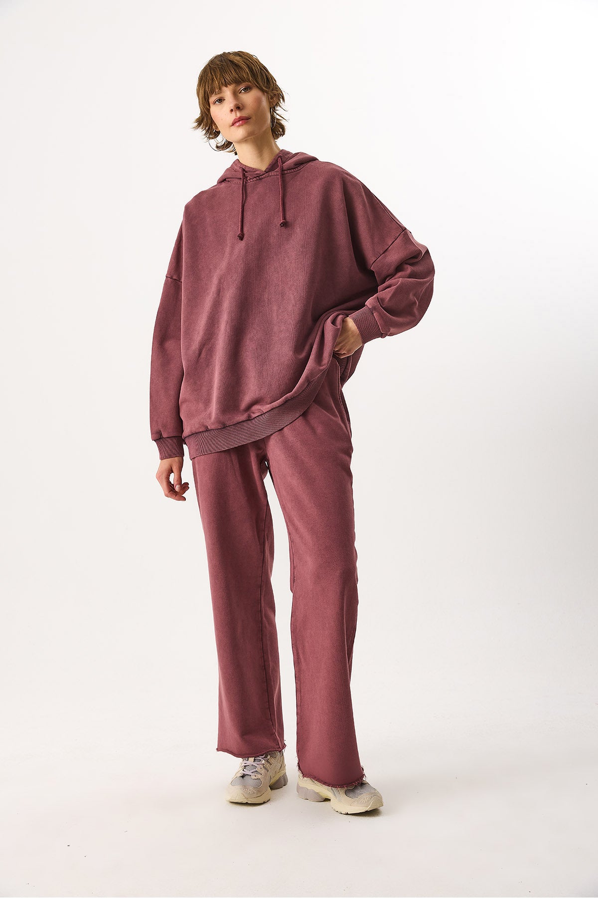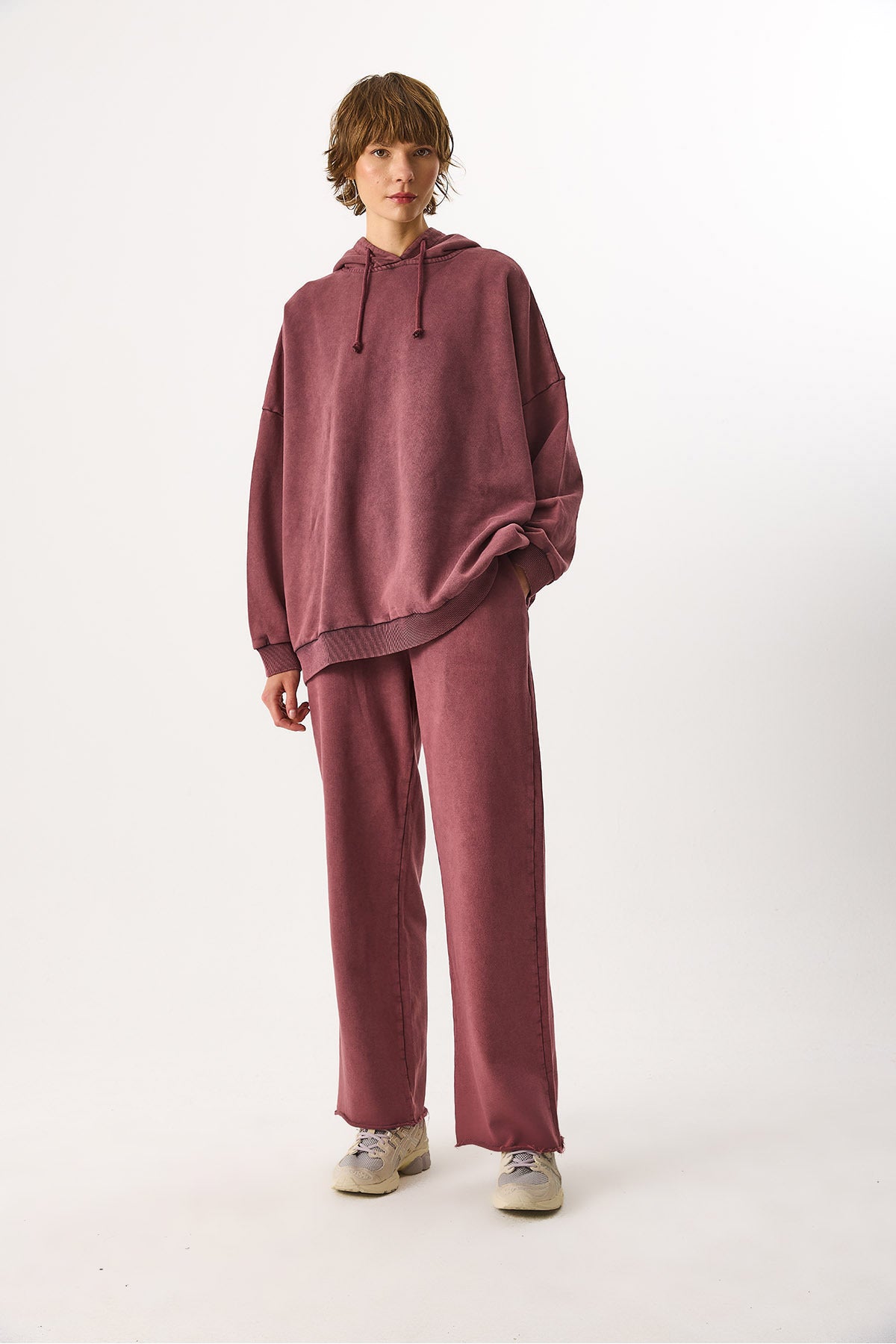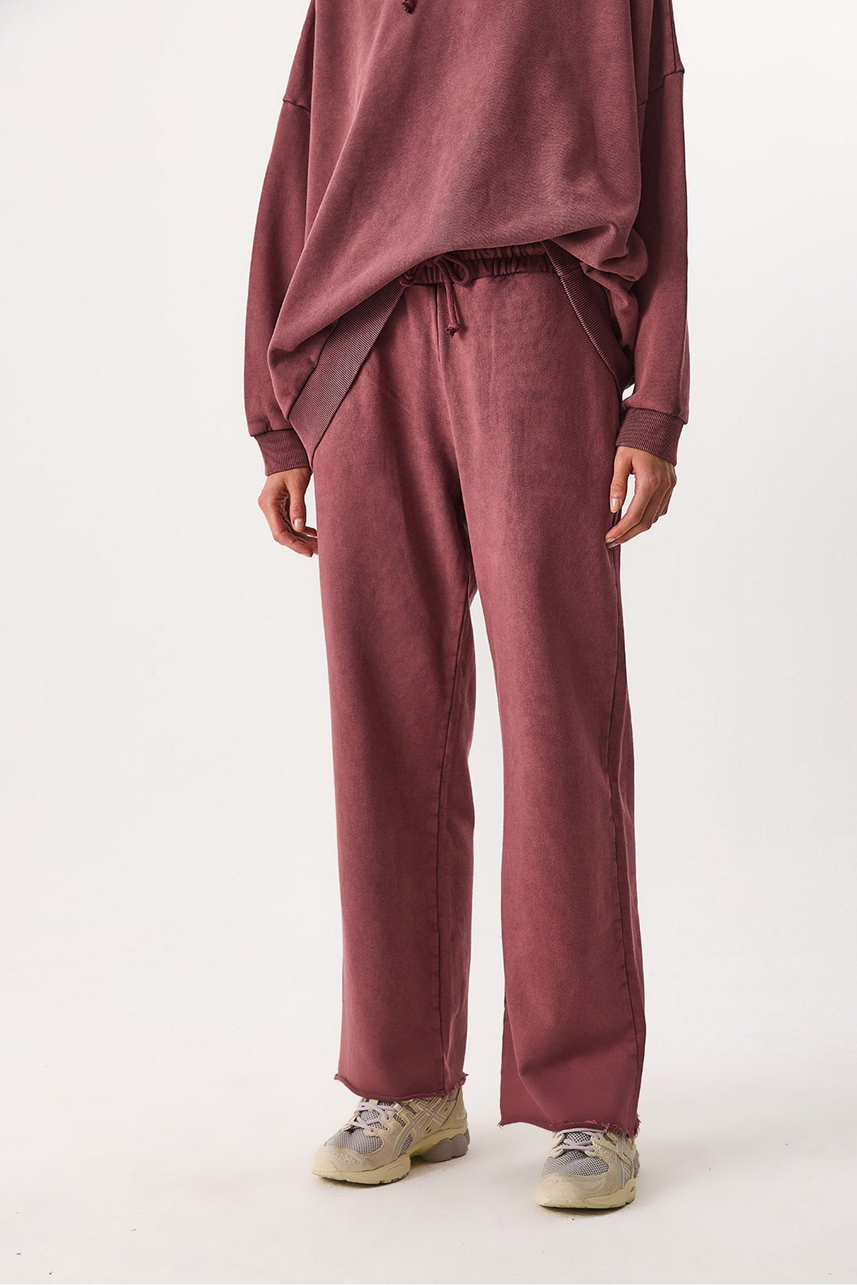 Kadın Geniş Paça Regular Fit Yıkamalı Jogging Pantolon %100 Pamuk - Bordo