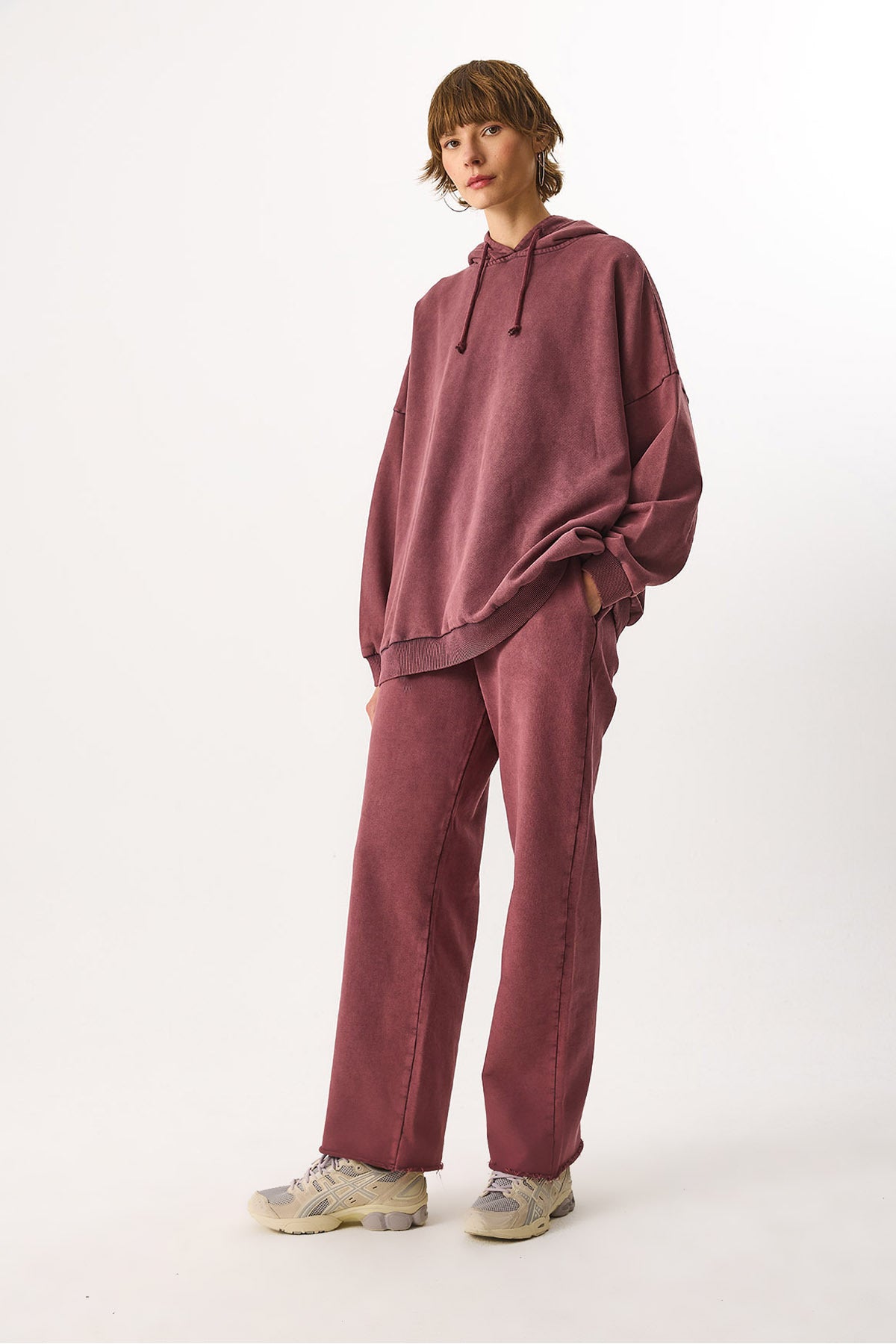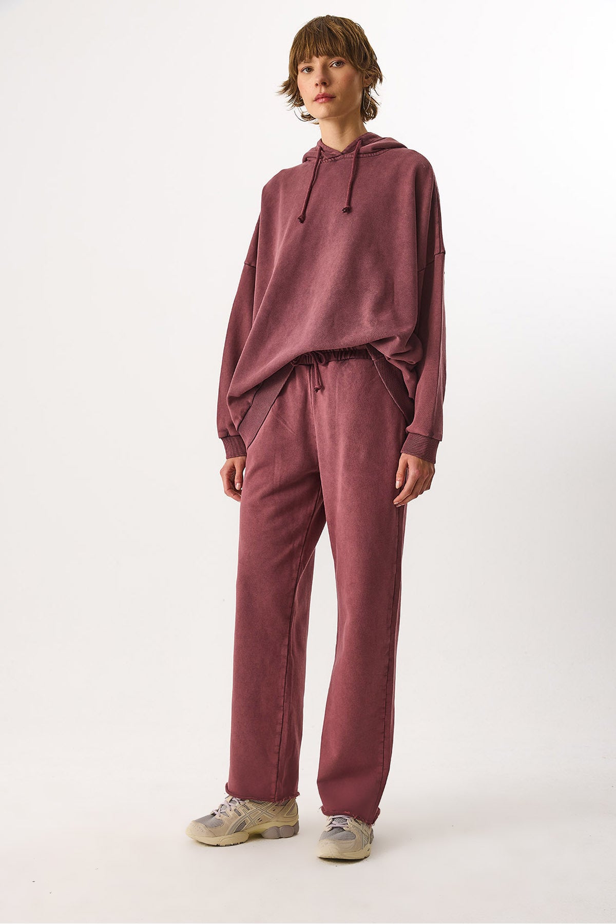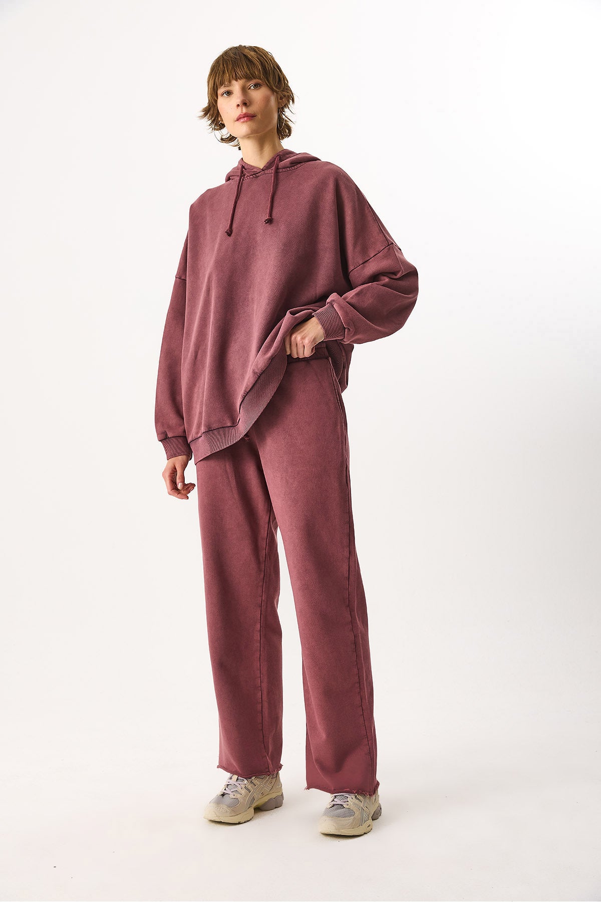 Kadın Geniş Paça Regular Fit Yıkamalı Jogging Pantolon %100 Pamuk - Bordo