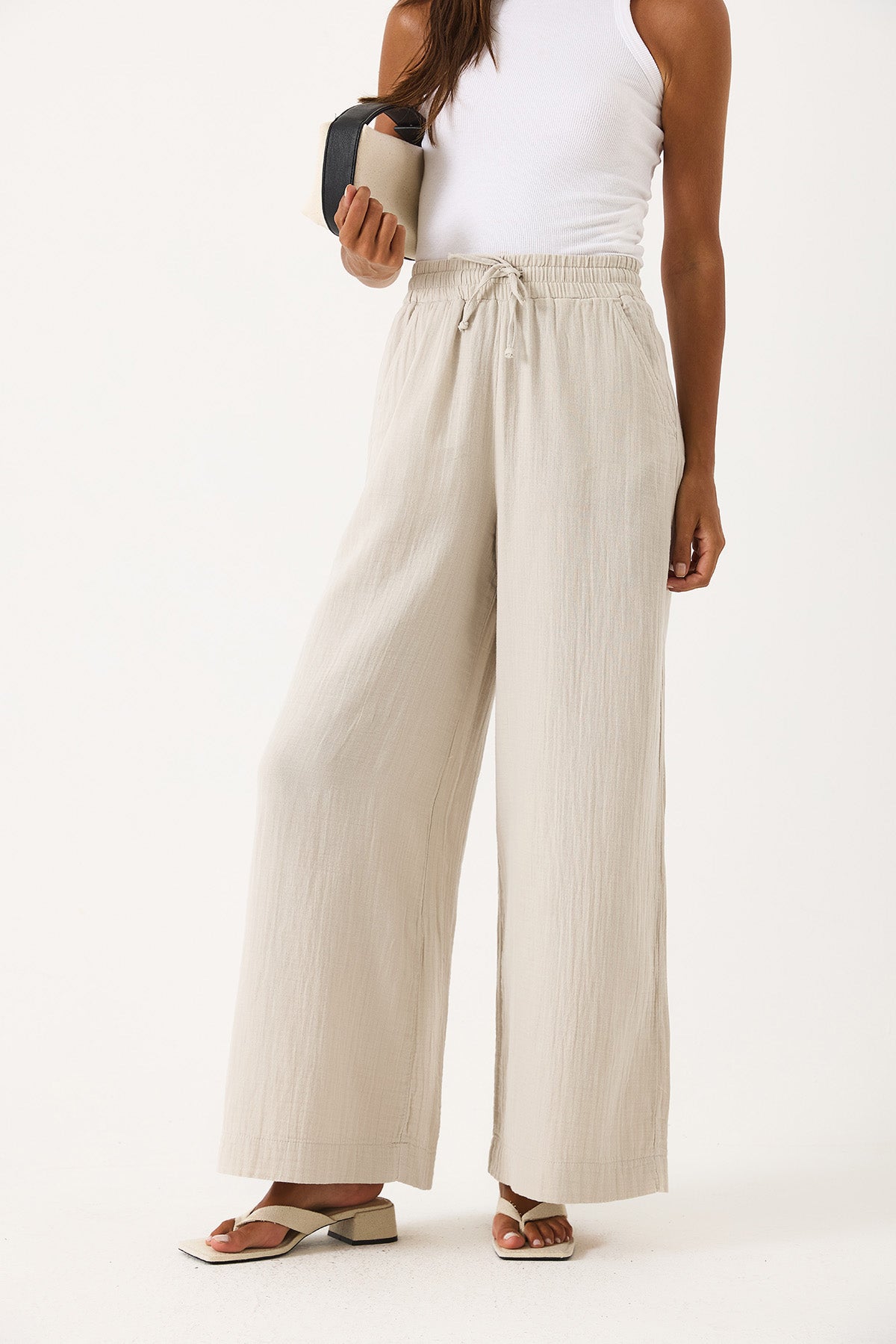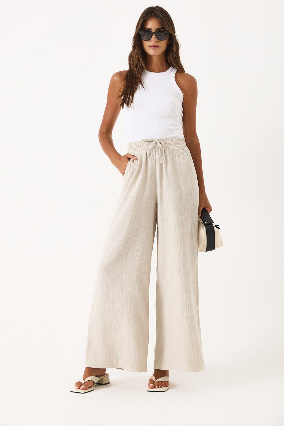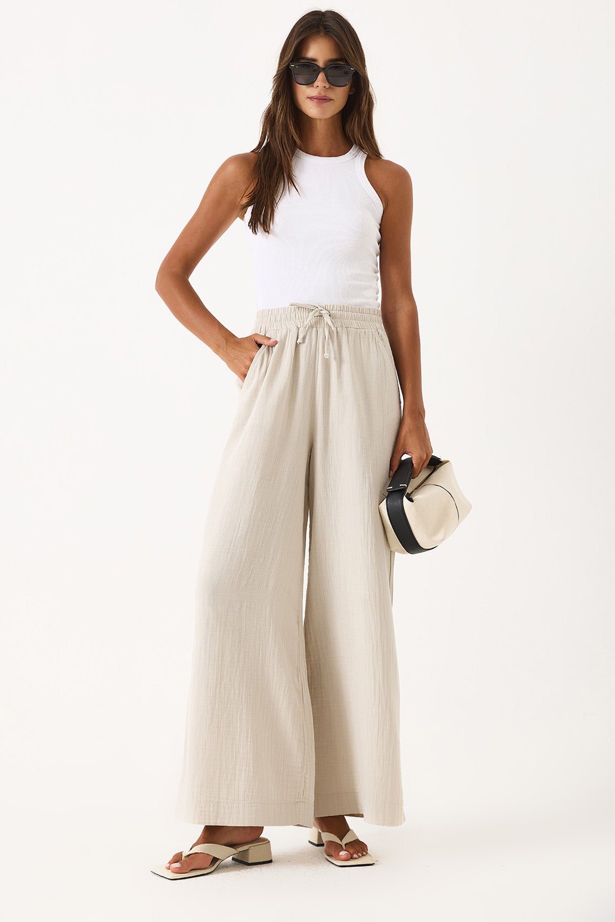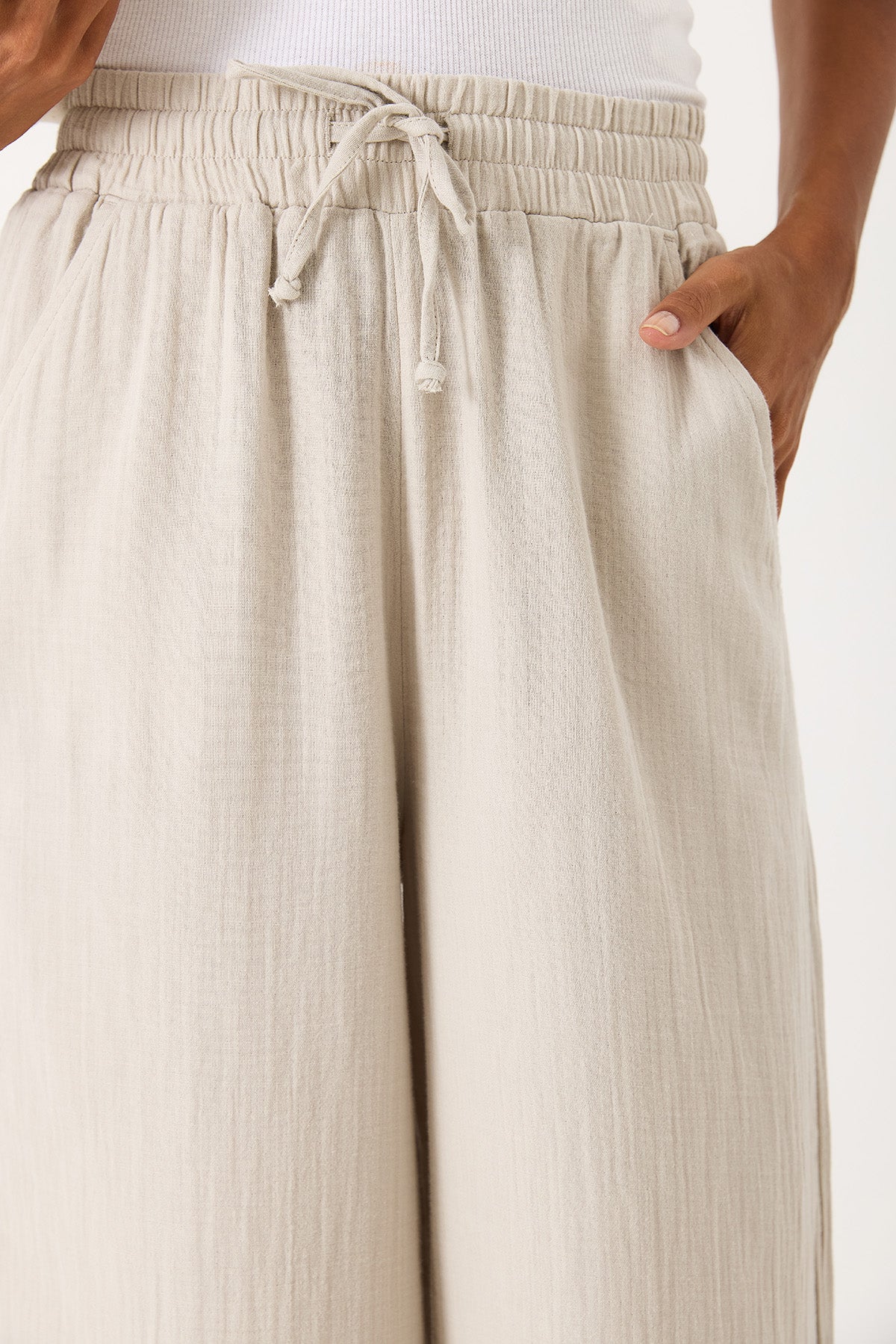 Kadın Gigi Yüksek Bel Wide Leg Müslin Pantolon %100 Pamuk - Taş