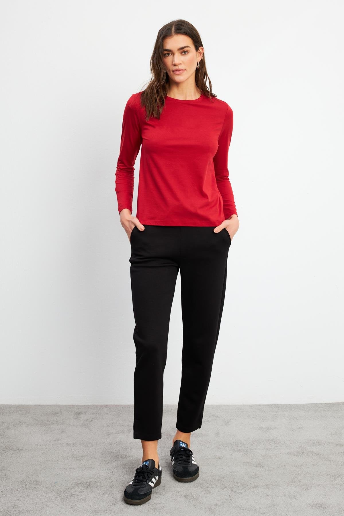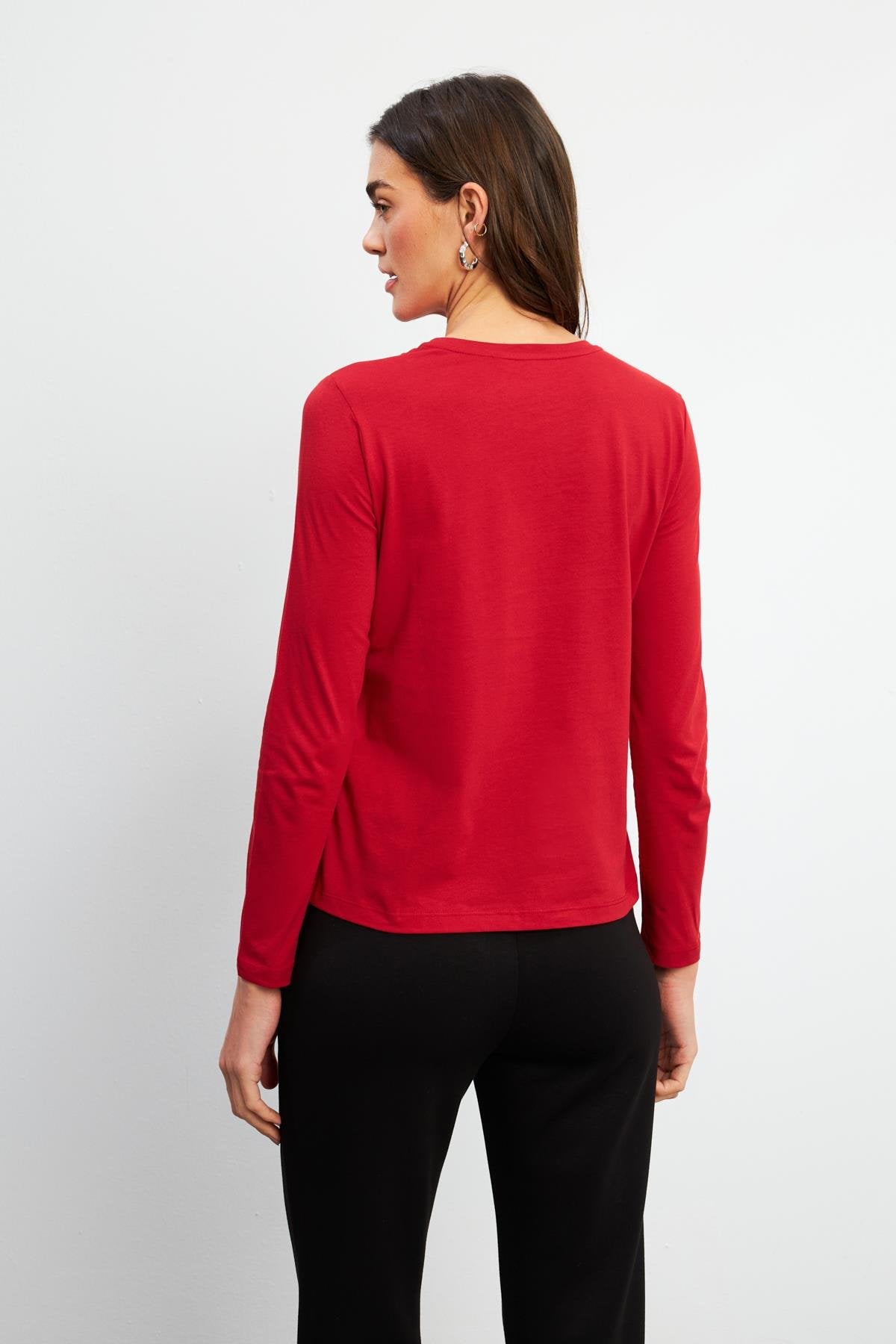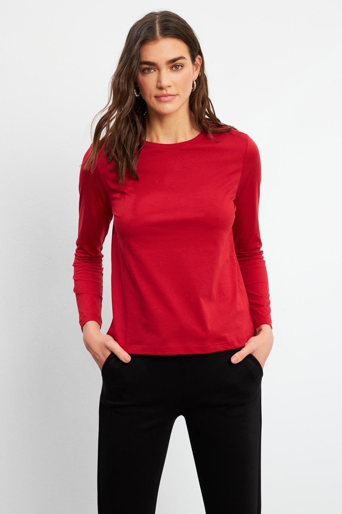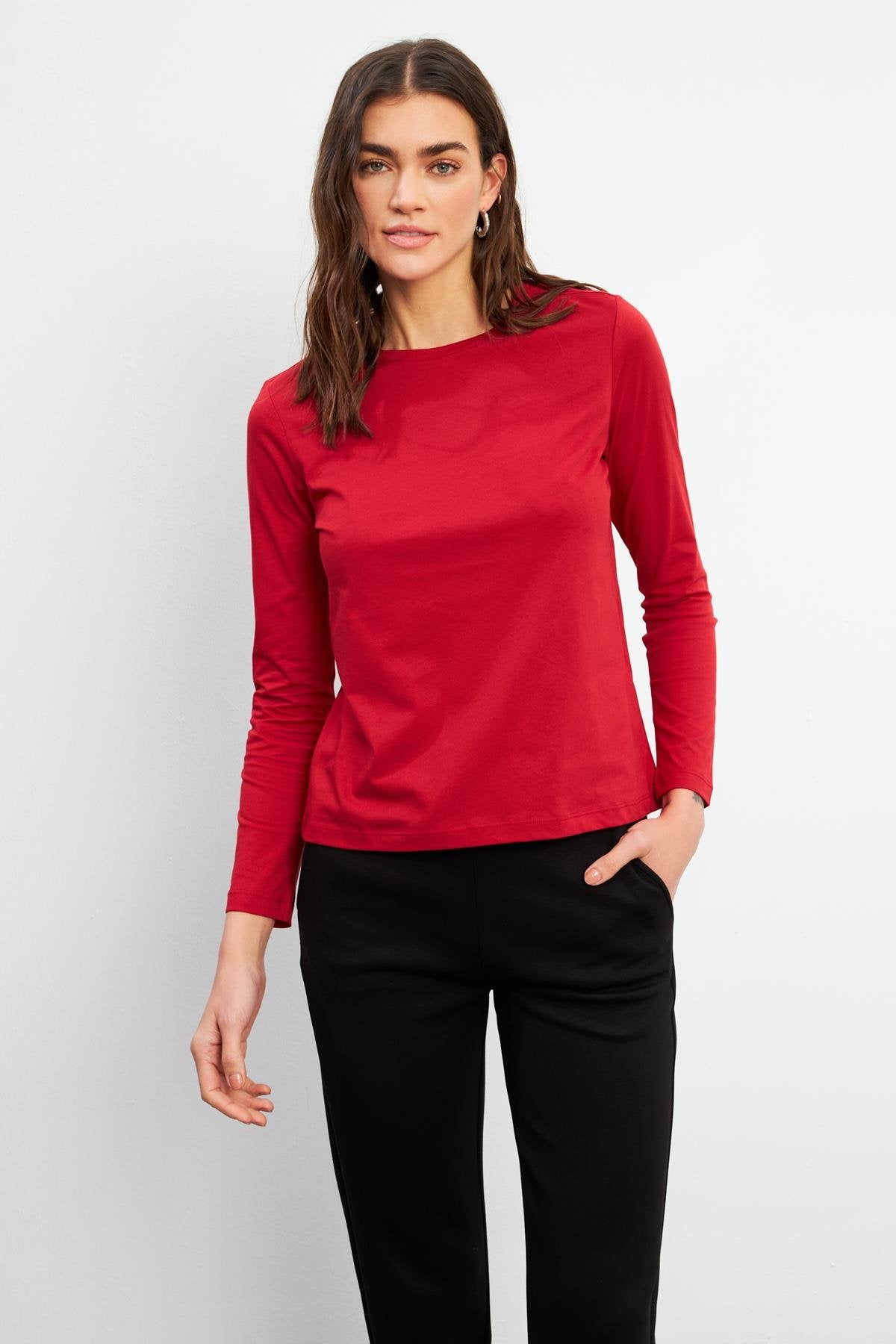 Kadın Gloria Bisiklet Yaka Regular Fit Uzun Kollu Basic Tişört %100 Pamuk - Kırmızı