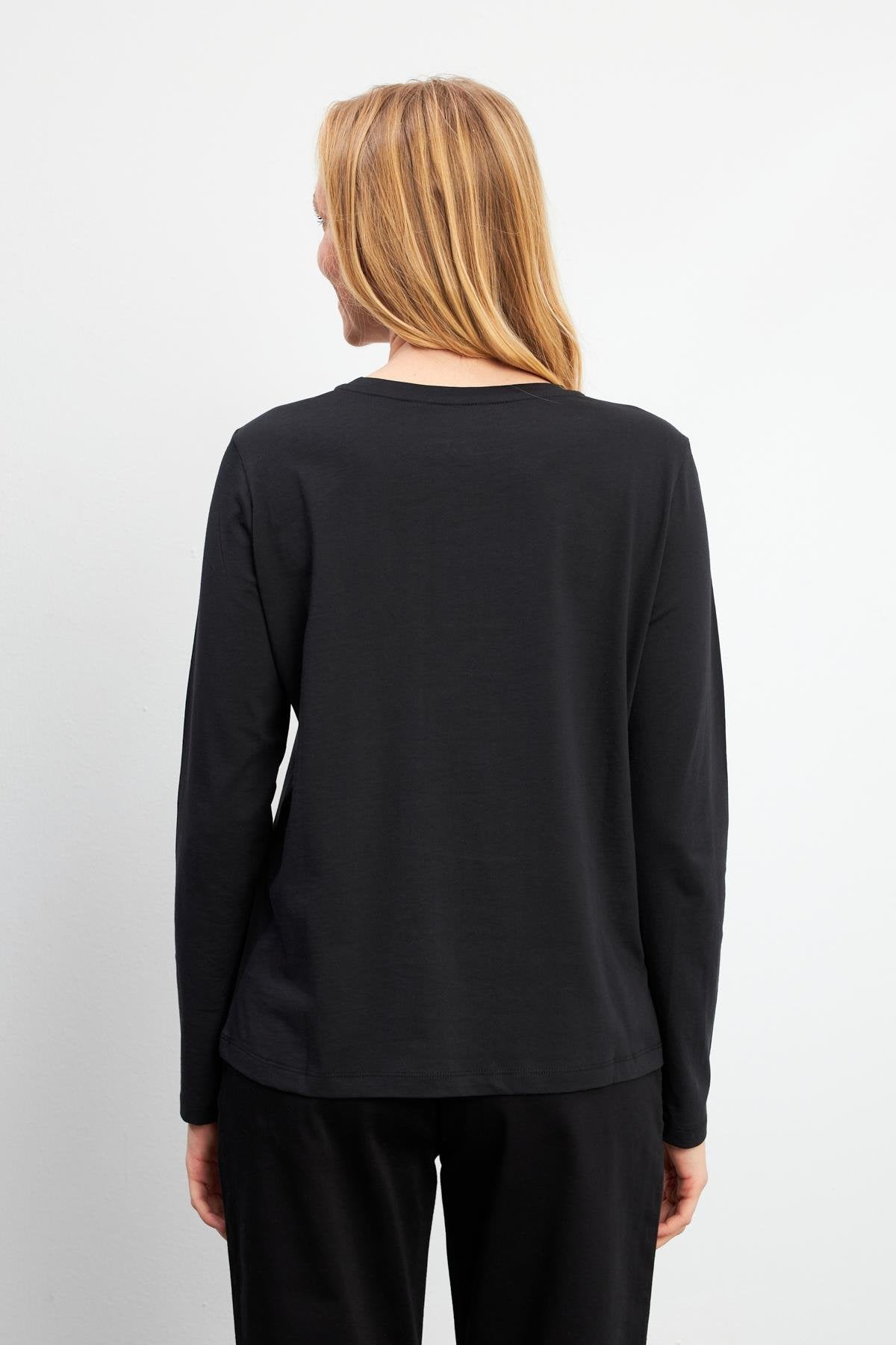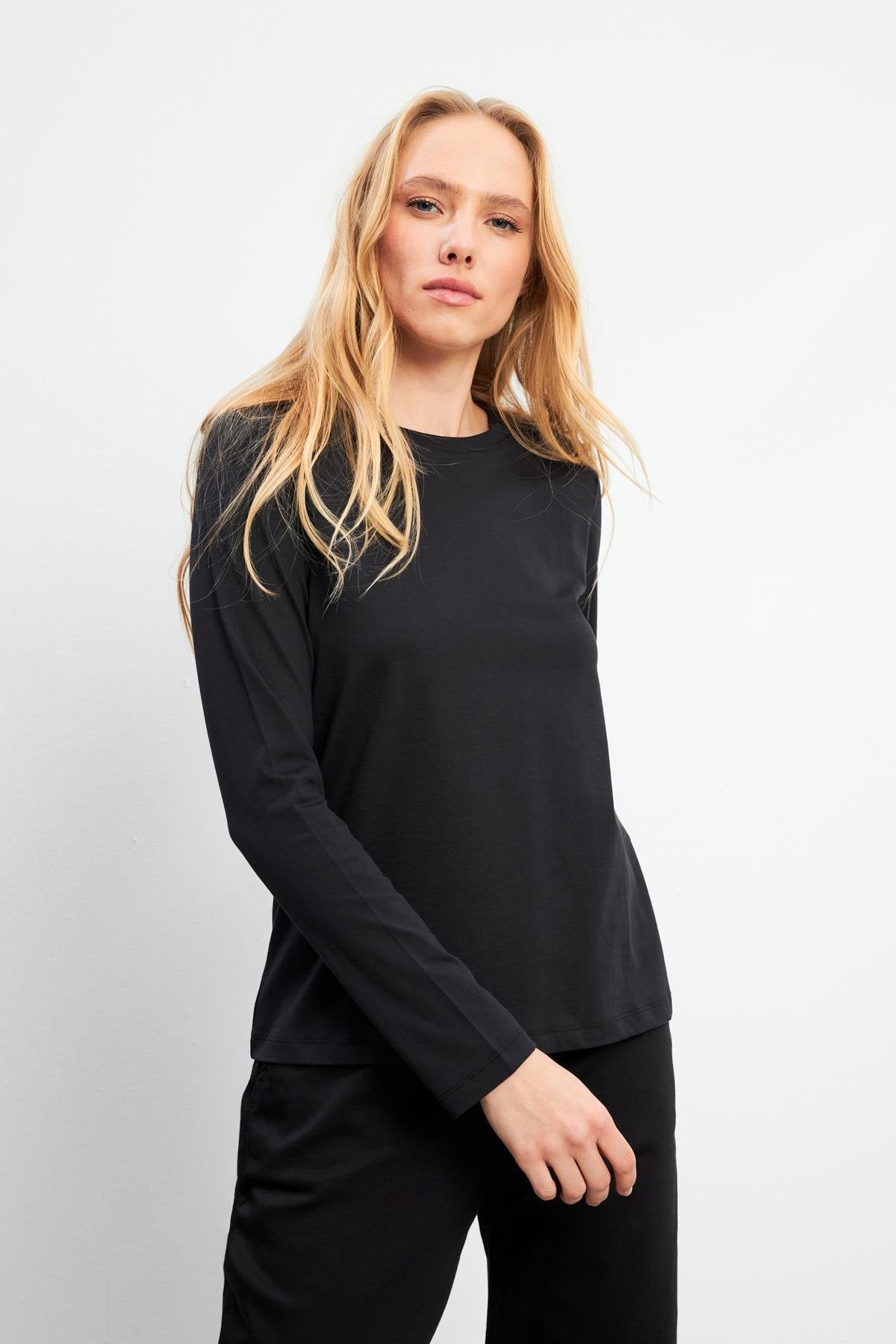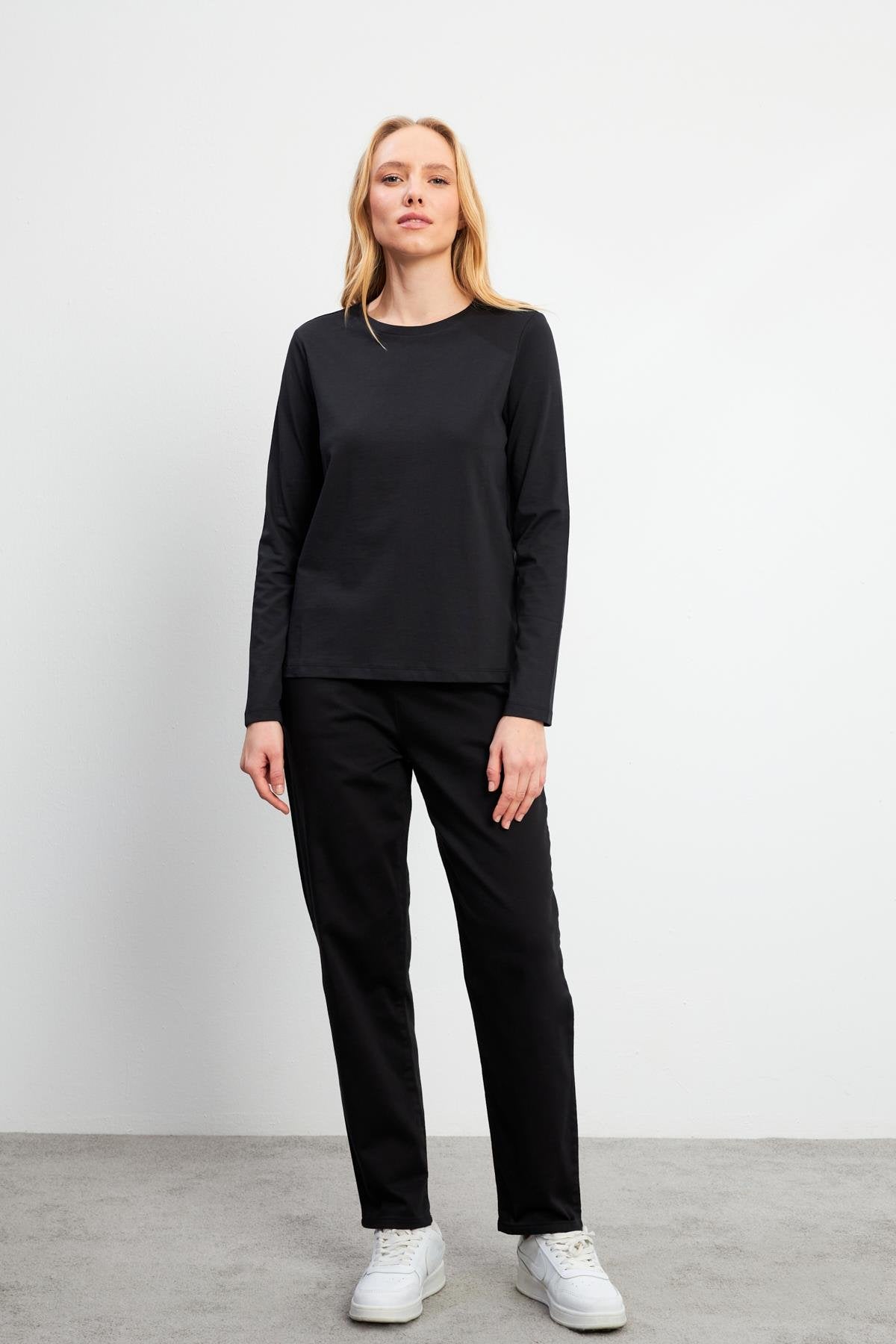 Kadın Gloria Bisiklet Yaka Regular Fit Uzun Kollu Basic Tişört %100 Pamuk - Siyah