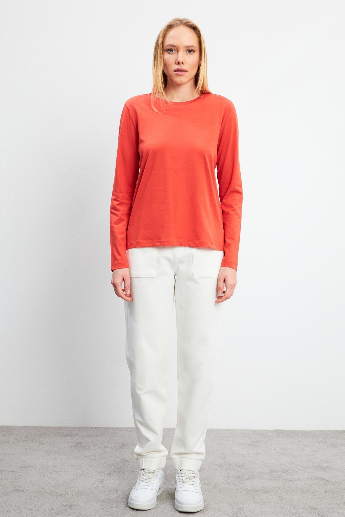 Kadın Gloria Bisiklet Yaka Regular Fit Uzun Kollu Basic Tişört %100 Pamuk - Terracotta