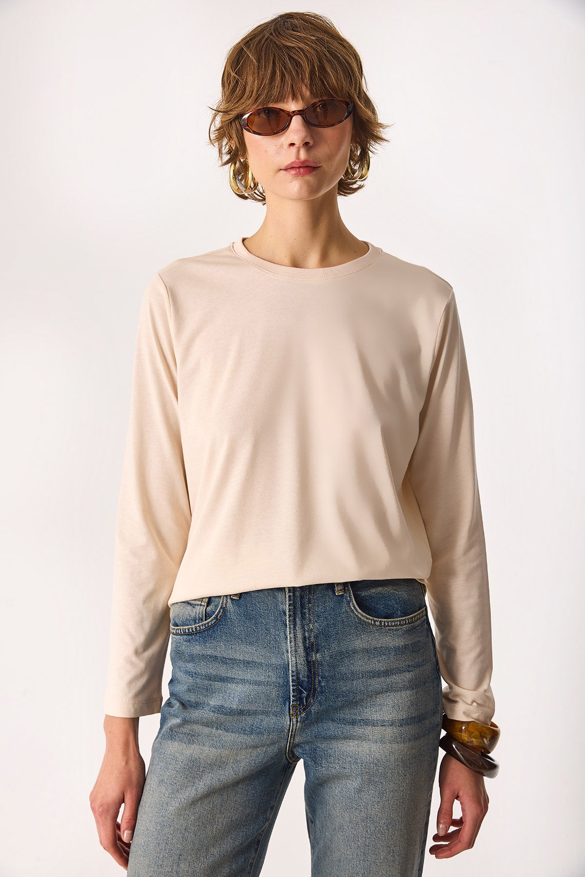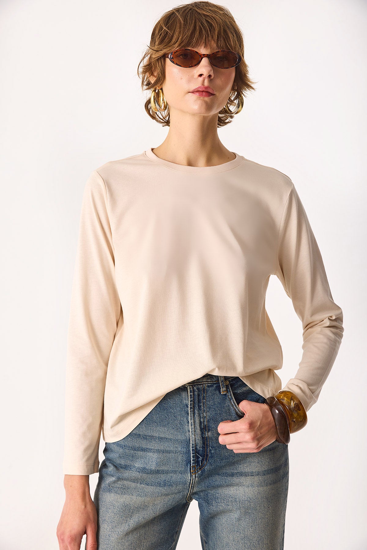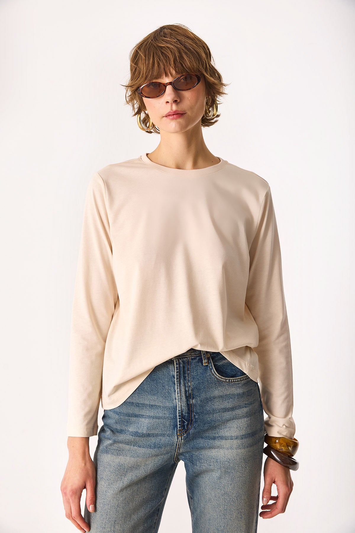 Kadın Gloria Bisiklet Yaka Regular Fit Uzun Kollu Tişört %100 Pamuk - Bej