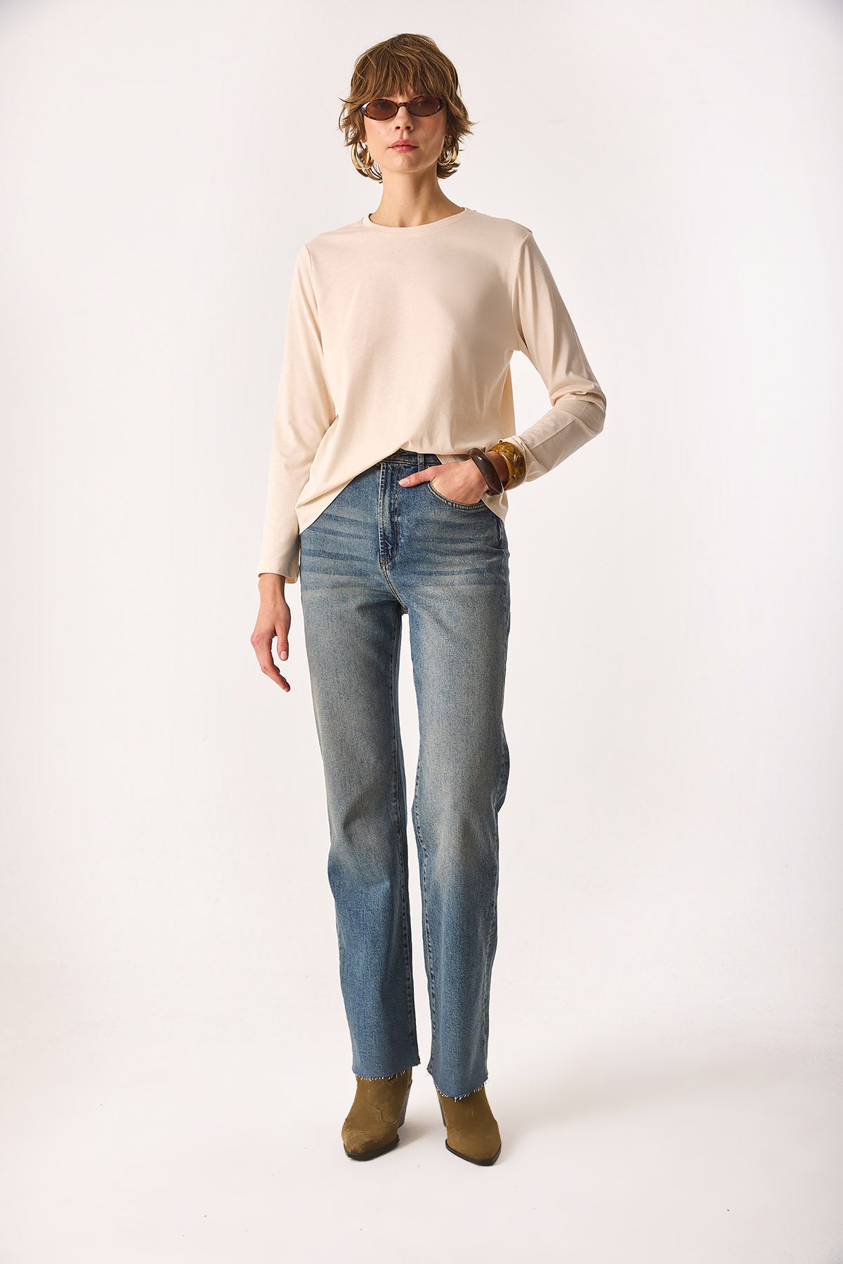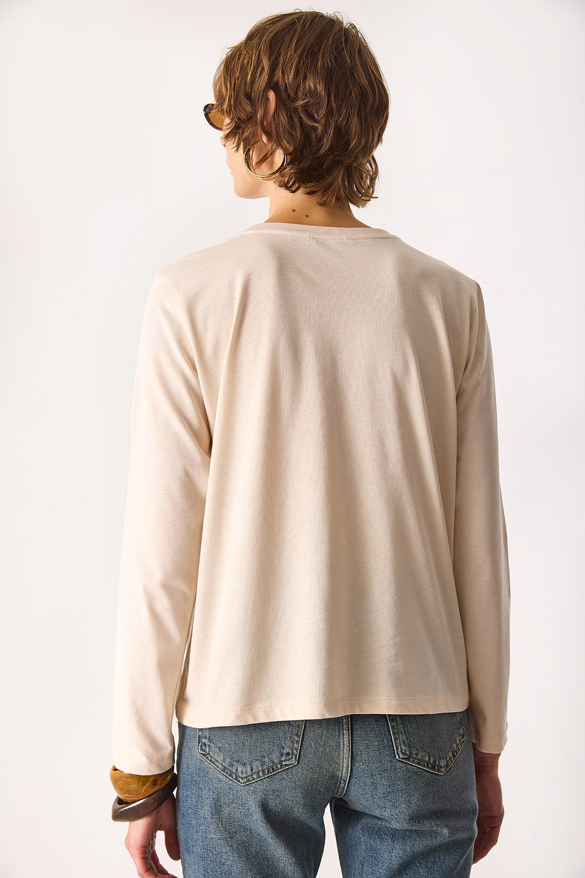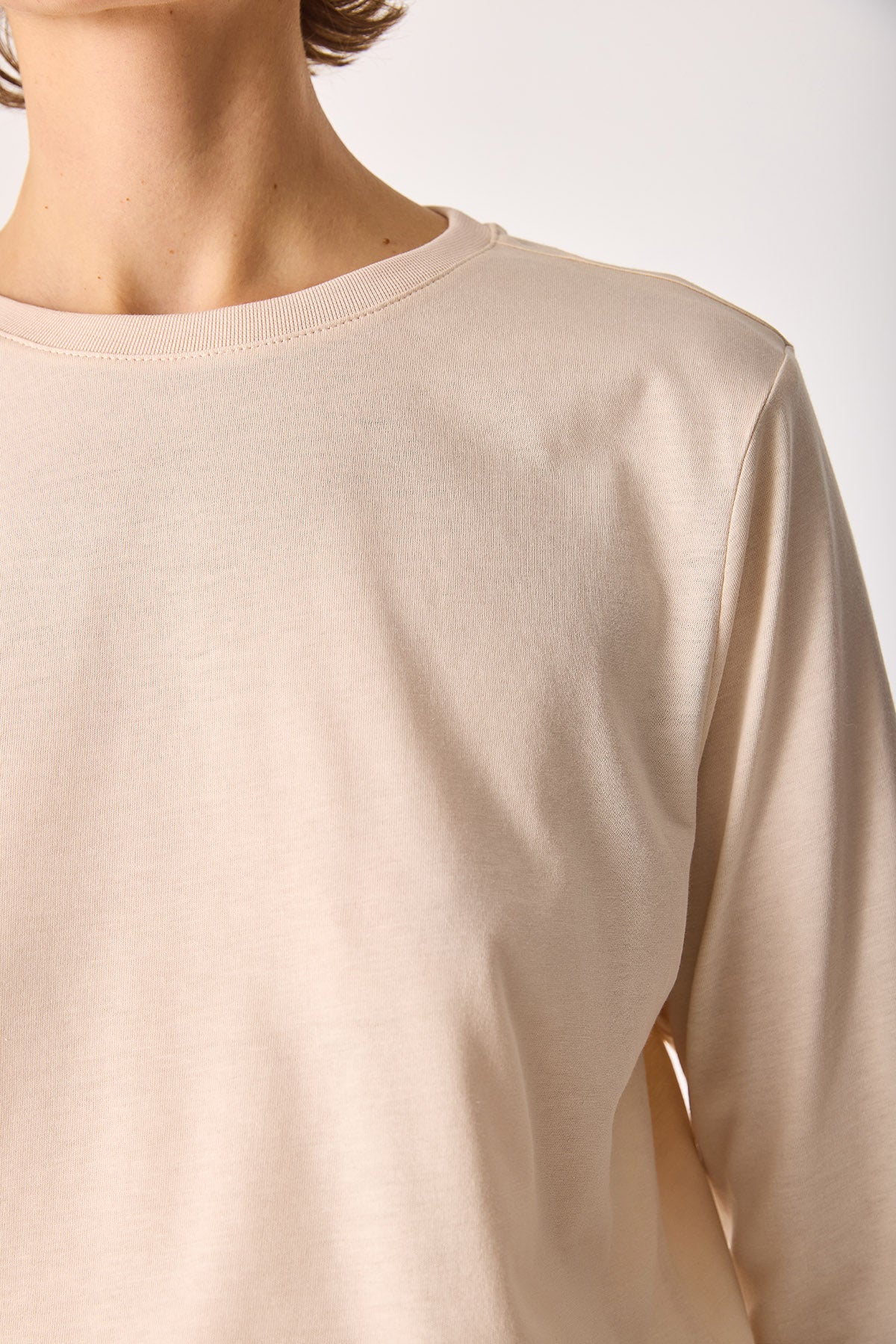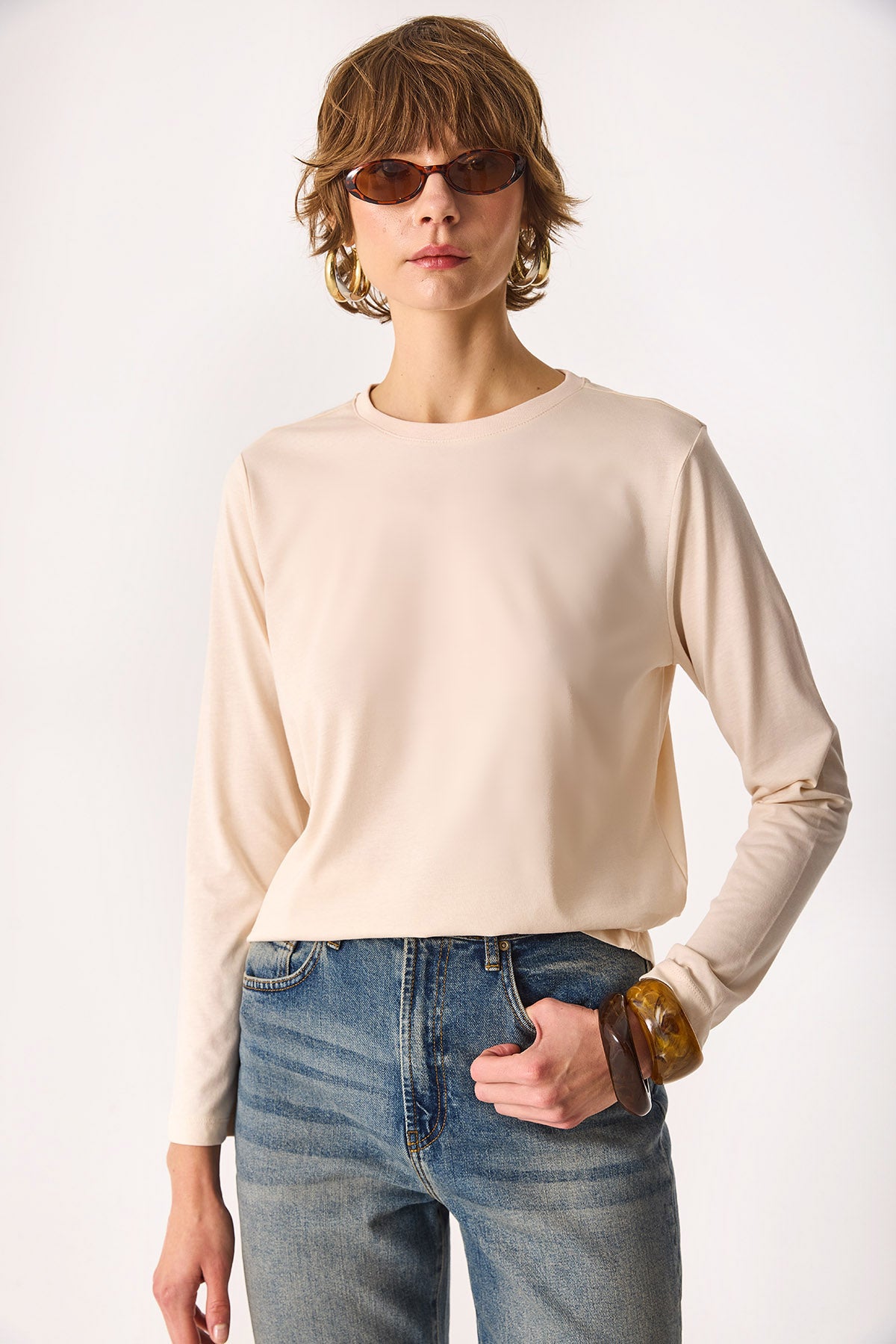 Kadın Gloria Bisiklet Yaka Regular Fit Uzun Kollu Tişört %100 Pamuk - Bej