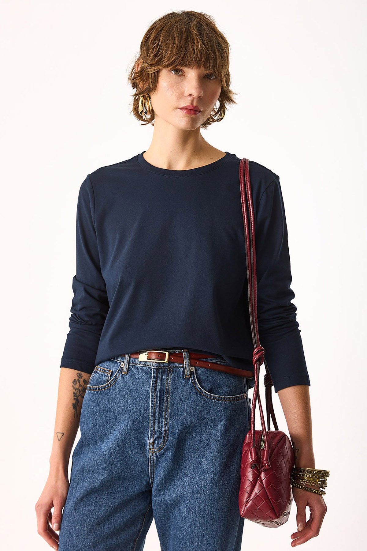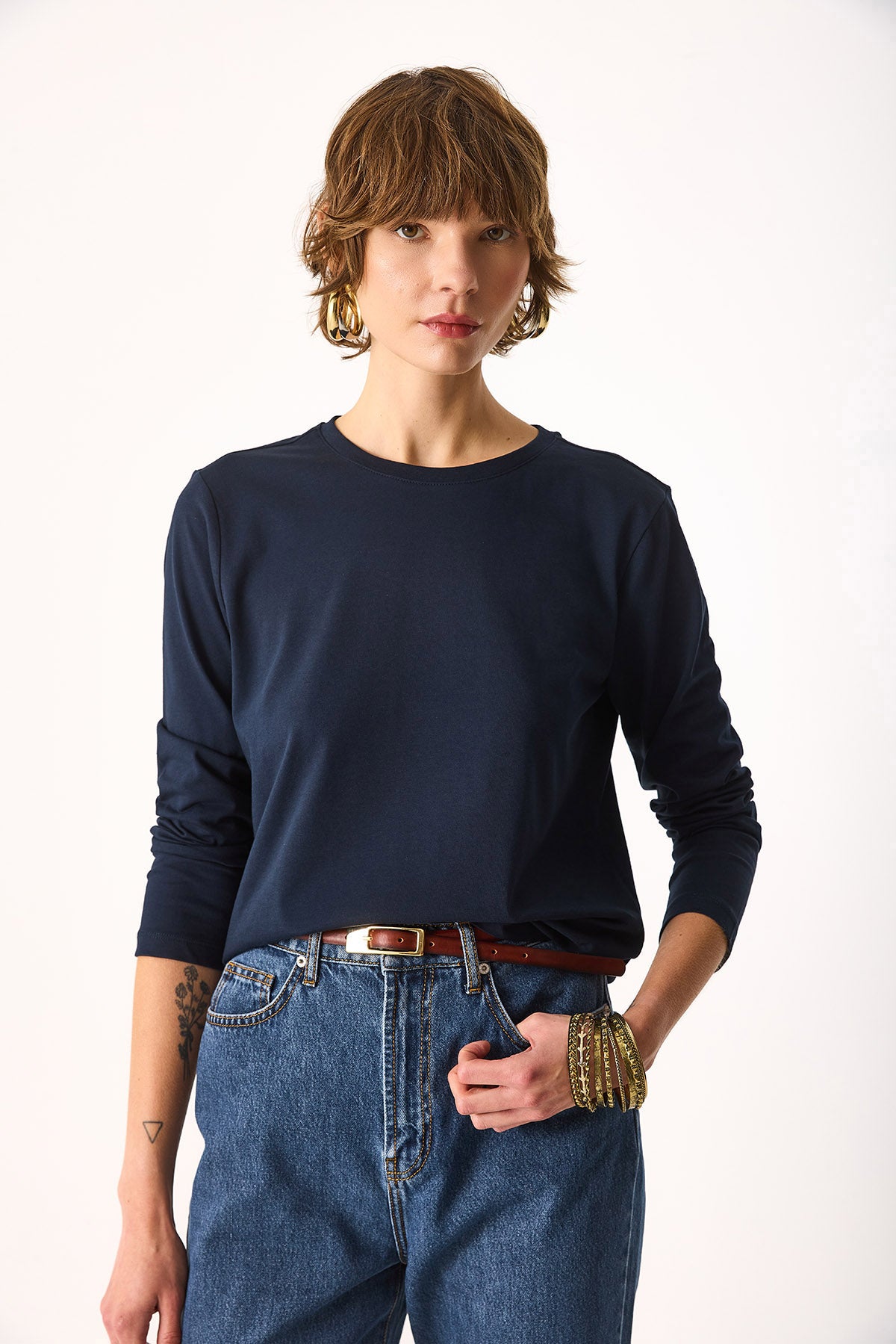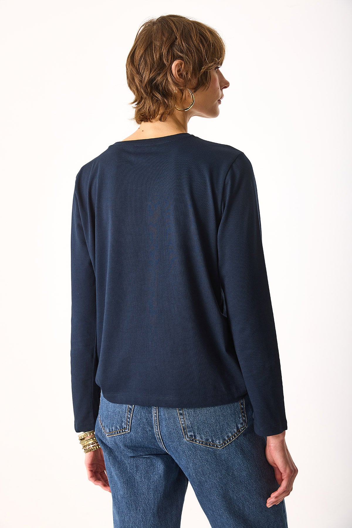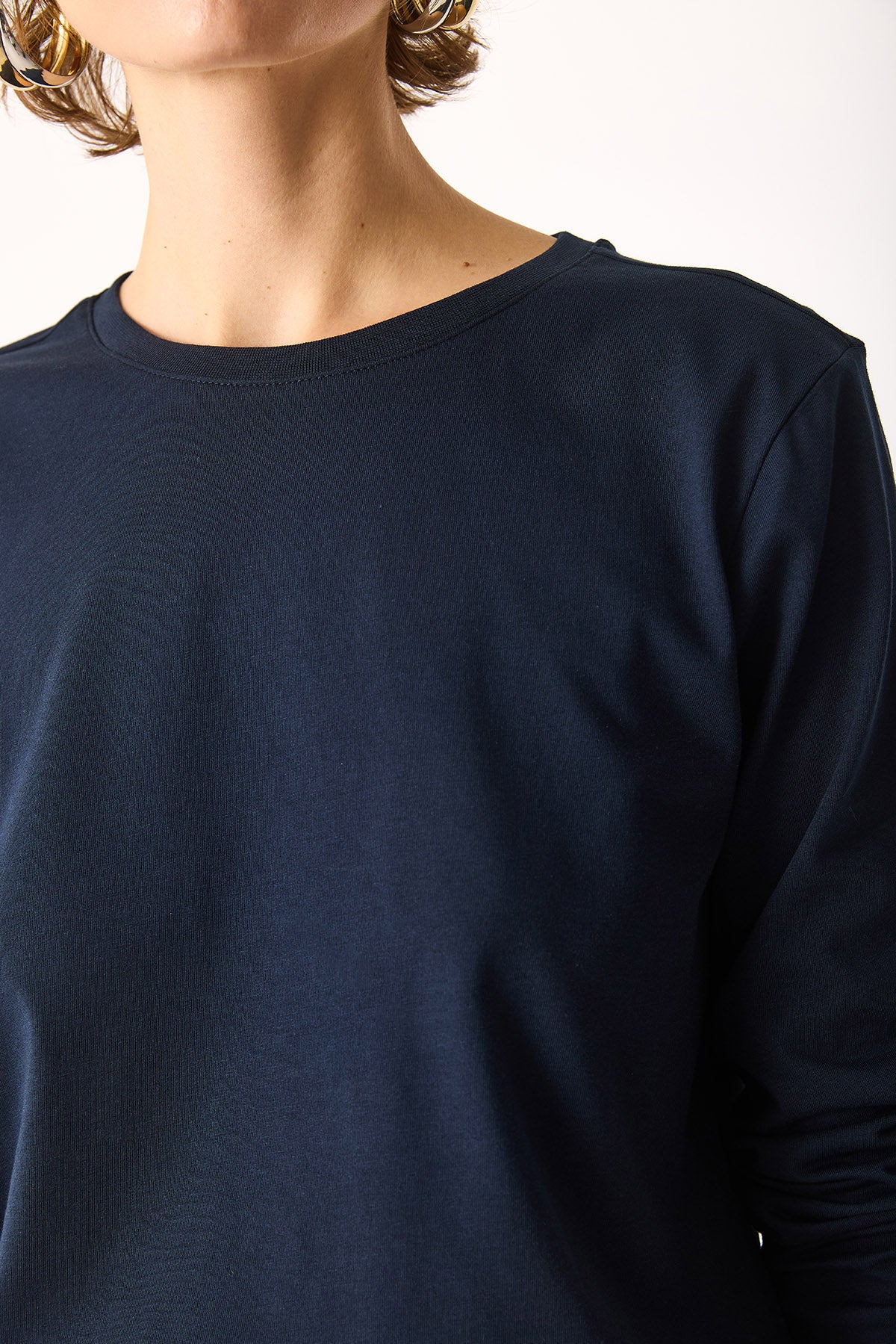 Kadın Gloria Bisiklet Yaka Regular Fit Uzun Kollu Tişört %100 Pamuk - Lacivert