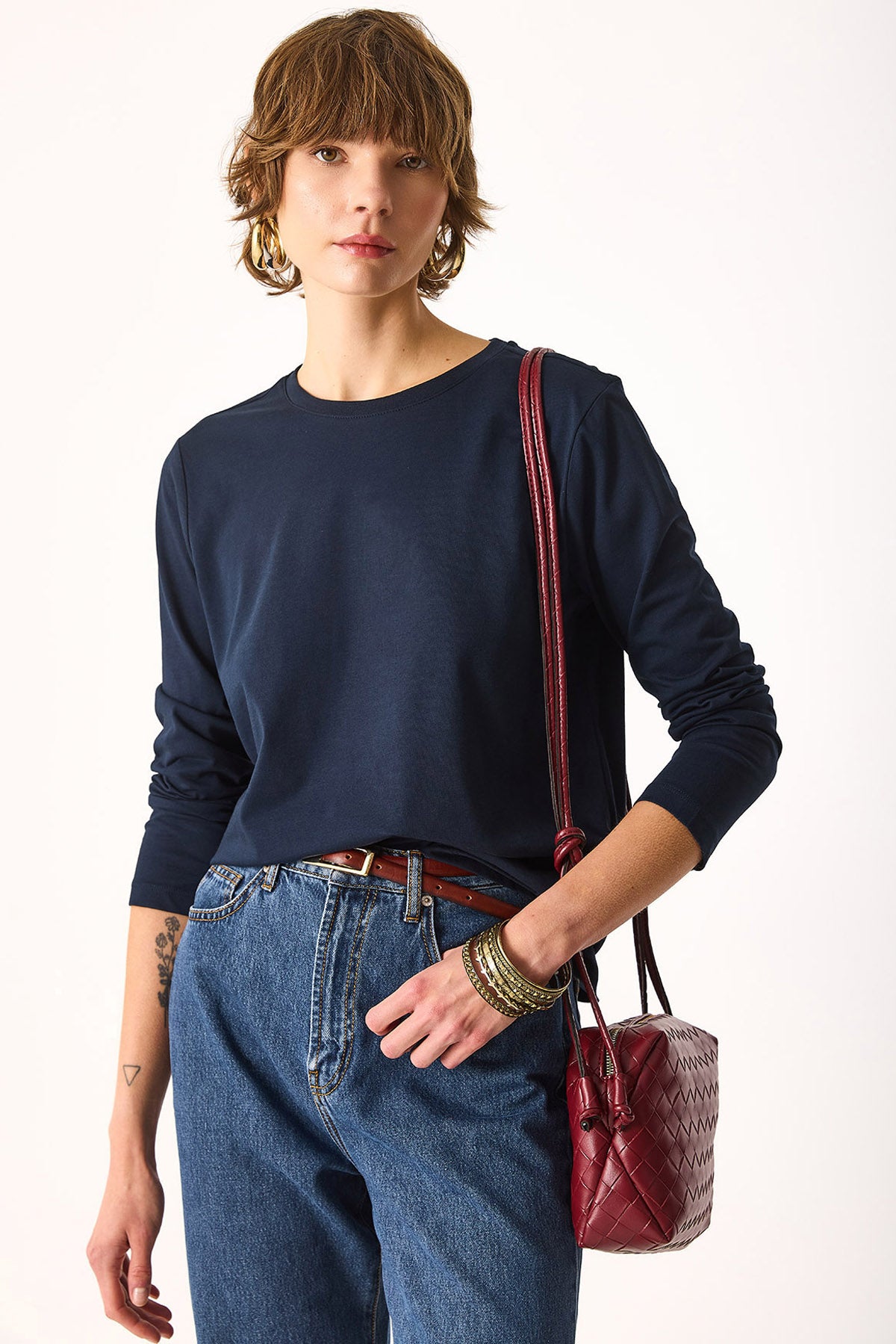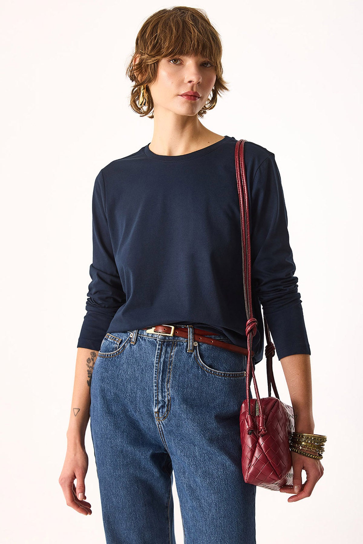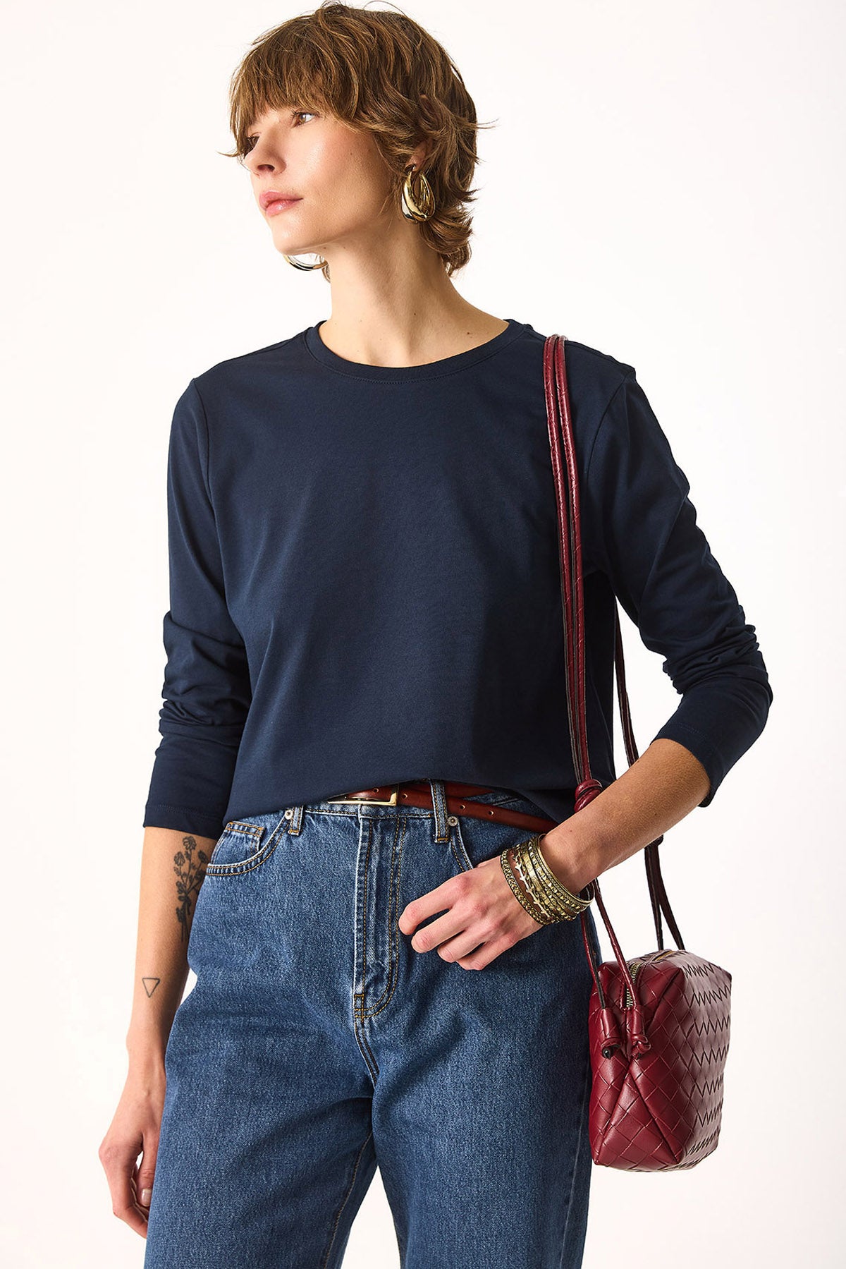Kadın Gloria Bisiklet Yaka Regular Fit Uzun Kollu Tişört %100 Pamuk - Lacivert