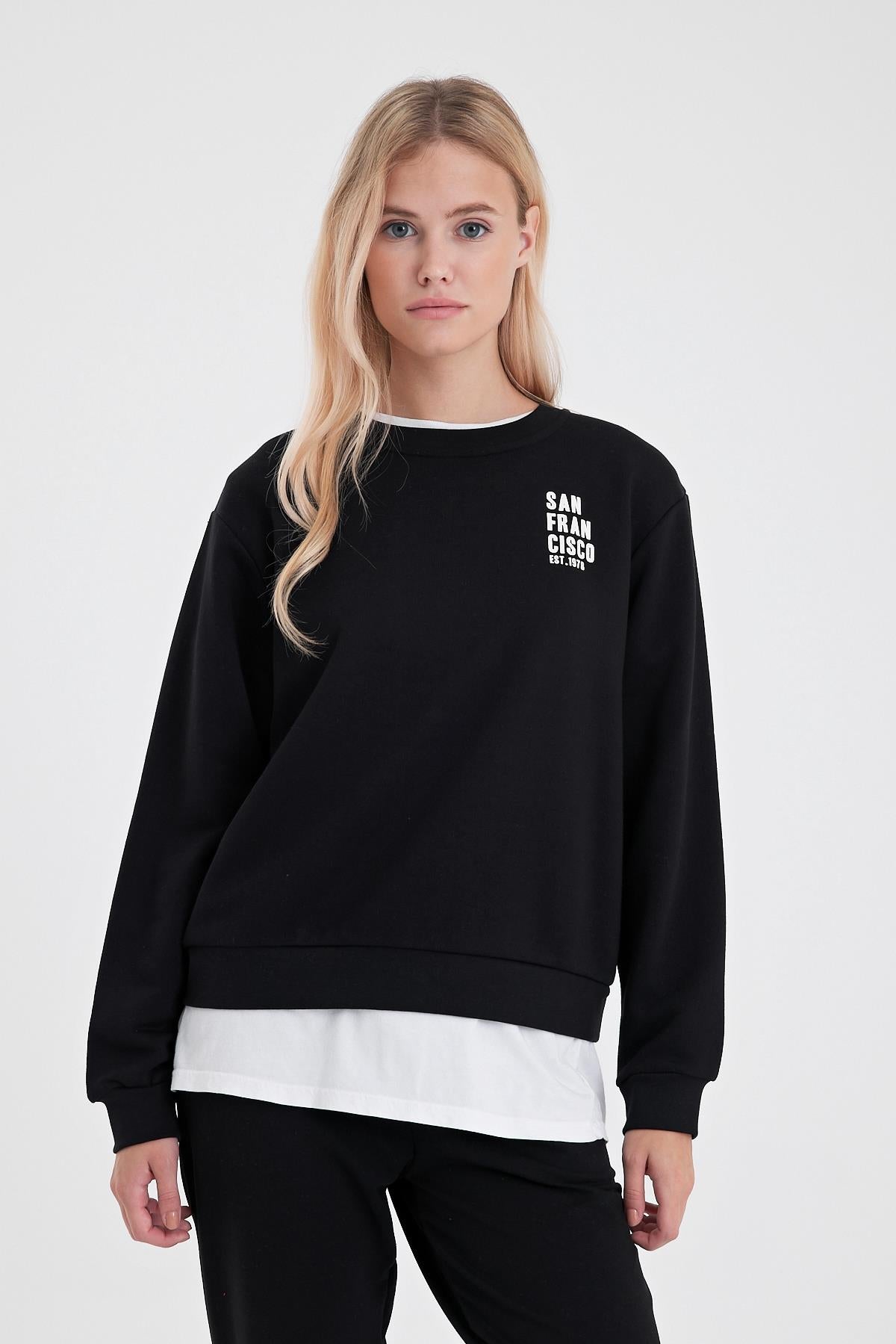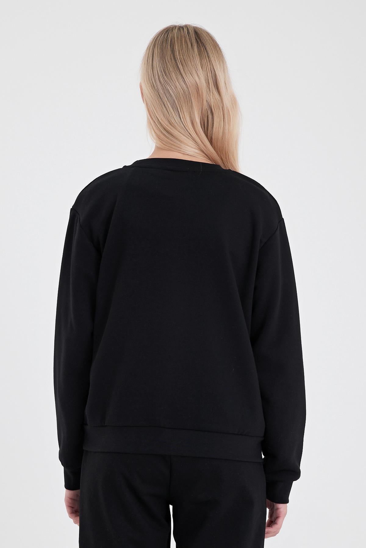 Kadın Göğsü Baskılı Basic Sweatshirt - Siyah