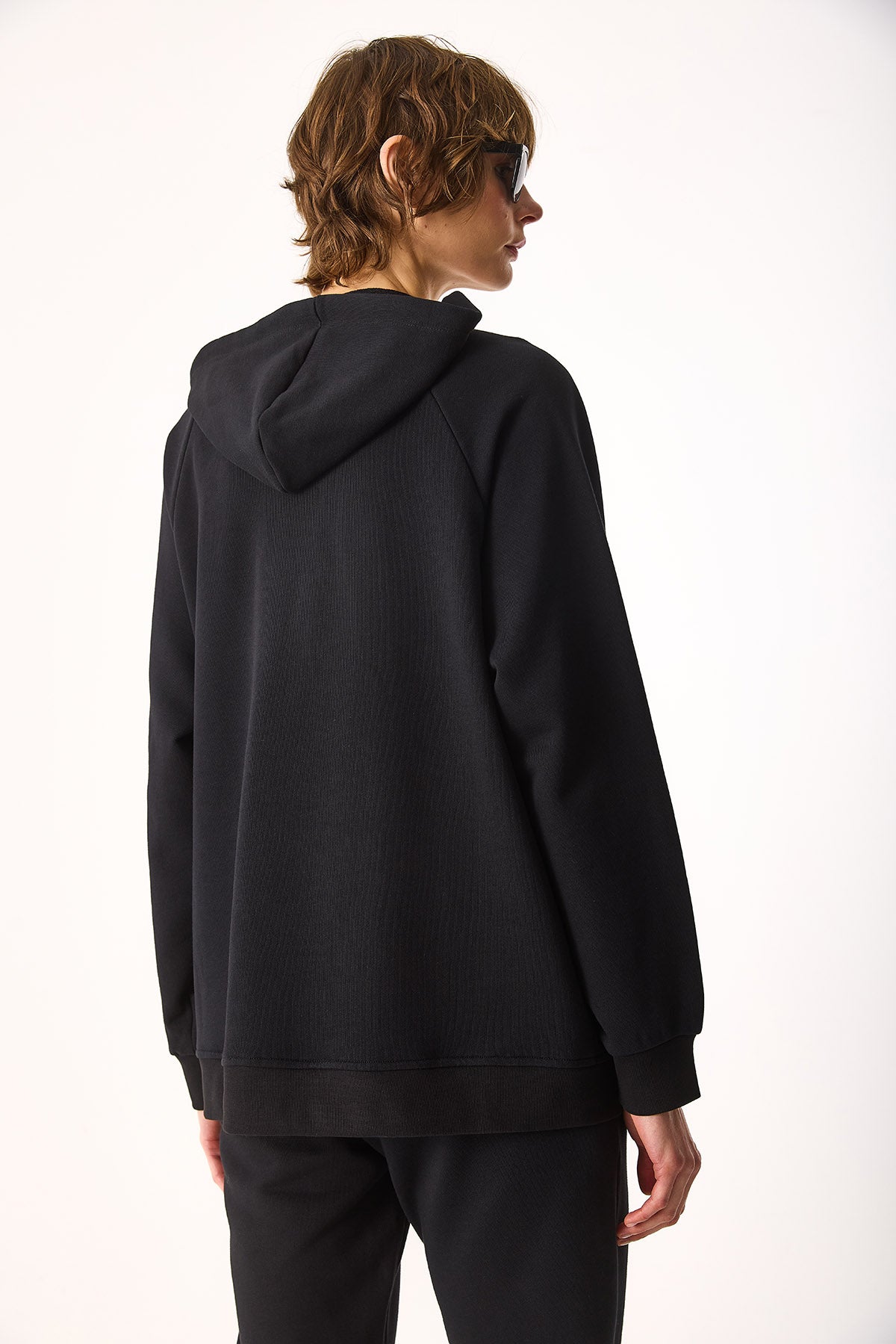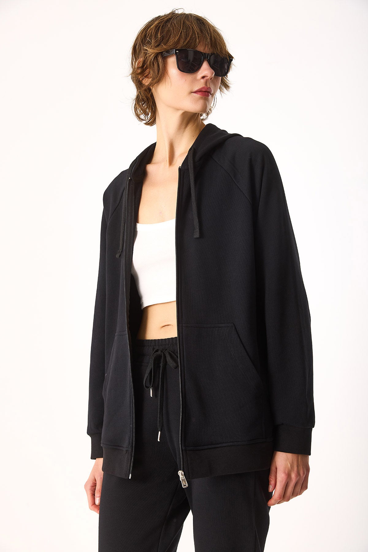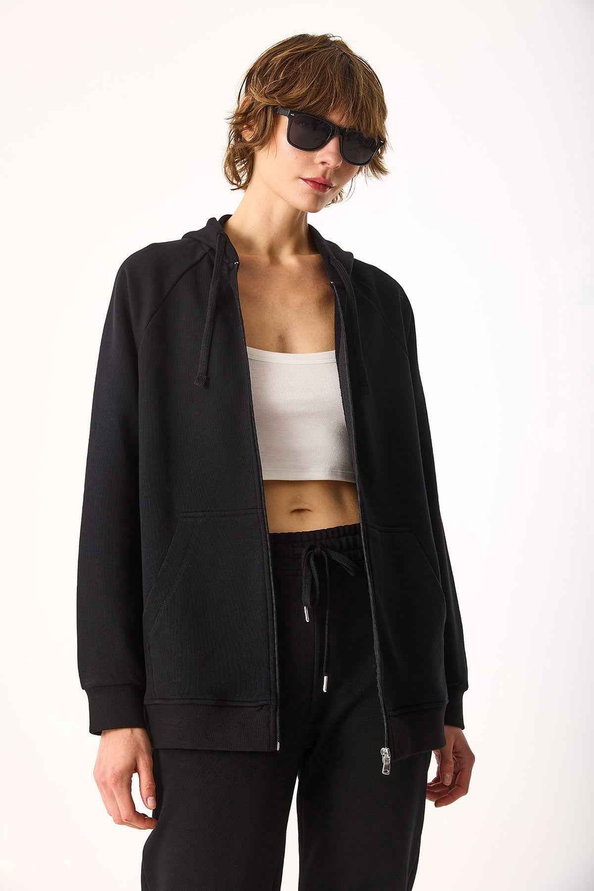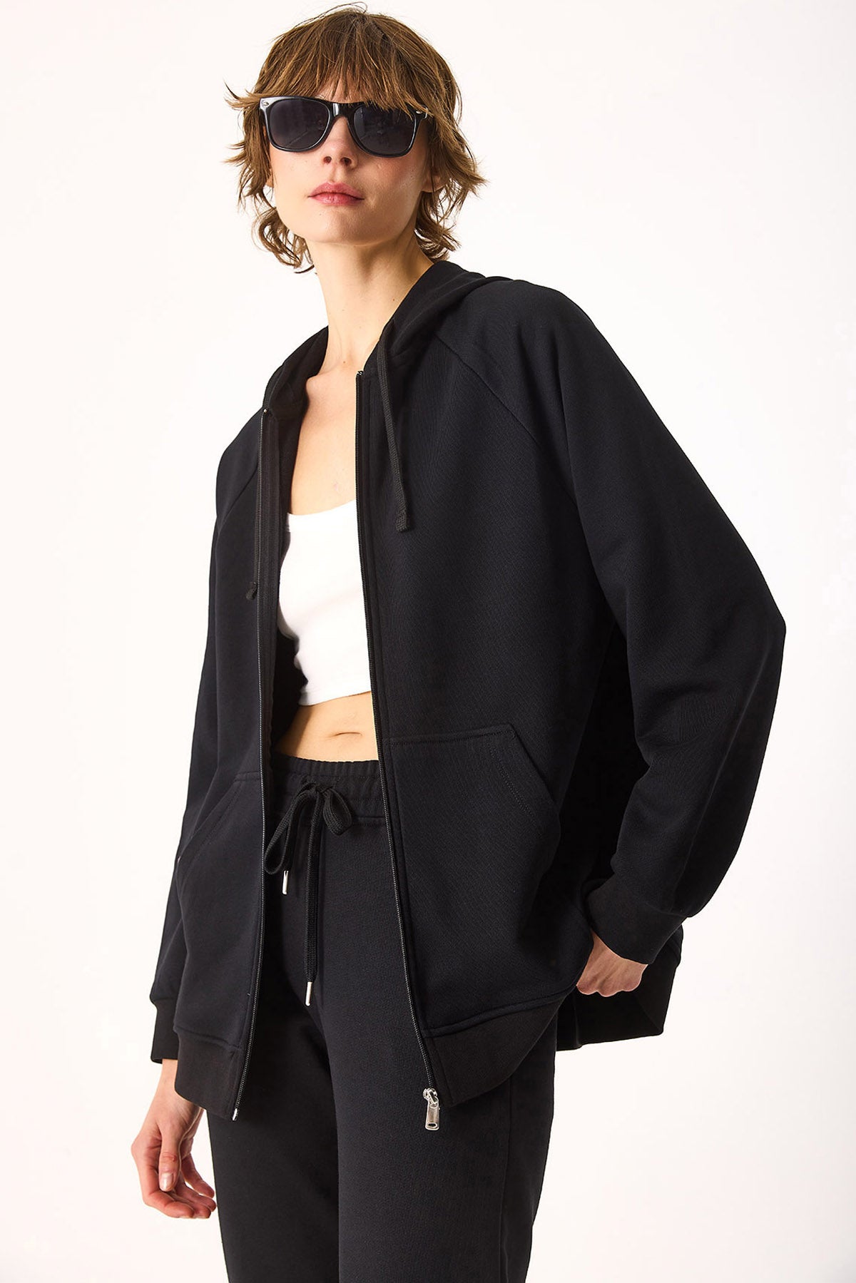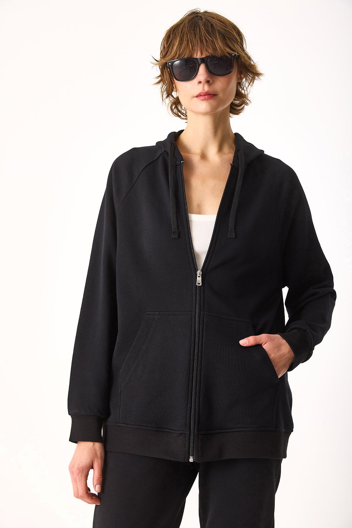 Kadın Grace Kapüşonlu Fermuarlı Regular Fit Basic Sweatshirt %100 Pamuk - Siyah
