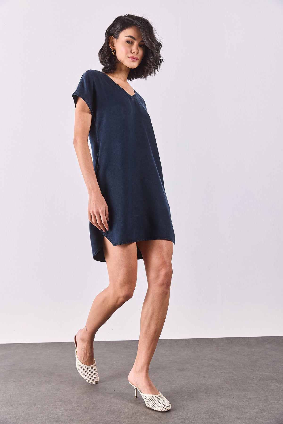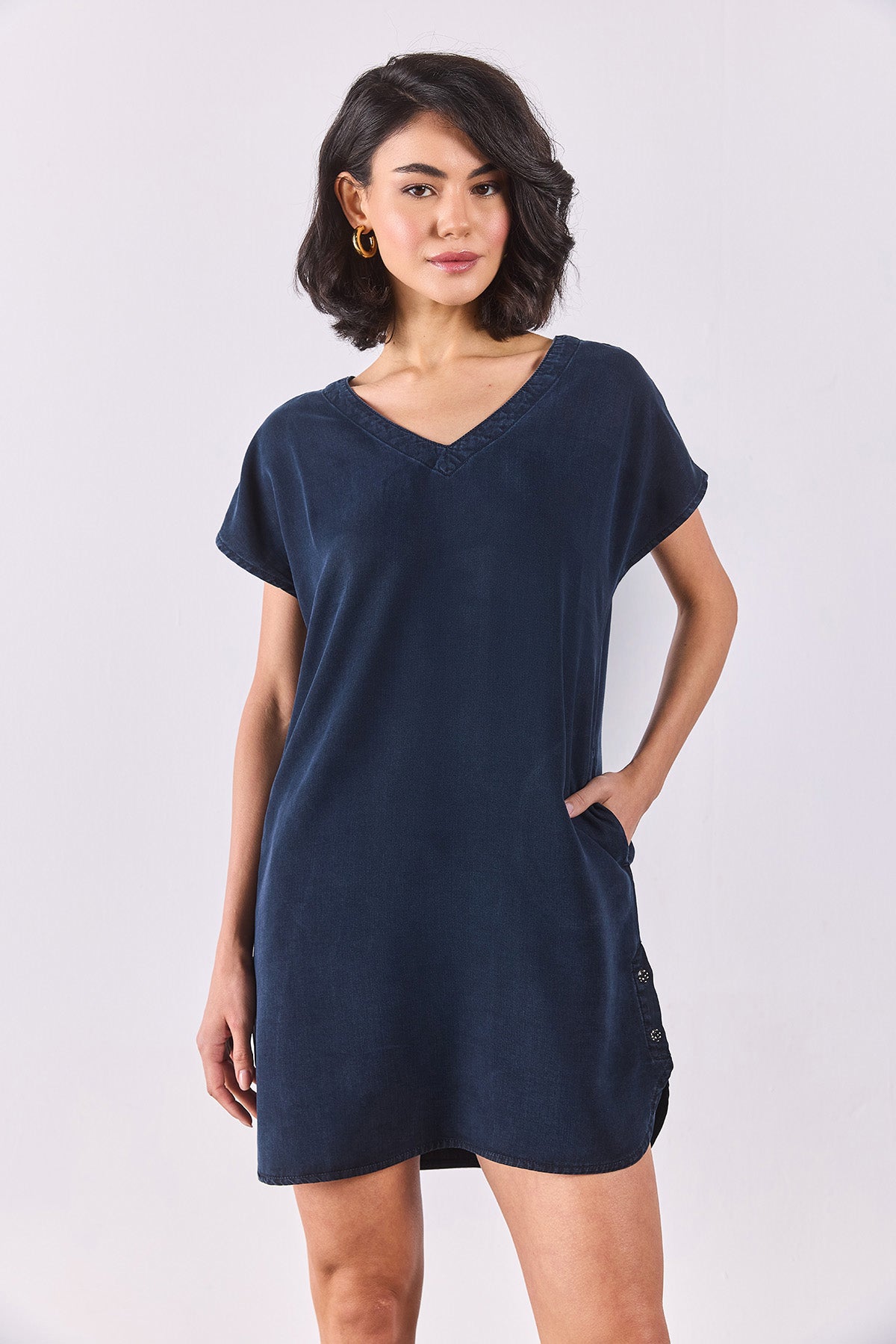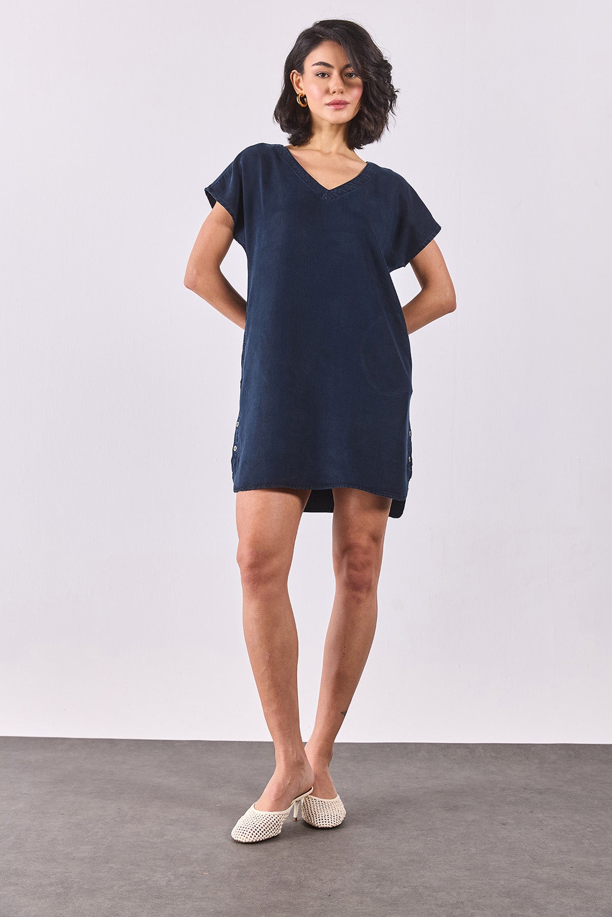 Kadın Helly Blue Black V Yaka Kısa Kollu Jean Elbise %100 Lyocell (Tencel™) - Blue Black