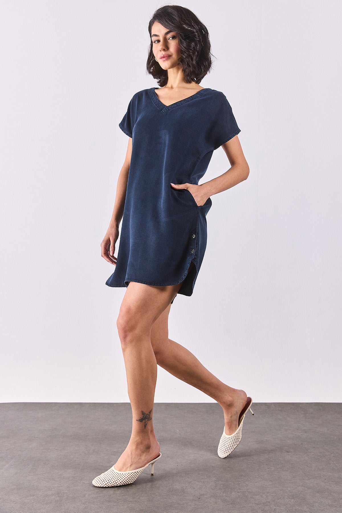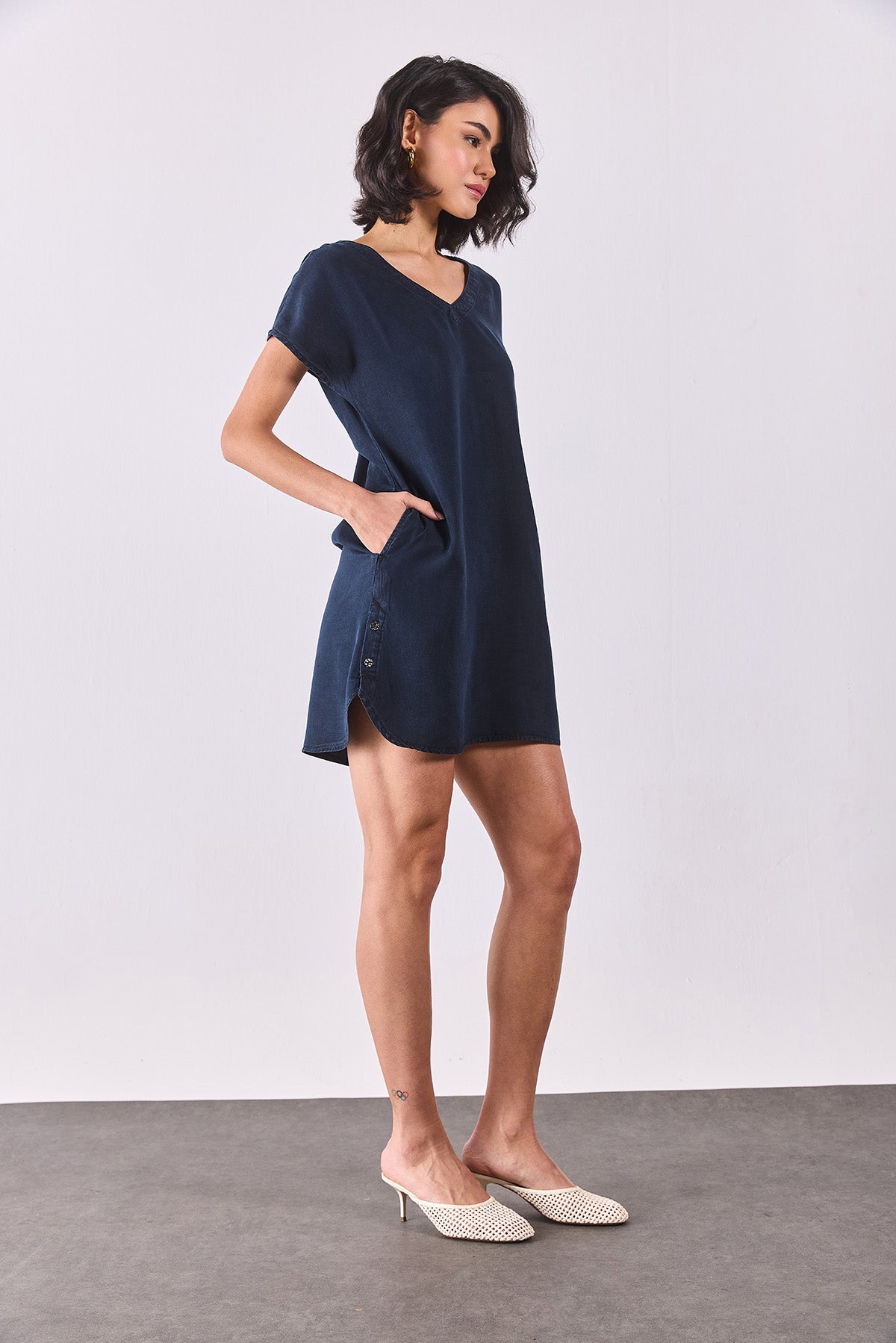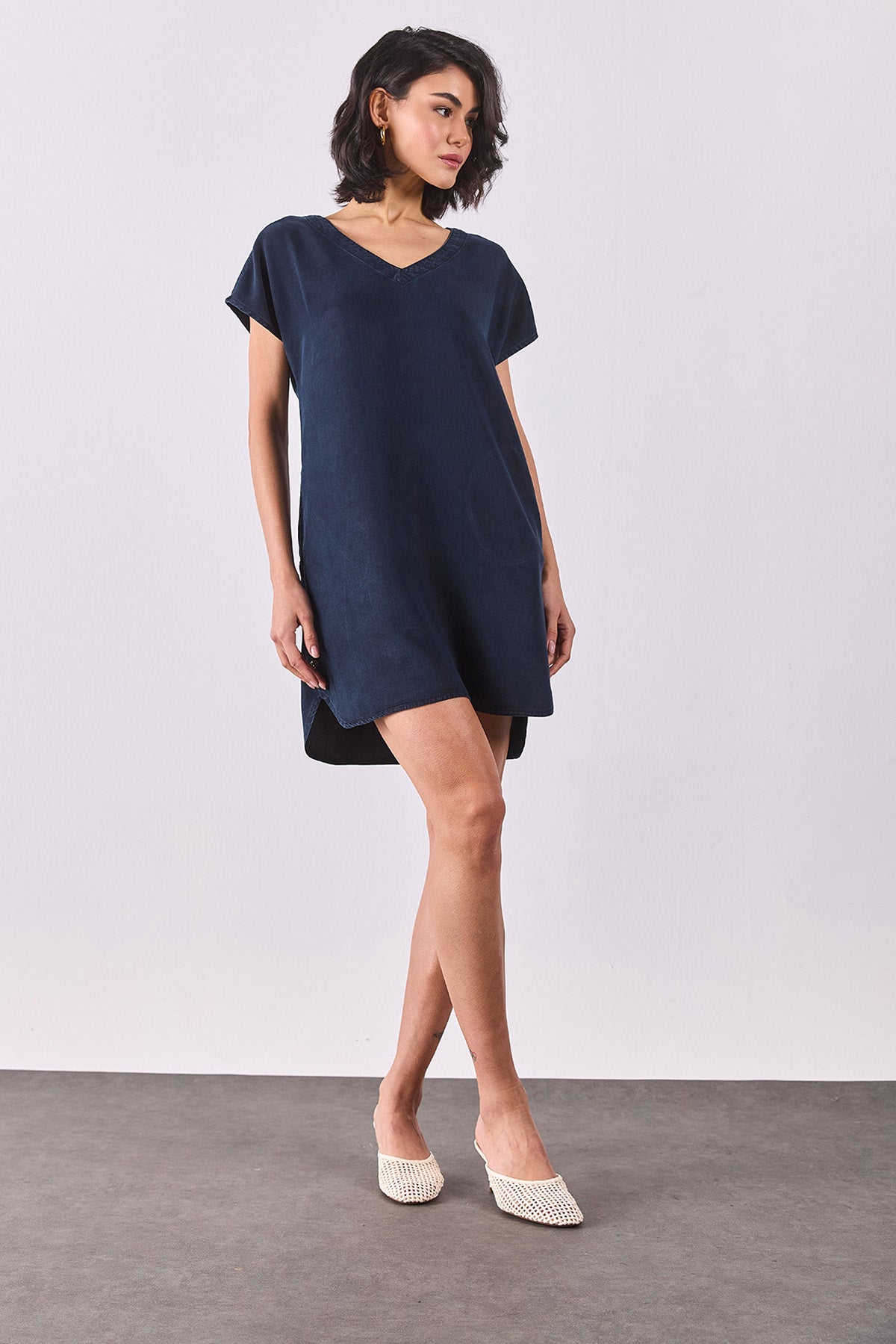 Kadın Helly Blue Black V Yaka Kısa Kollu Jean Elbise %100 Lyocell (Tencel™) - Blue Black