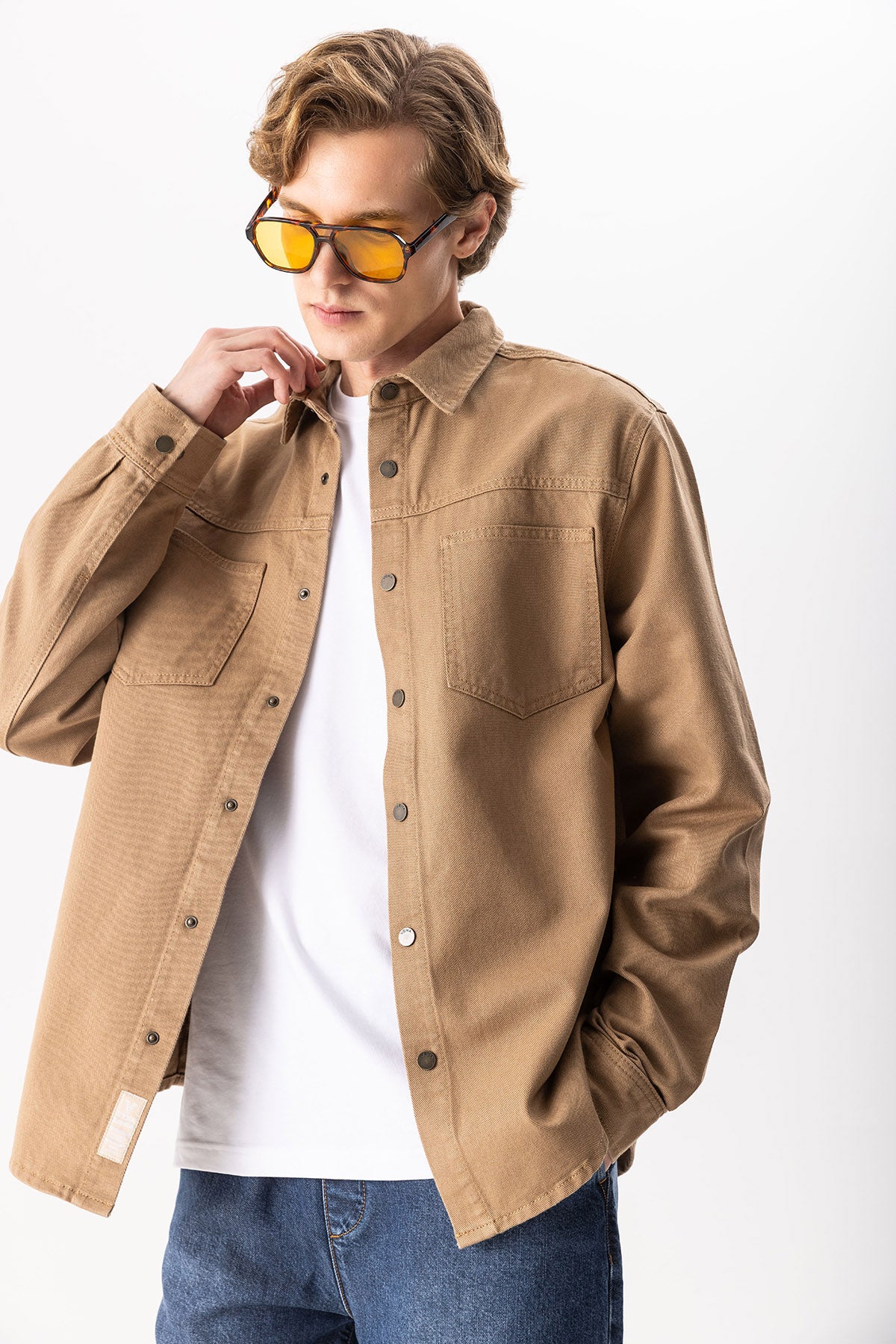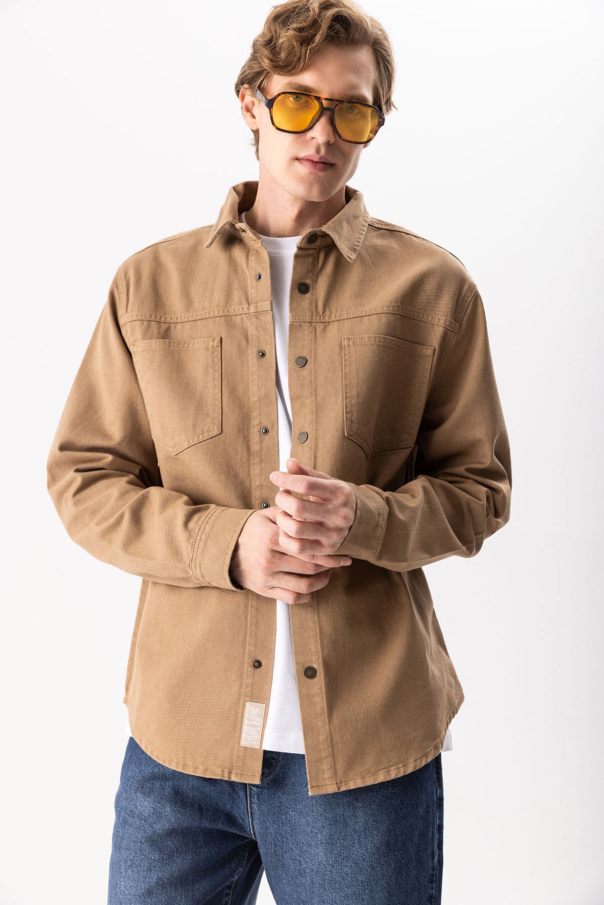 Erkek Jason Renkli Oversize Dış Gömlek %100 Pamuk - Camel