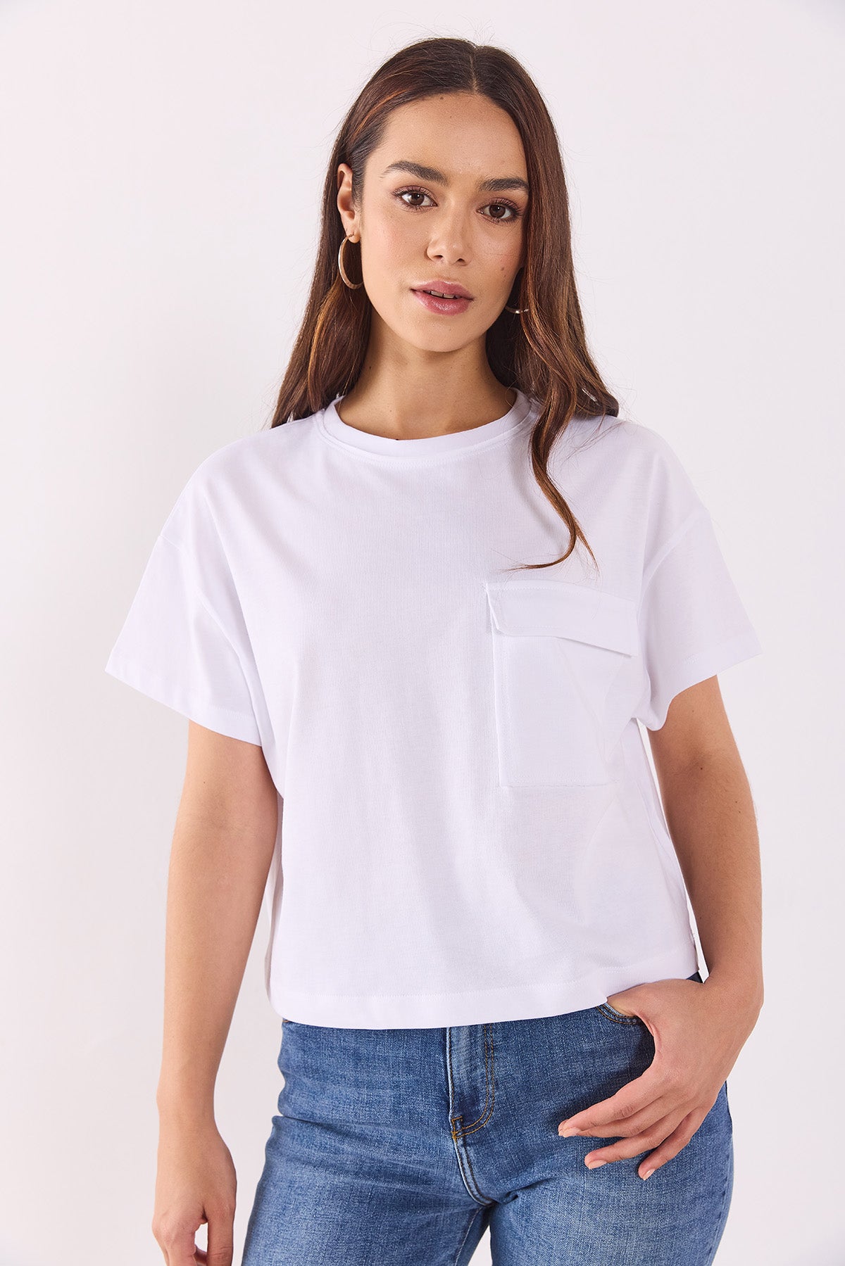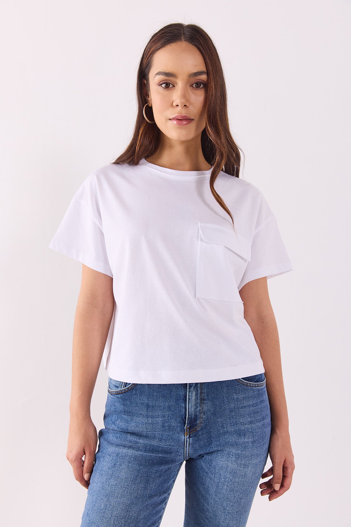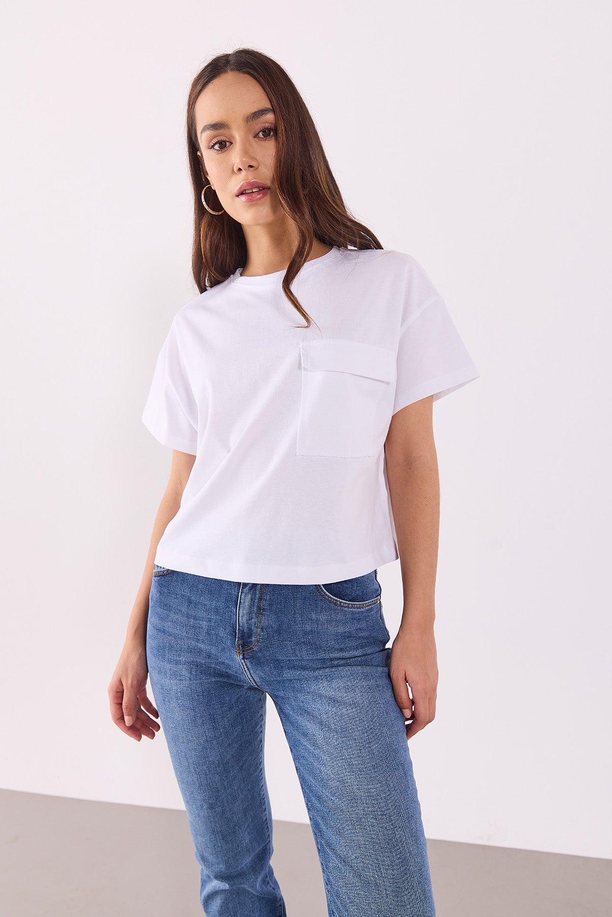 Kadın Jayla Cep Detaylı Bisiklet Yaka Tişört %100 Pamuk - Beyaz