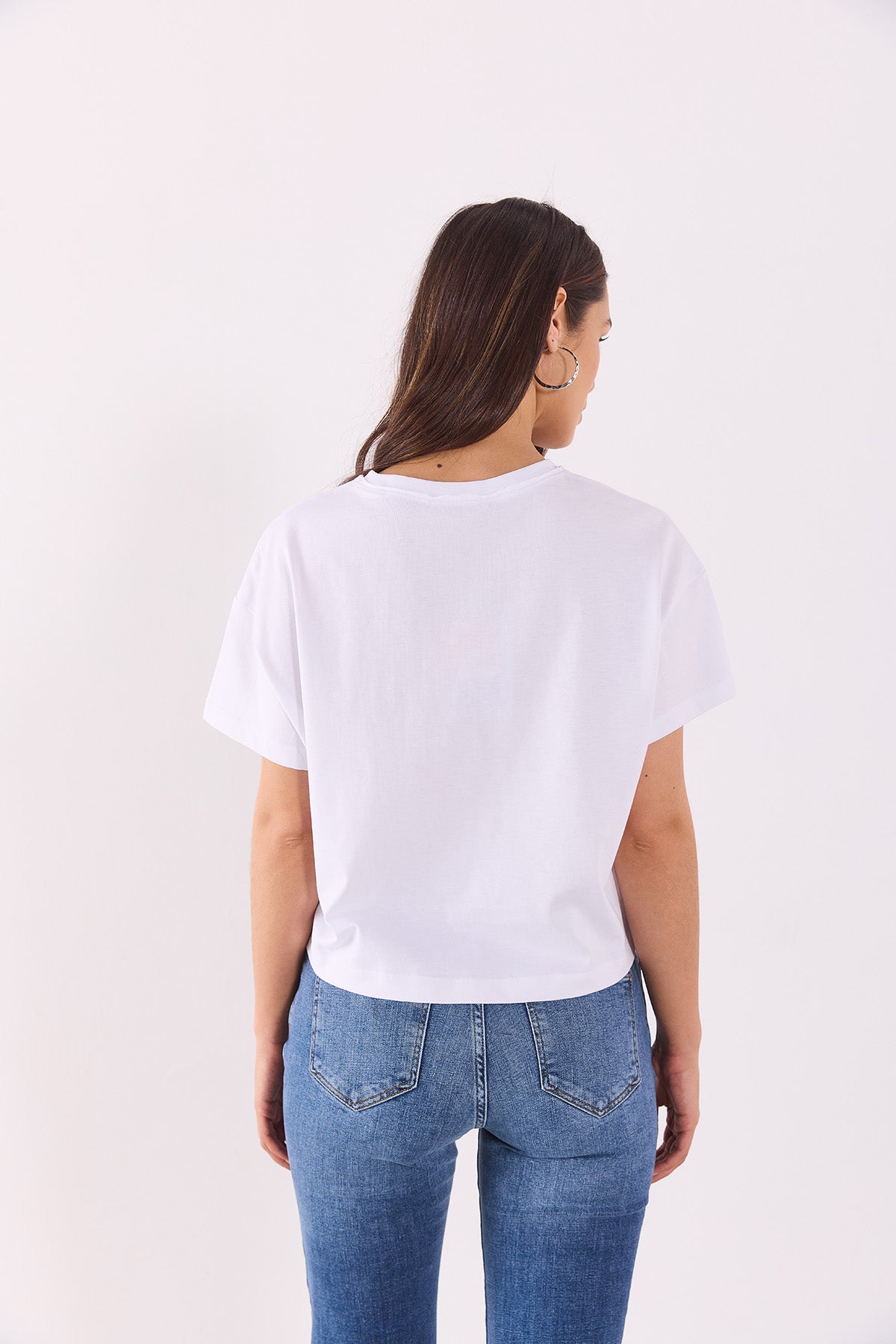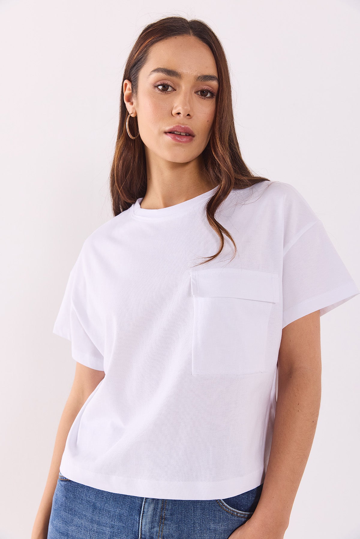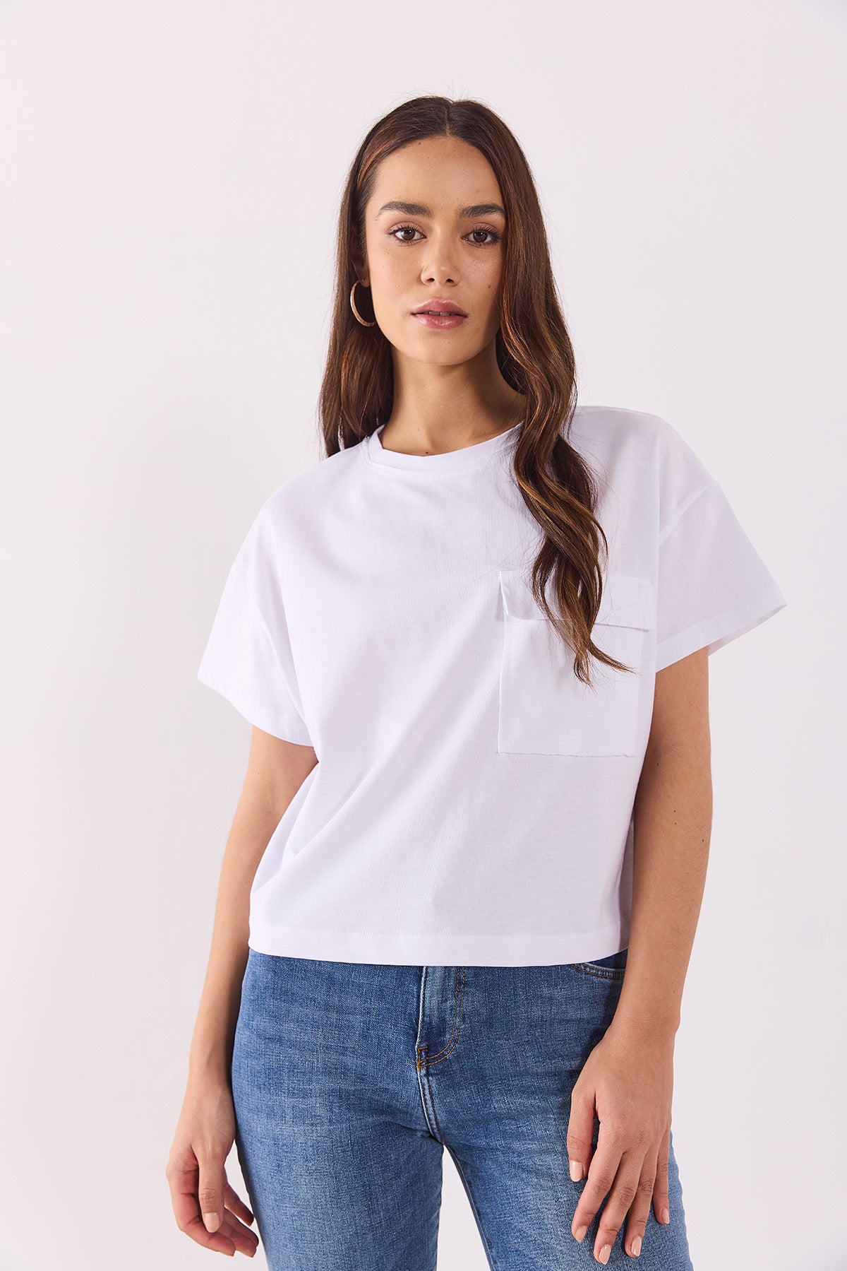 Kadın Jayla Cep Detaylı Bisiklet Yaka Tişört %100 Pamuk - Beyaz