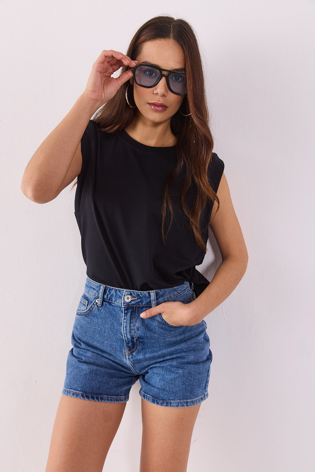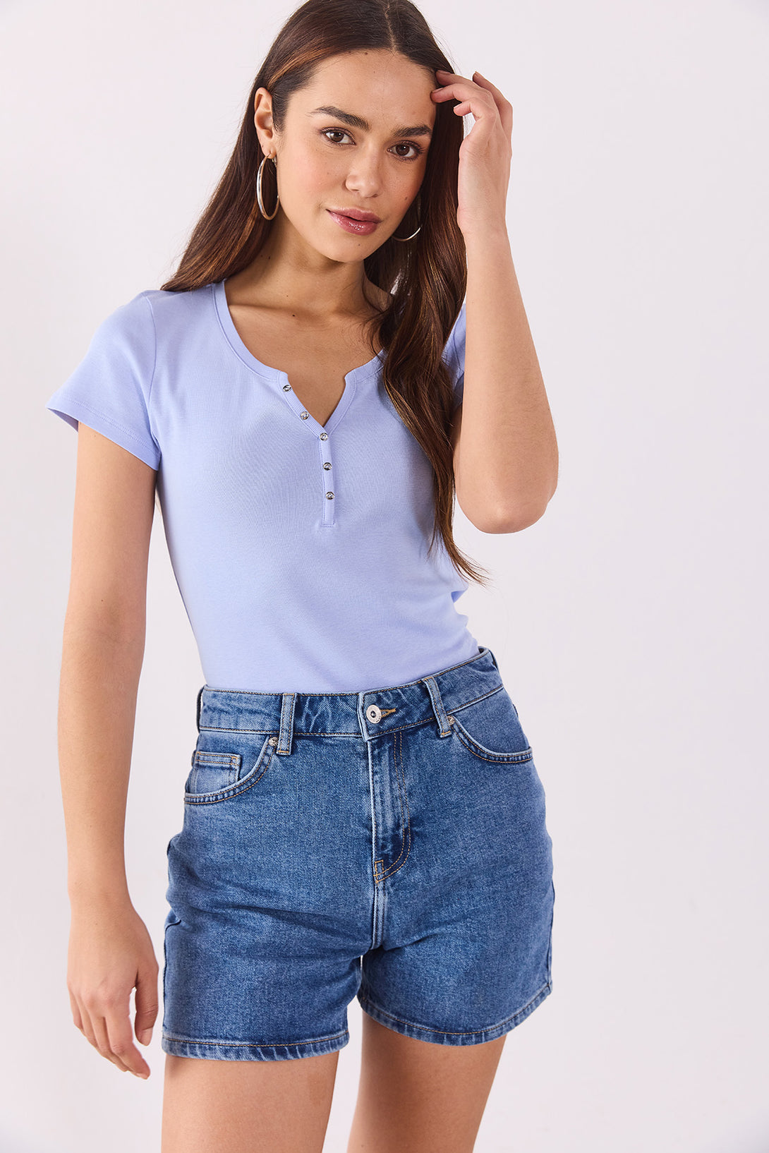 Jolie Bermuda Jean Şortu, %94 pamuk karışımıyla rahat ve esnek kullanım sunar. Koyu mavi rengi ve bermuda kesimiyle sıcak havalar için ideal, şık bir seçenektir.