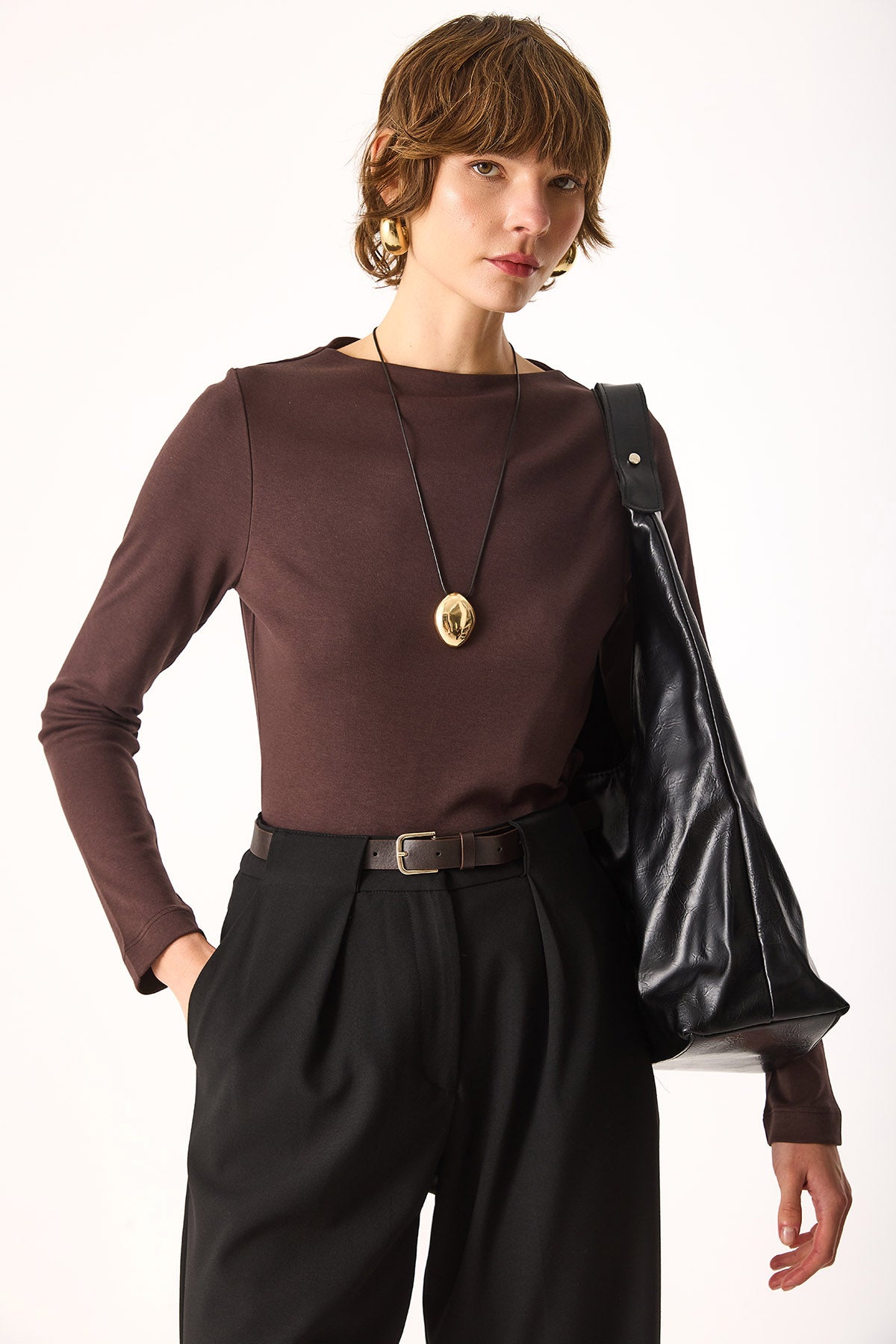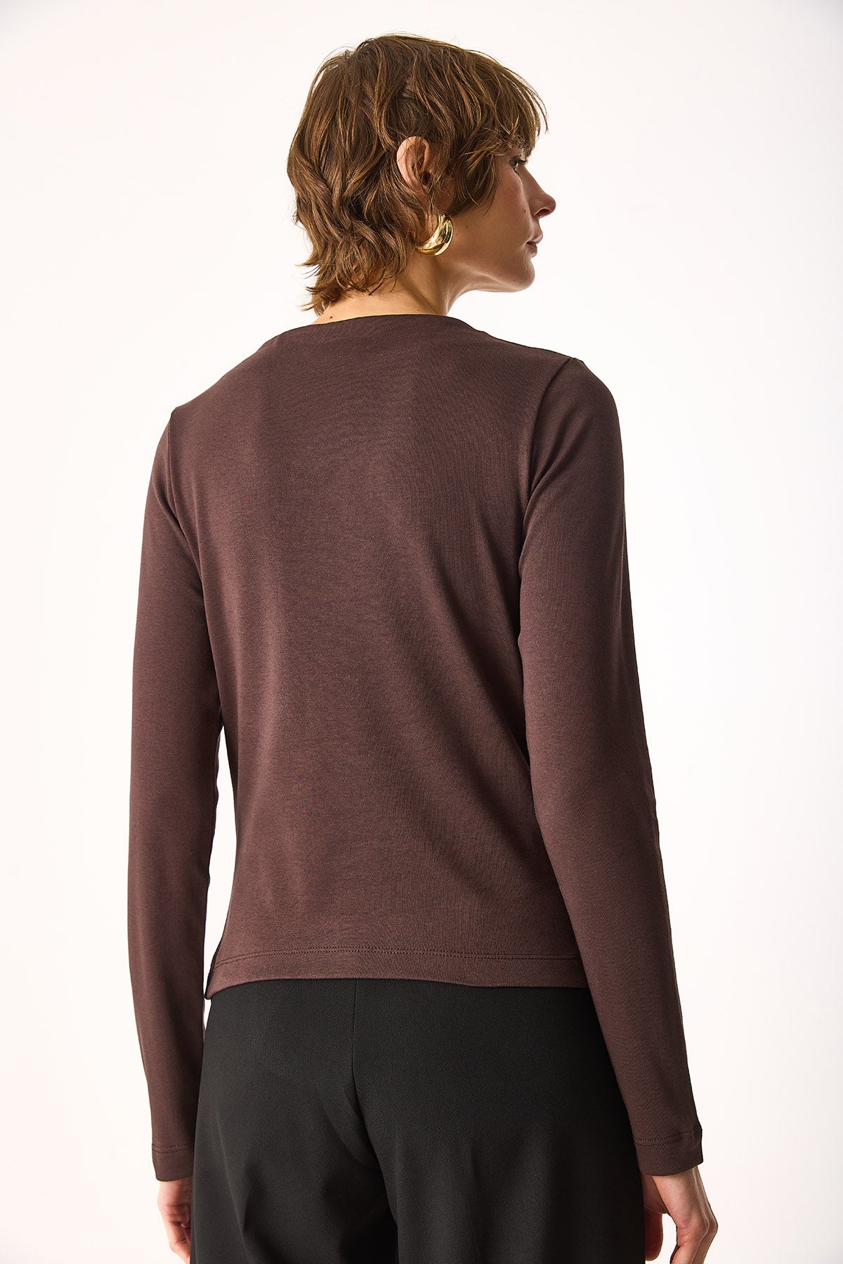 Kadın July Kayık Yaka Tişört %100 Pamuk - Kahverengi
